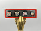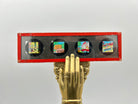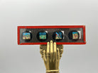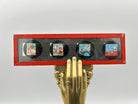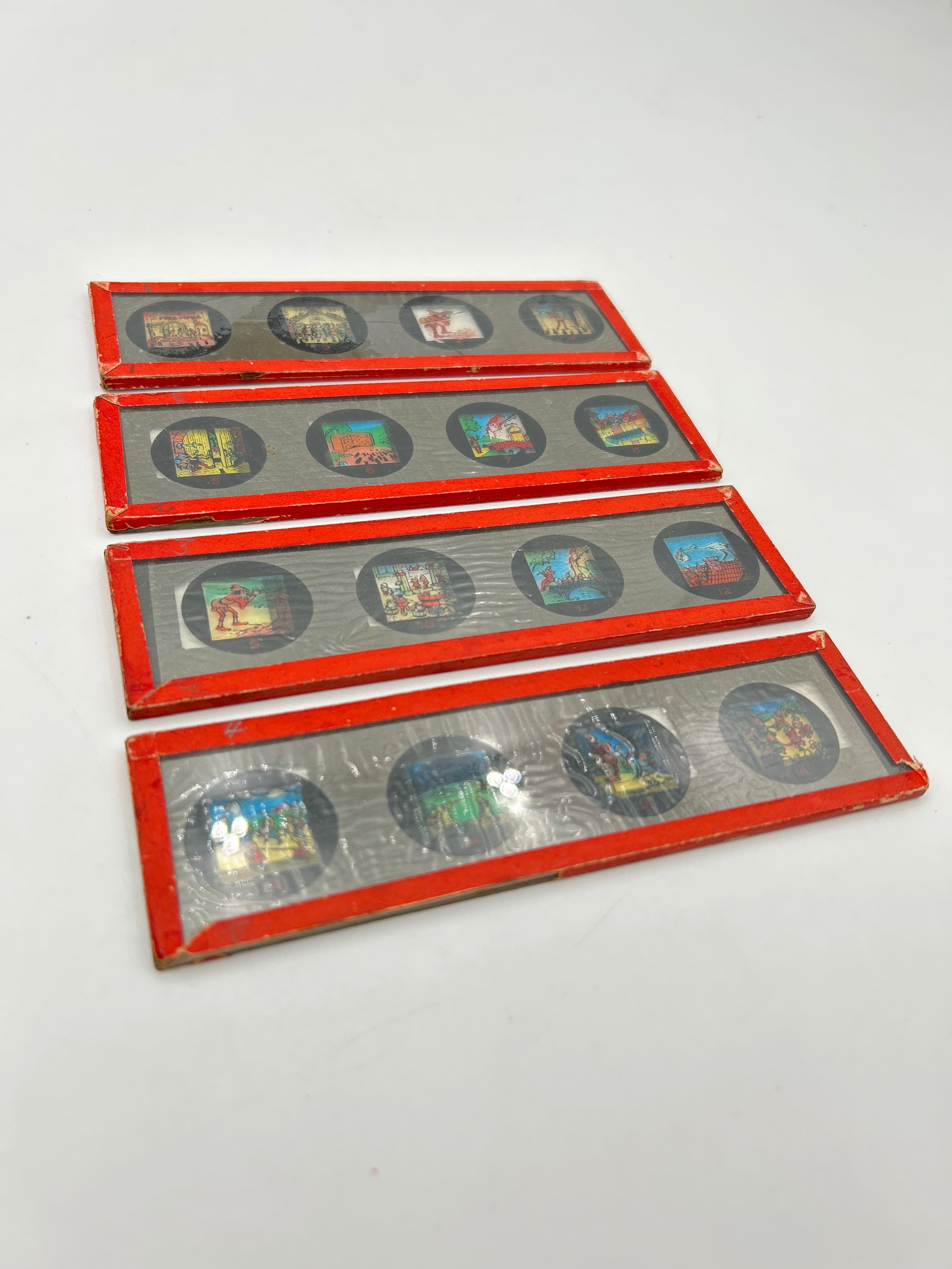 Twenty-four colored slides in four glass slides with red seals around the edges. Each slide is 1 1/2in x 5 1/4in painted in vibrant colors. Original box missing.