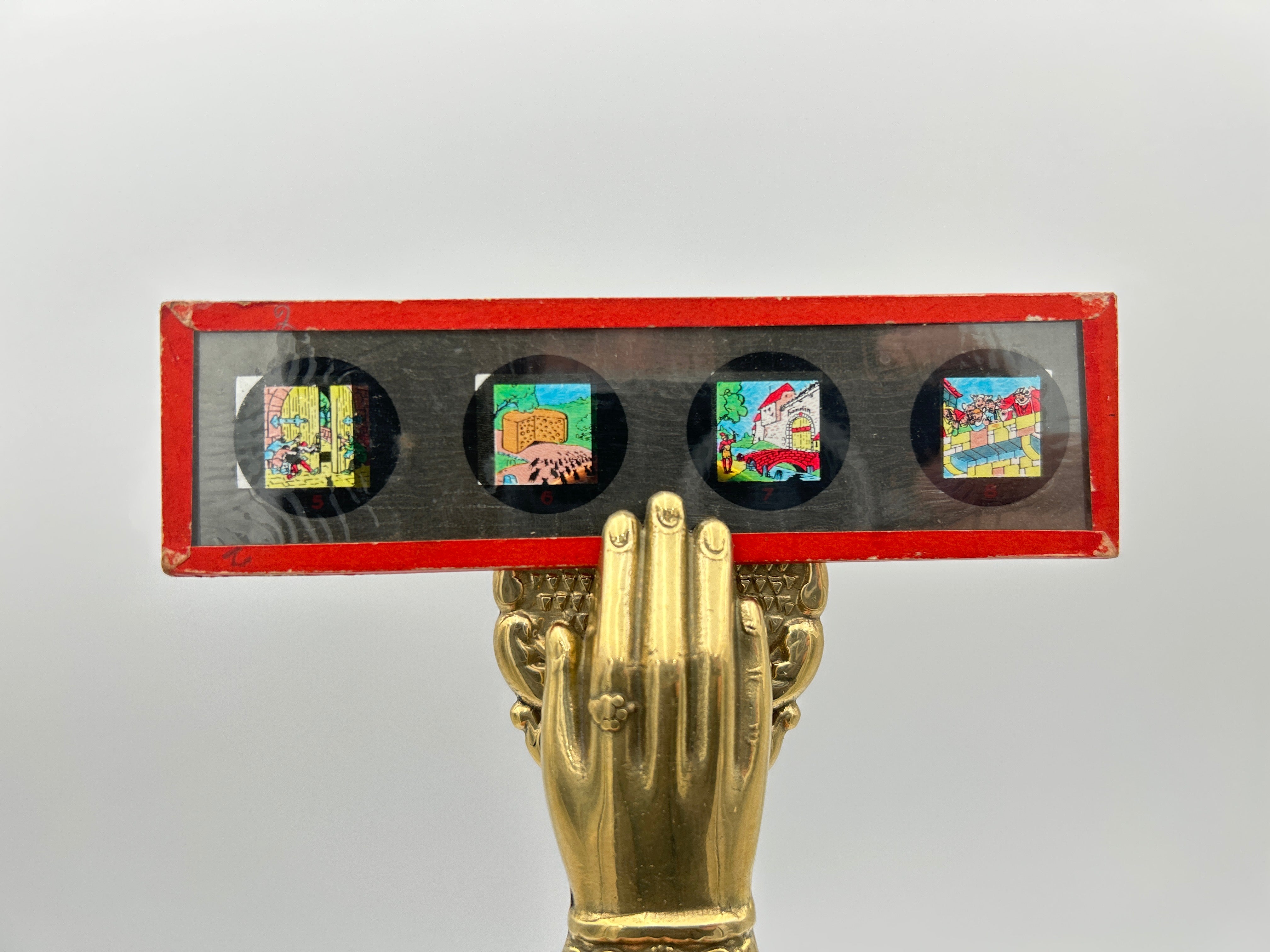 The process of creating these slides involved painting intricate scenes, portraits, or illustrations on the glass surface. Some slides were entirely painted, while others combined photographic images with hand-painted details for a more colorful result. Once completed, the slides were mounted in a frame to fit into a magic lantern, which was typically powered by a candle or oil lamp, later replaced by gas or electric lights. The projector would shine light through the slide, and a lens would enlarge and project the image onto a screen or wall.