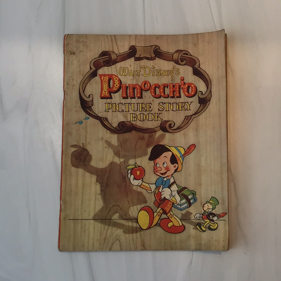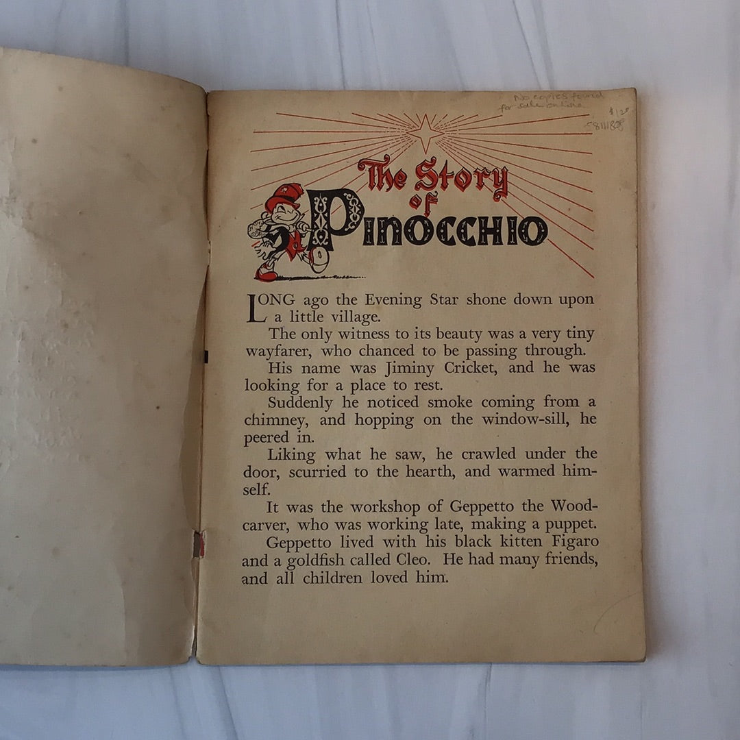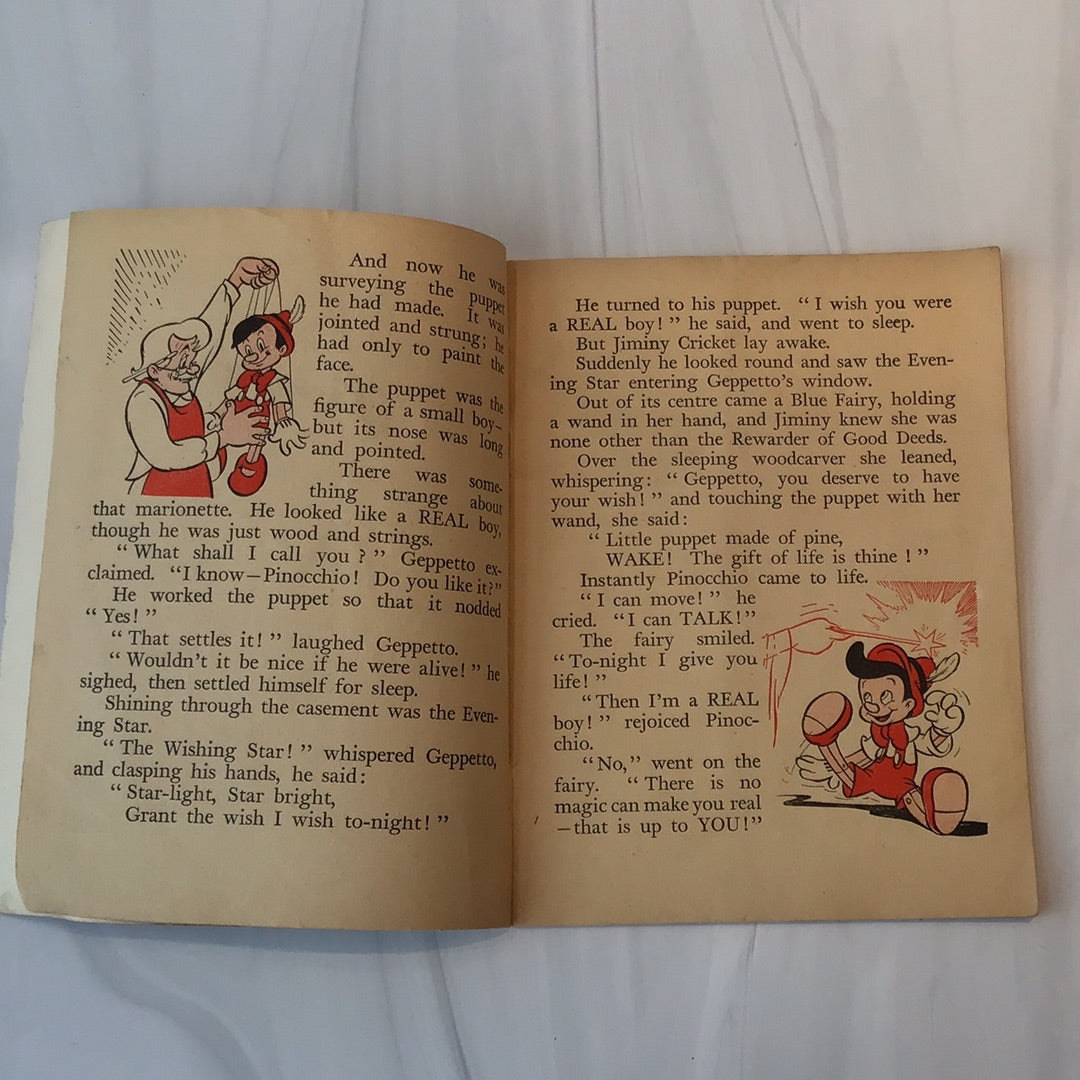 Illustrated paper cover with Pinocchio and Jiminy Cricket, clear jacket cover.