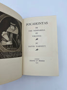Maroon and black patterned boards with gilt gold lettering on spine. Red top, decked bottom, and original illustrated dust jacket. A few quarter inch tears along bottom of the dust jacket and slightly longer one along the top right corner. Spine of dust jacket is yellowed from time. Woodcut design letters at the start of each chapter and portrait of Pocahontas on the title page. Map included at the rear. Interior in excellent condition, wonderful condition overall.