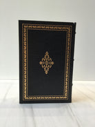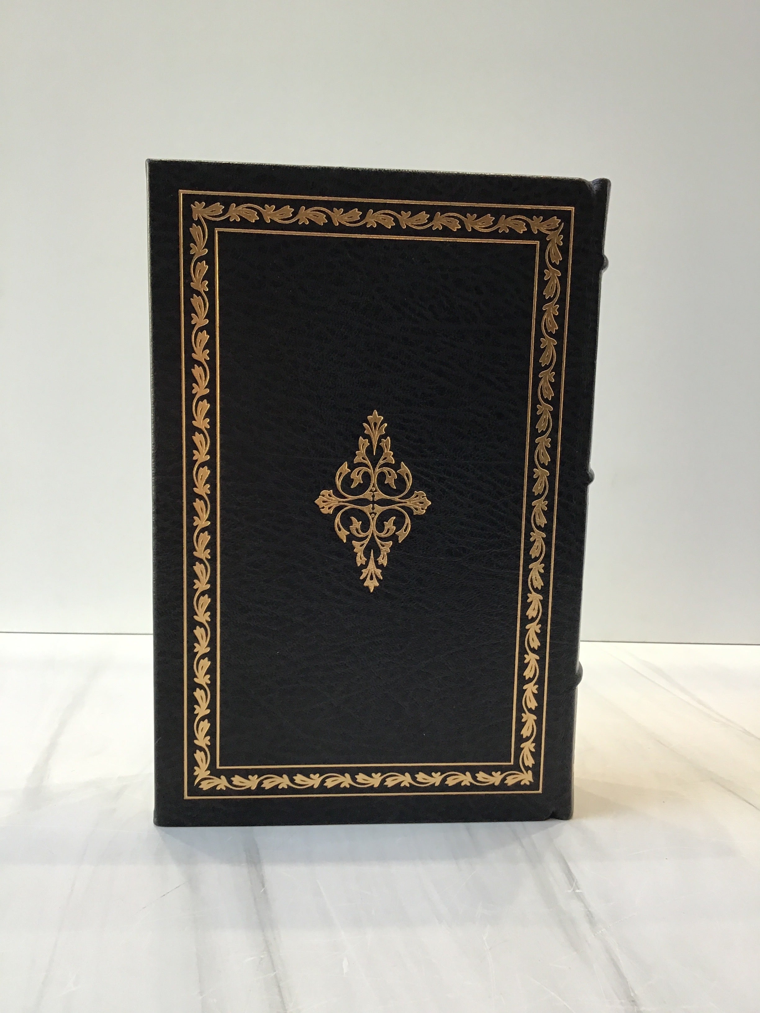 Black leather bound edition with gold embossed detailing on spine, front, and back cover as well as gold embossed lettering on the spine. Gold fore edge with rust silk bookmark and three raised bands. Pristine Franklin Library Edition.