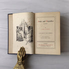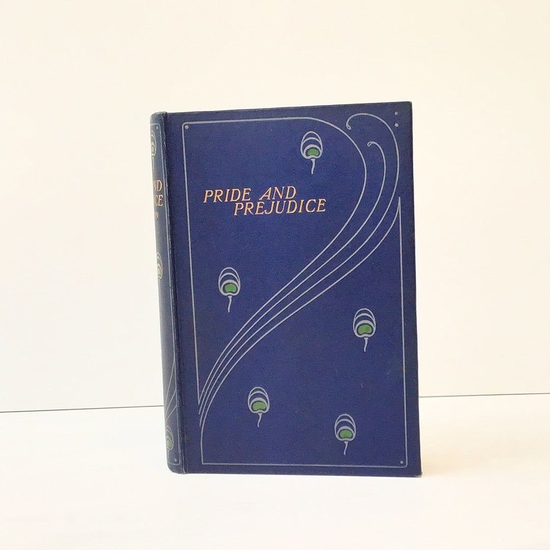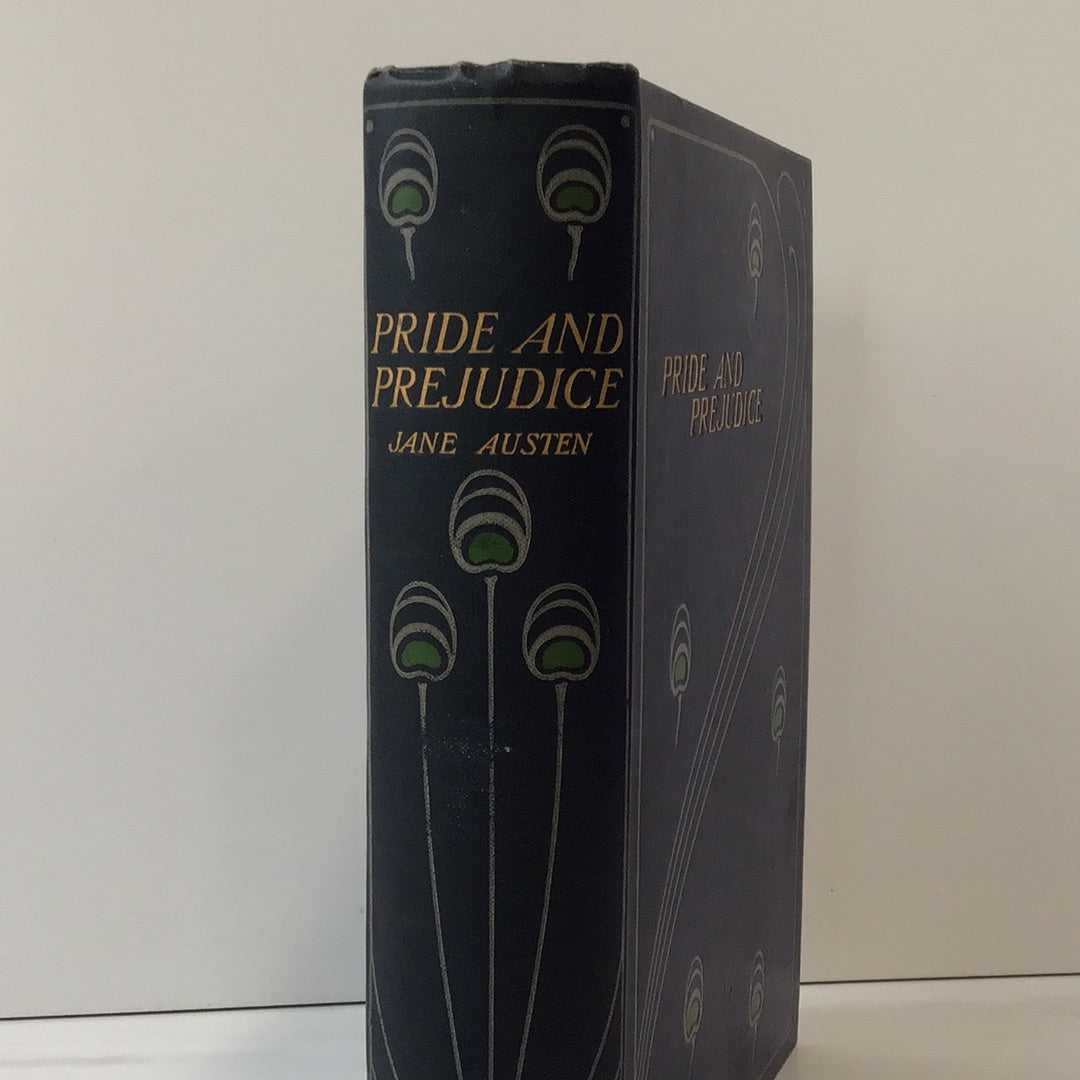 Blue cloth cover with peacock feather design on front and spine, gold lettering, rubbed edges at top and bottom of spine.