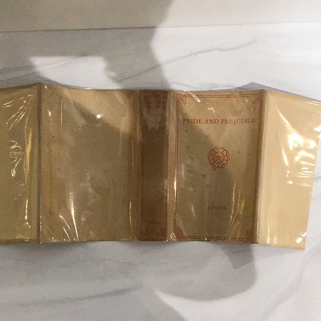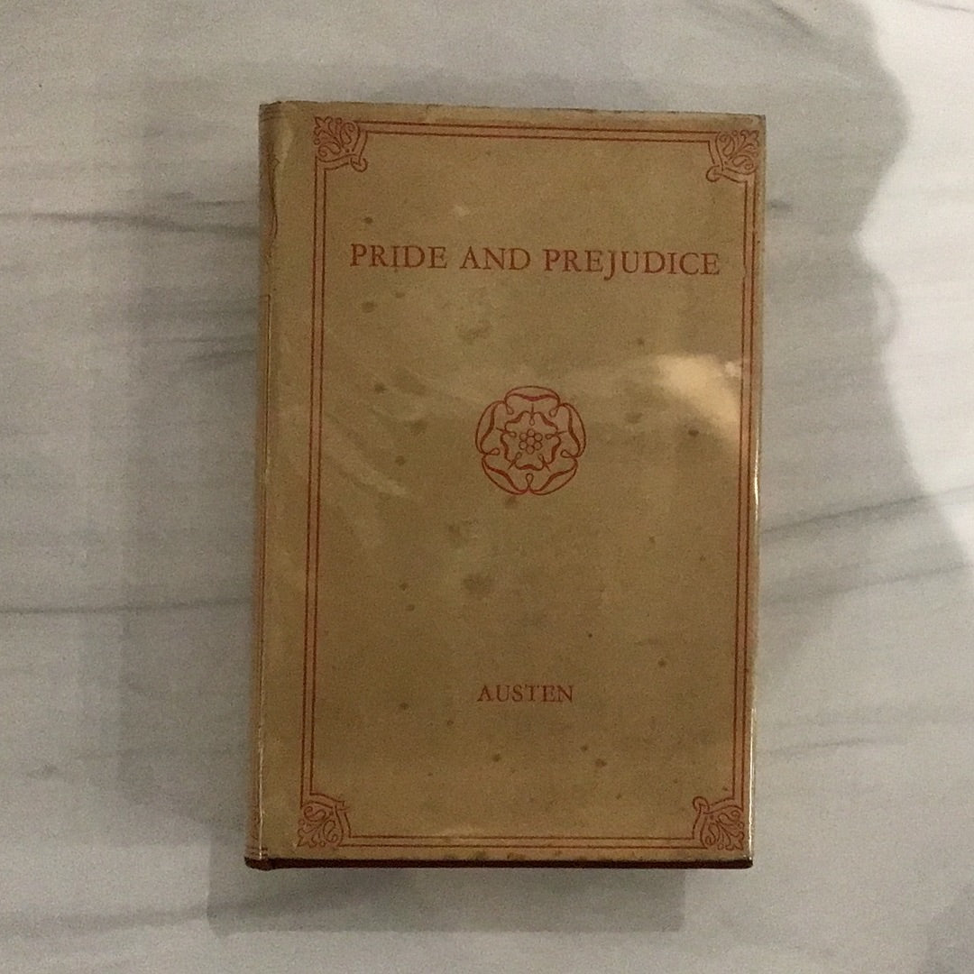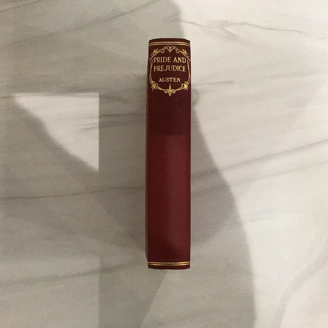 Lovely edition of Jane Austen's classic Pride and Prejudice, red binding with gold tooling on spine, debossing on front cover, original jacket cover, very good condition.
