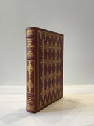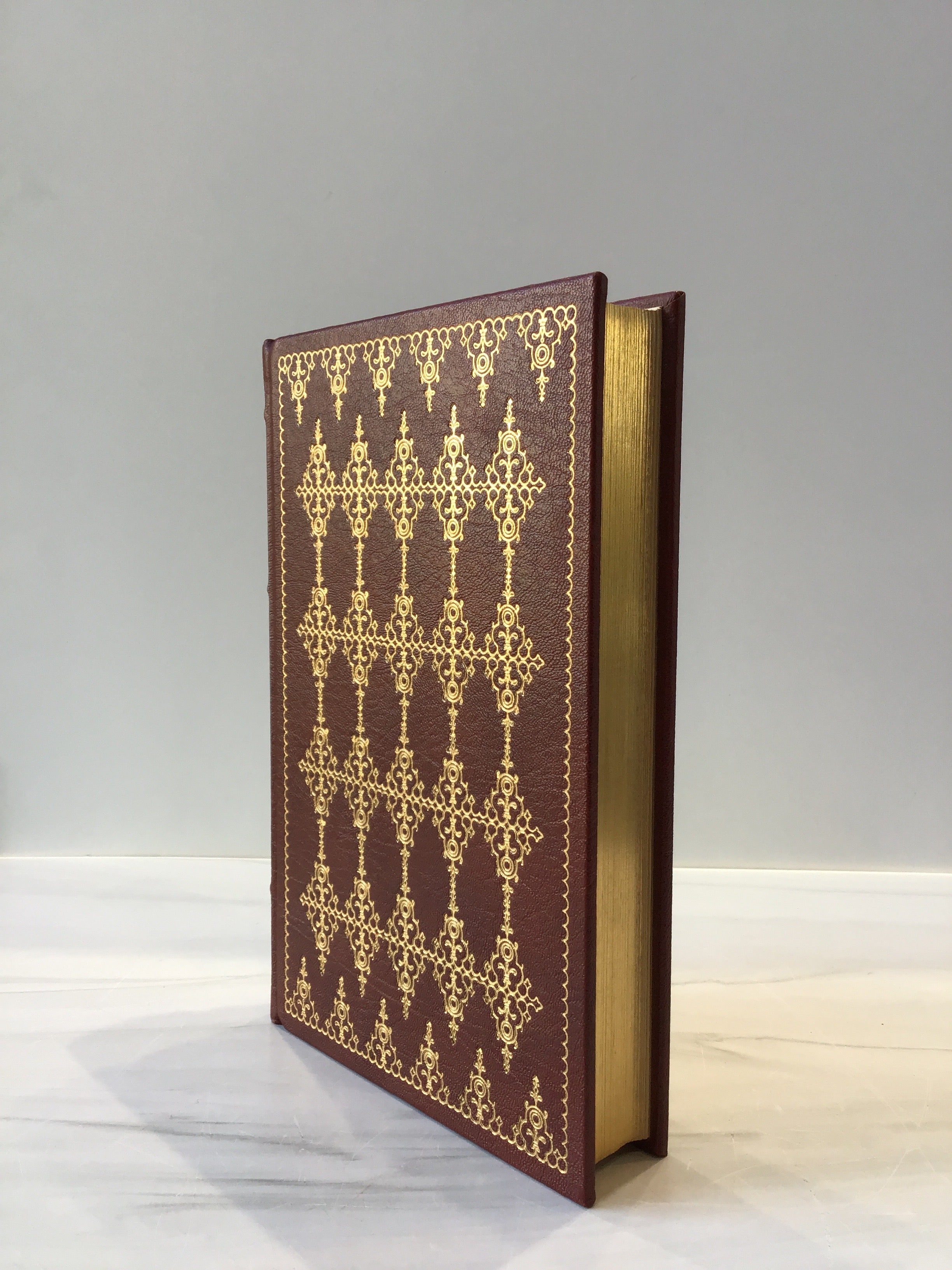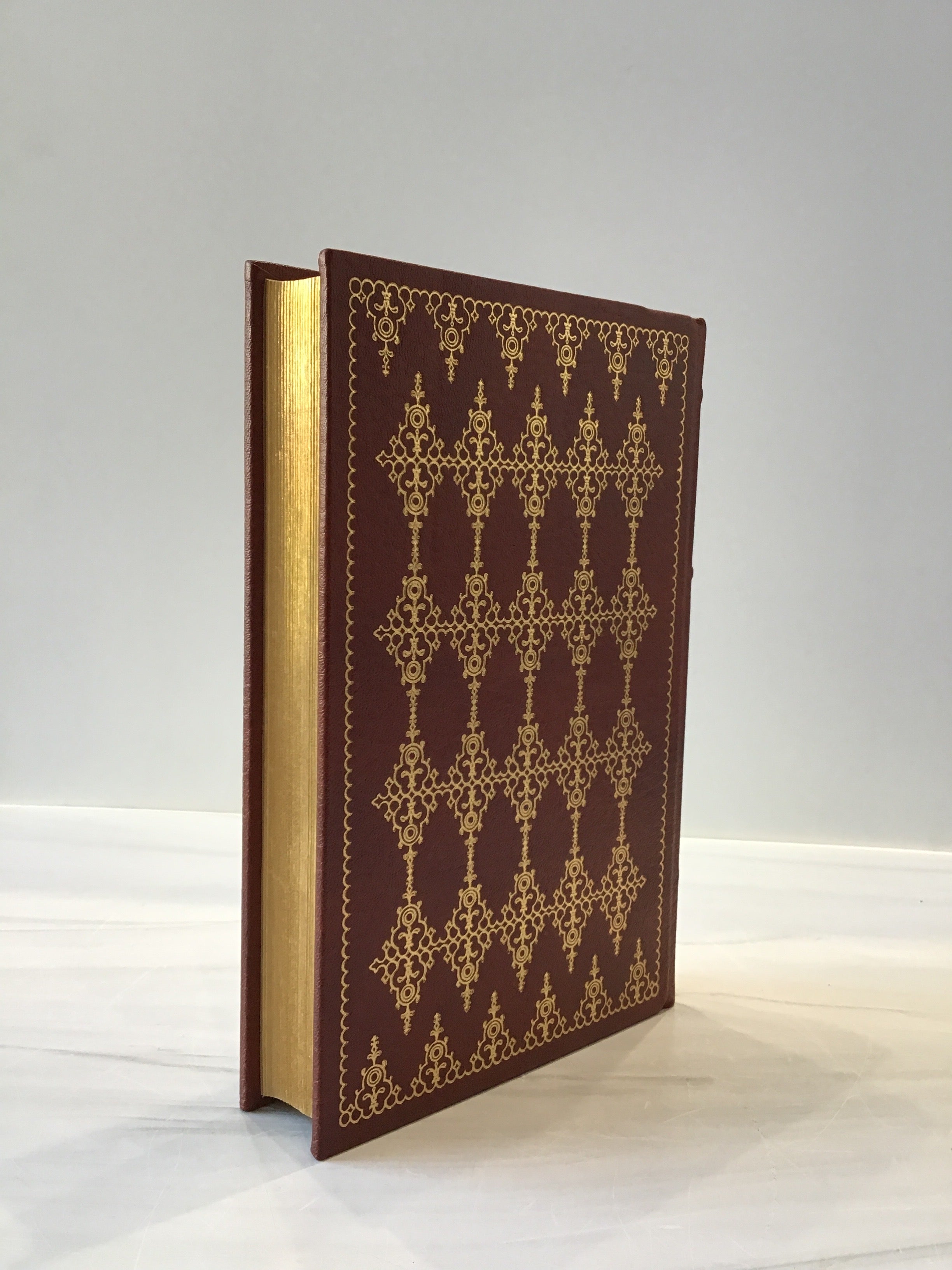 Franklin Library rust red leather hardback edition with three raised bands, gold fore edge, gold embossed design on front cover and spine, blush pink satin bookmark, and is in pristine condition.