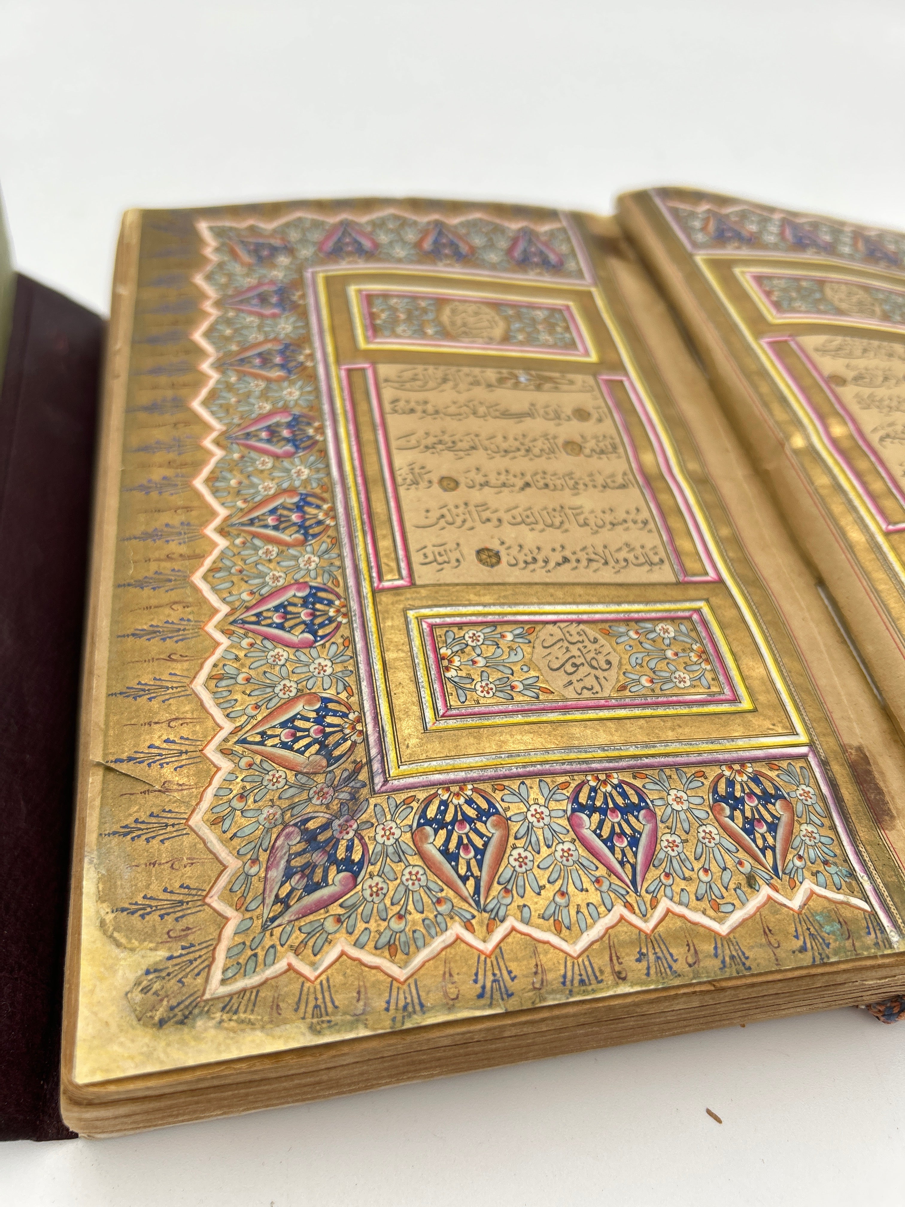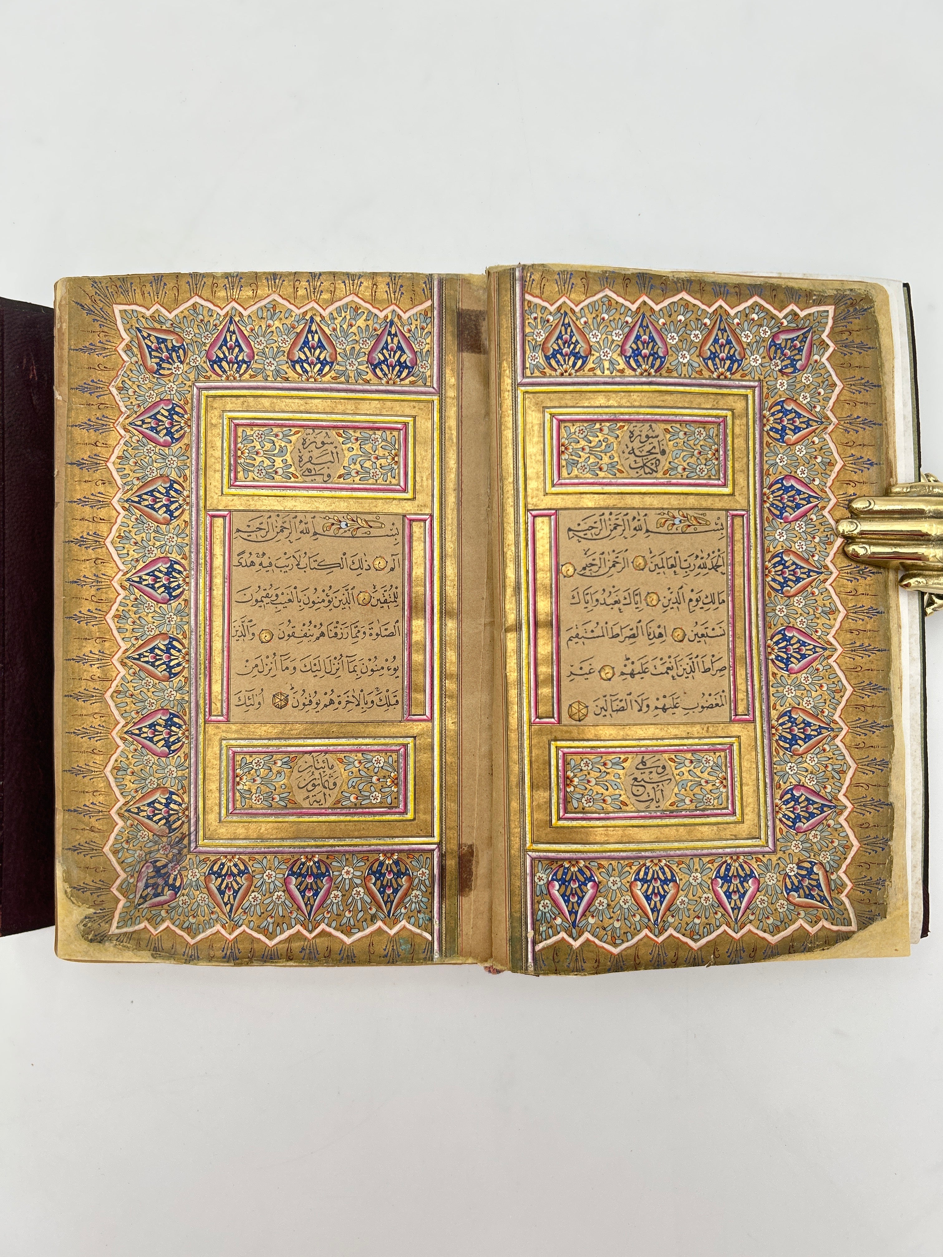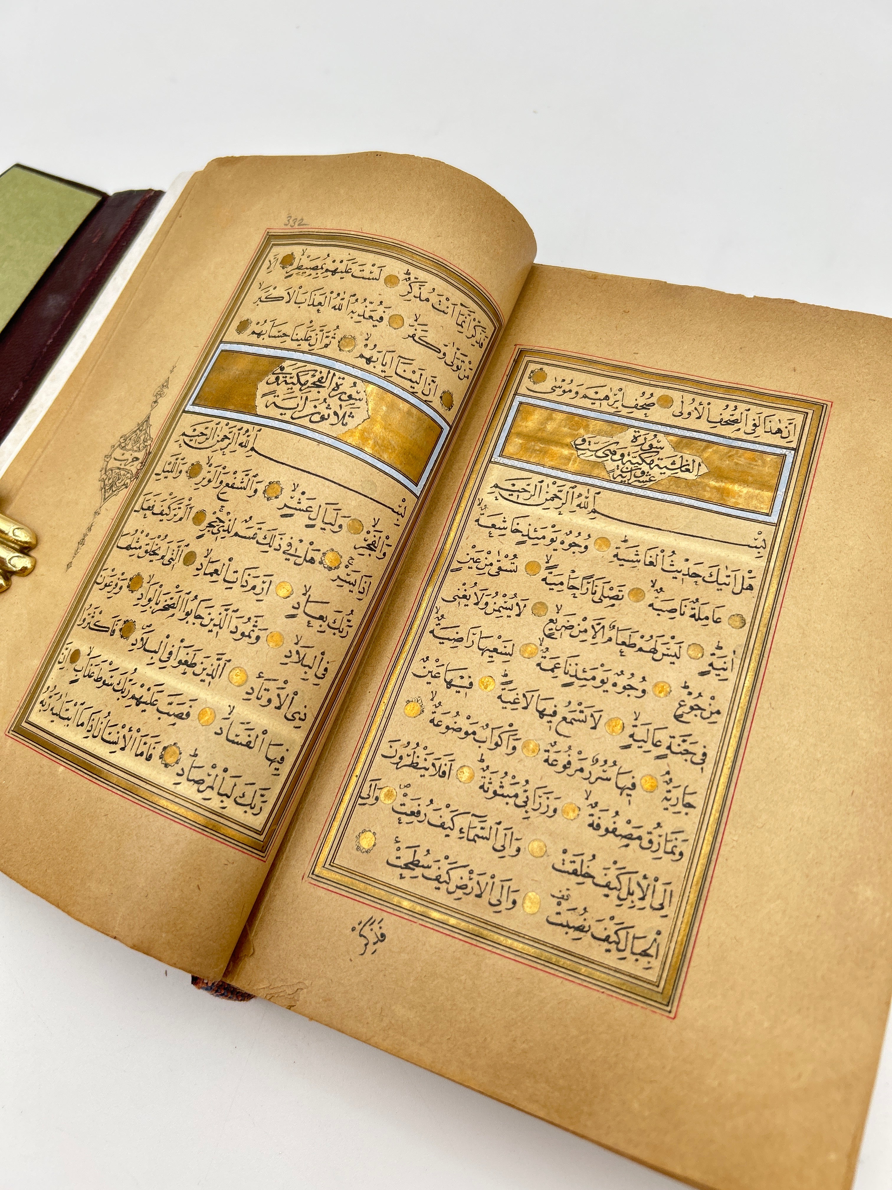 Brown leather with beautiful illuminated pages throughout, some swelling that prohibits the enclosure to fasten, intact, green end papers, good condition.