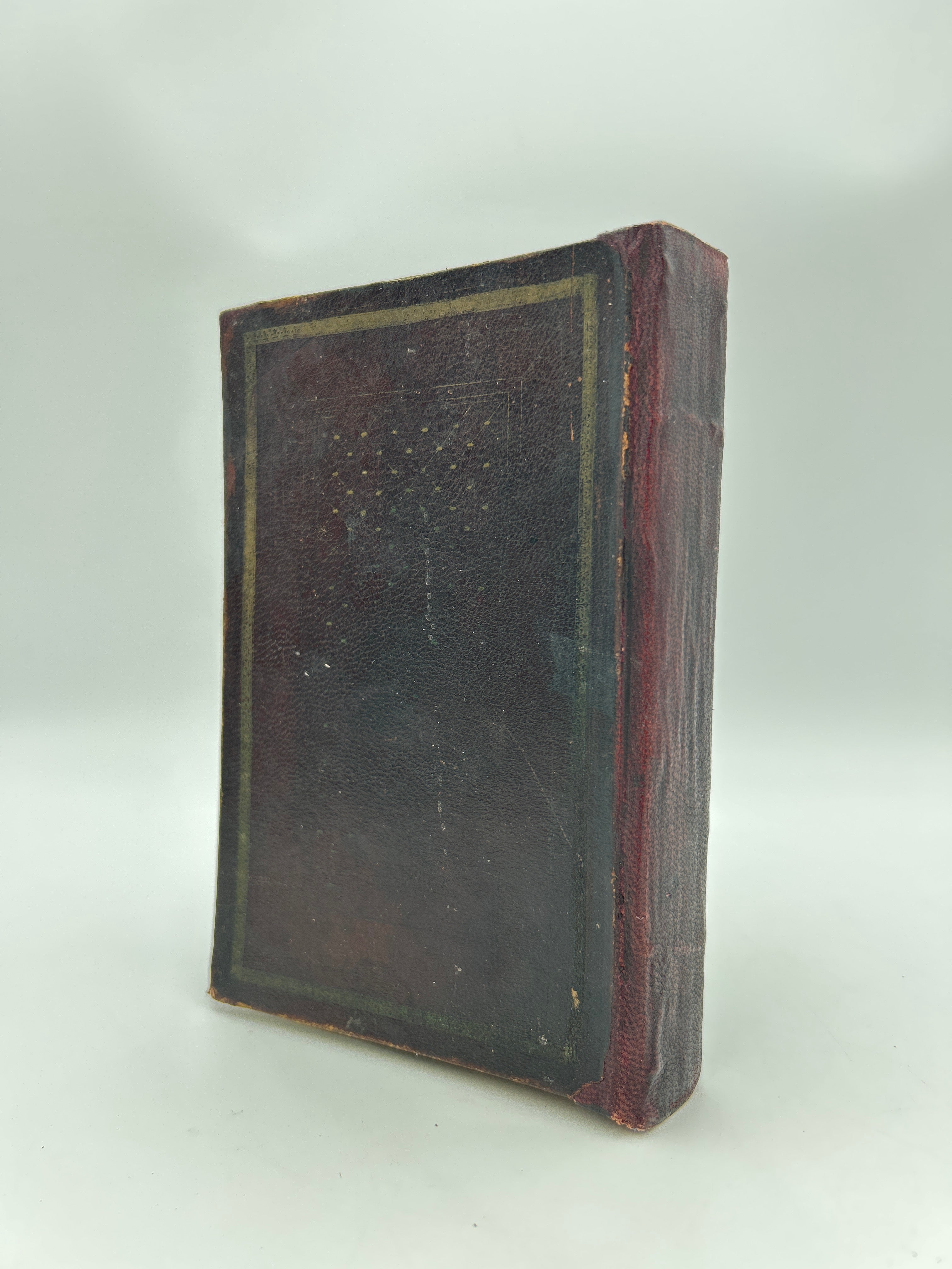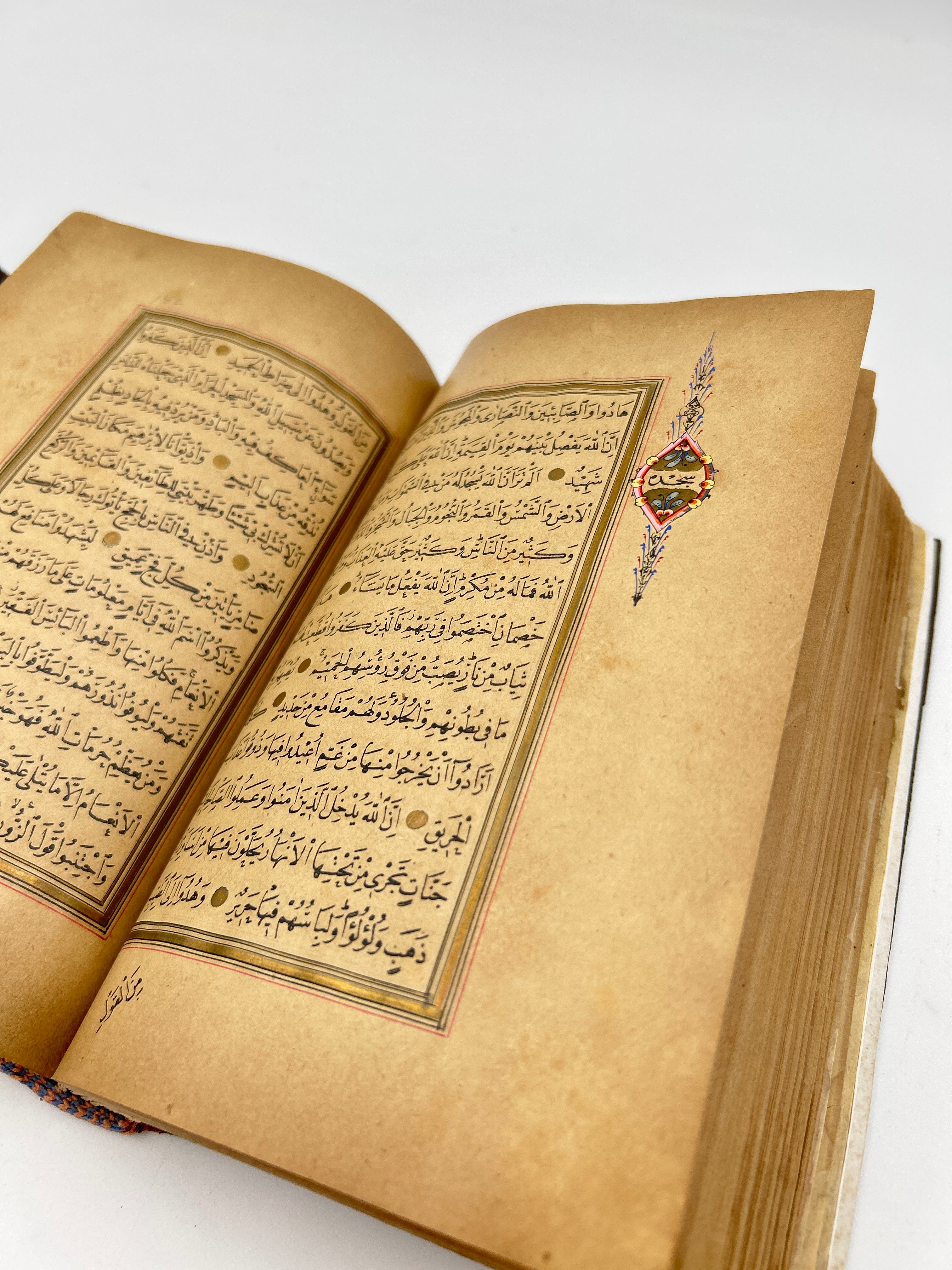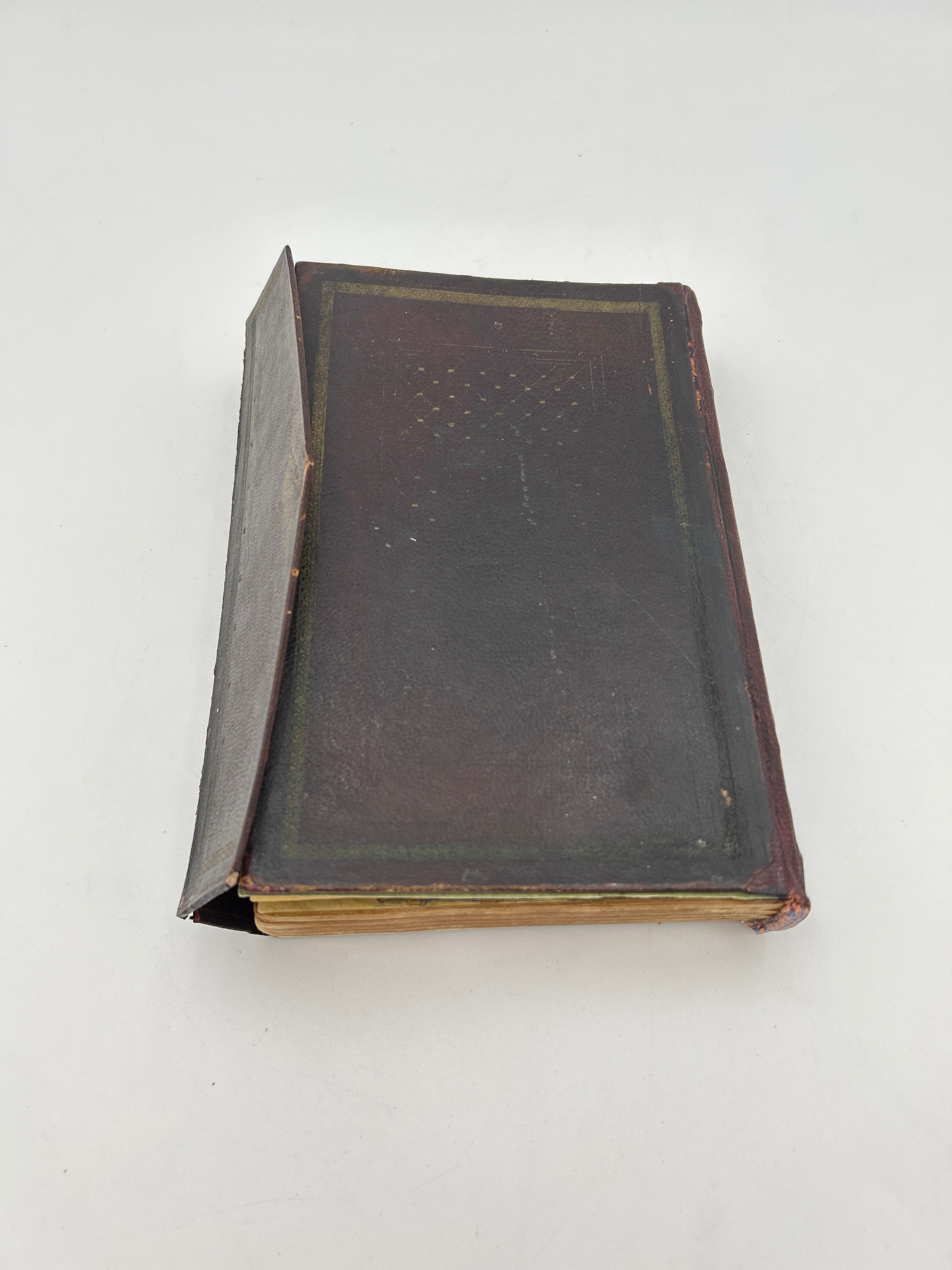 Brown leather with beautiful illuminated pages throughout, some swelling that prohibits the enclosure to fasten, intact, green end papers, good condition.