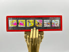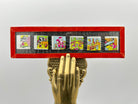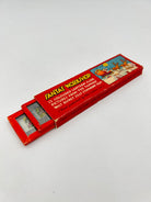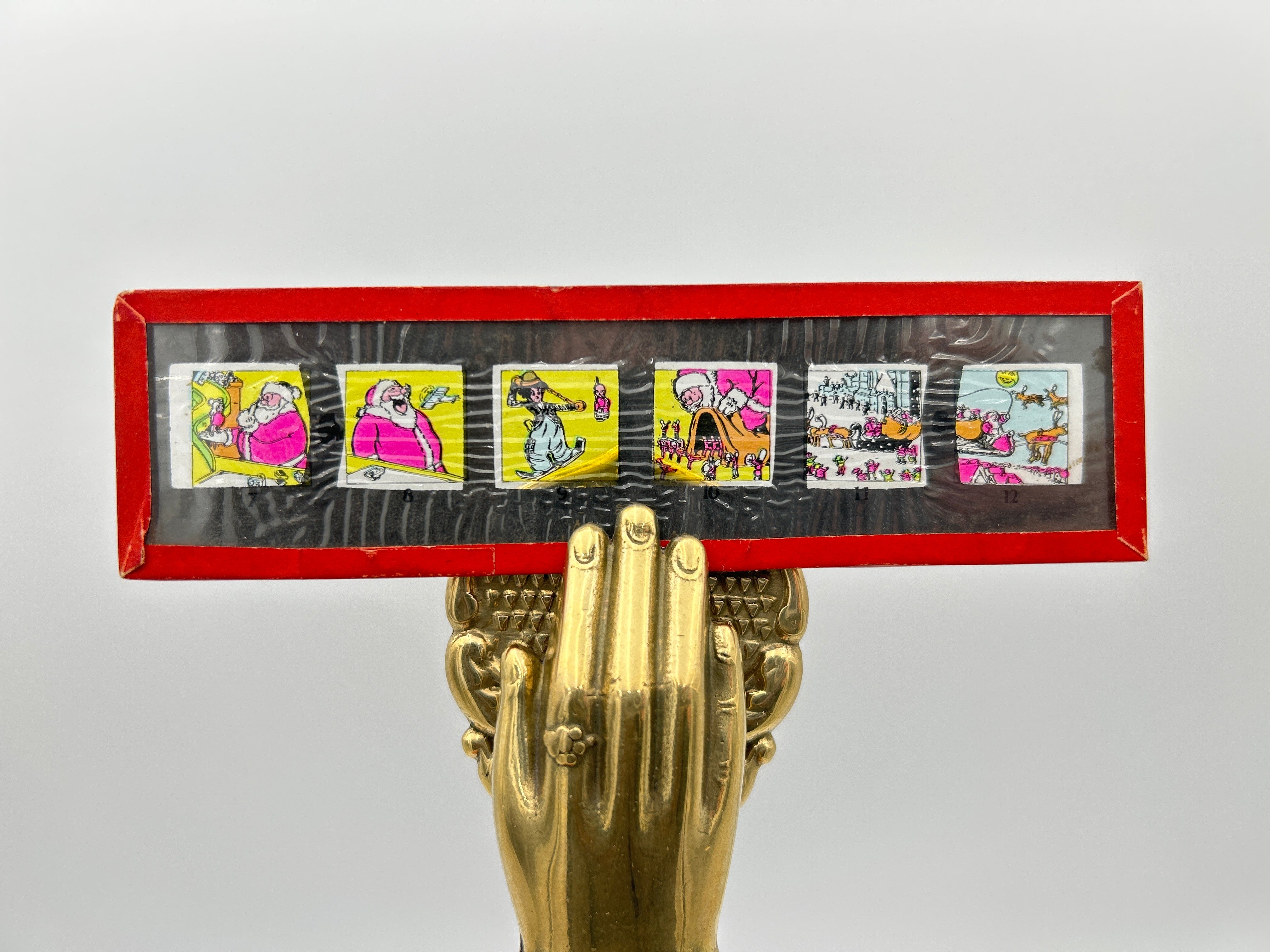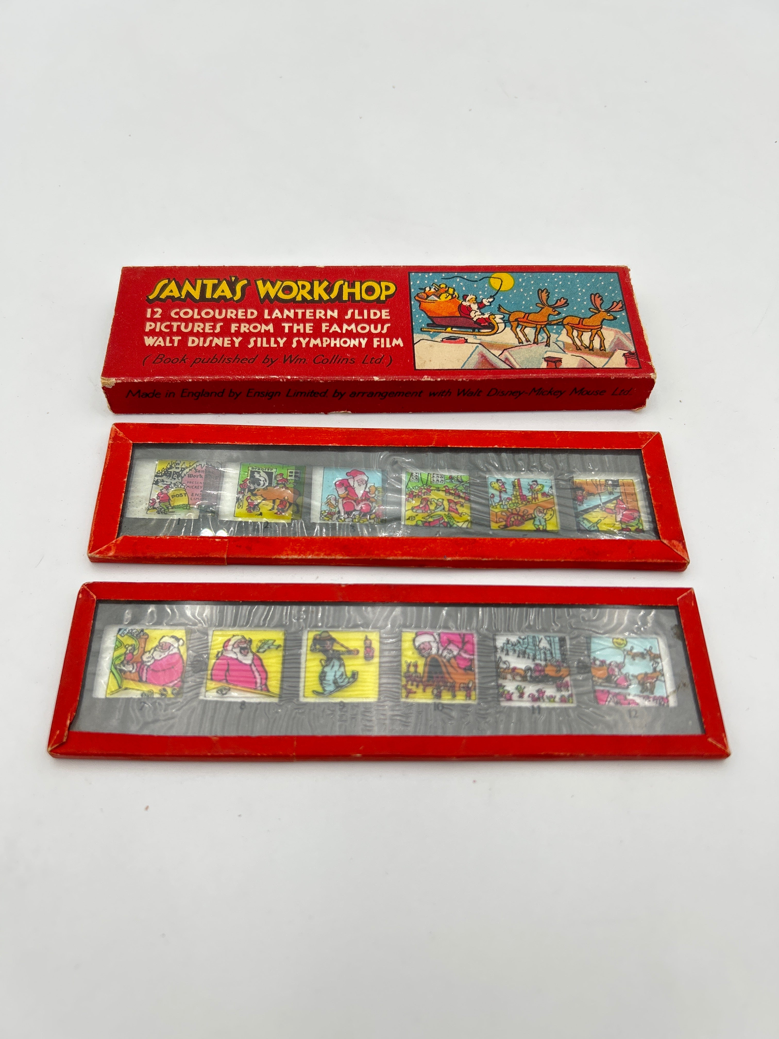 Twelve colored slides in two glass slides with red cloth seal around the edges. Each slide is 1 1/2in x 5 1/4in painted in vibrant colors. Comes in original vintage pictorial box with original slide dialogue pages. Fully intact.