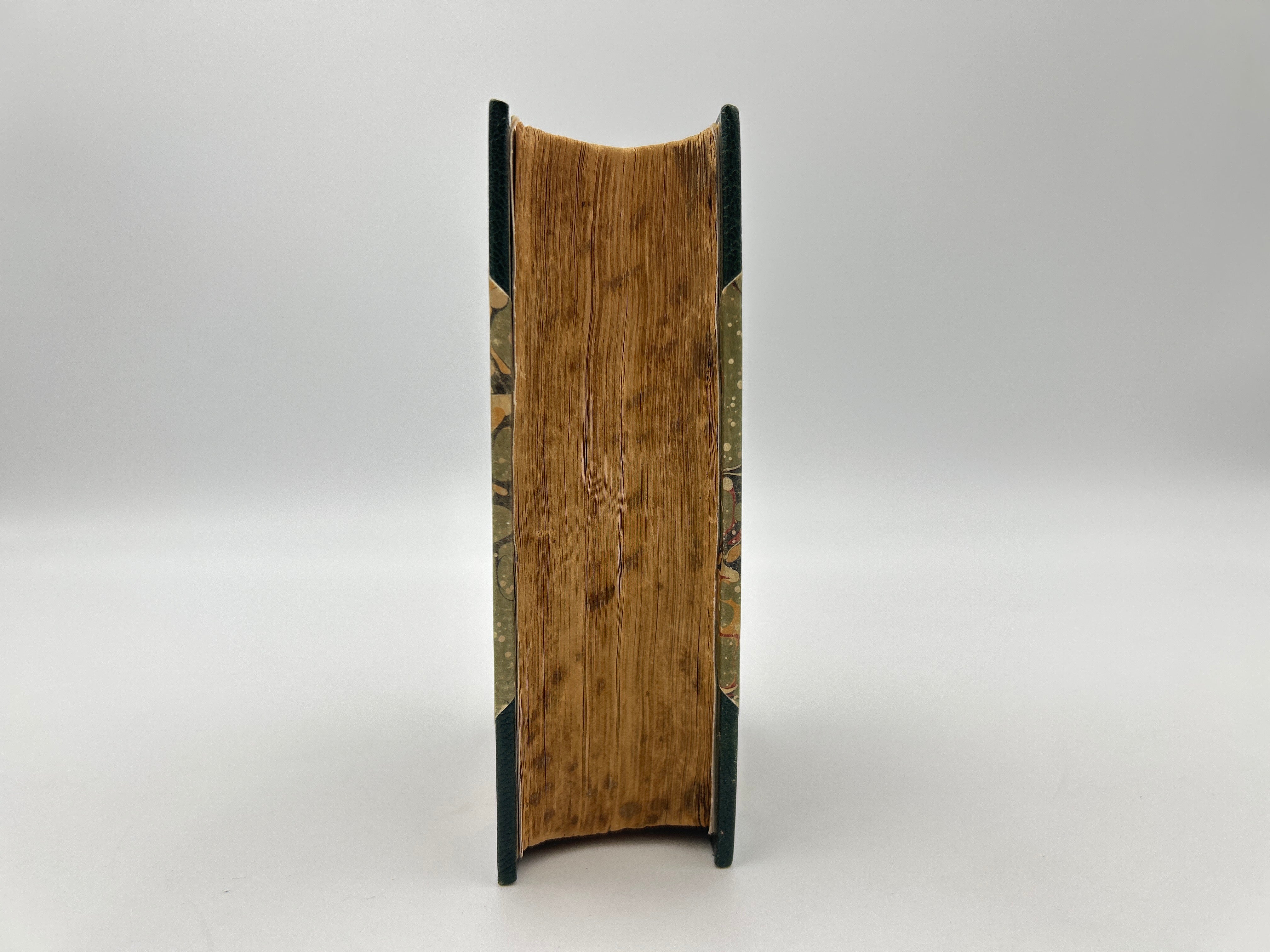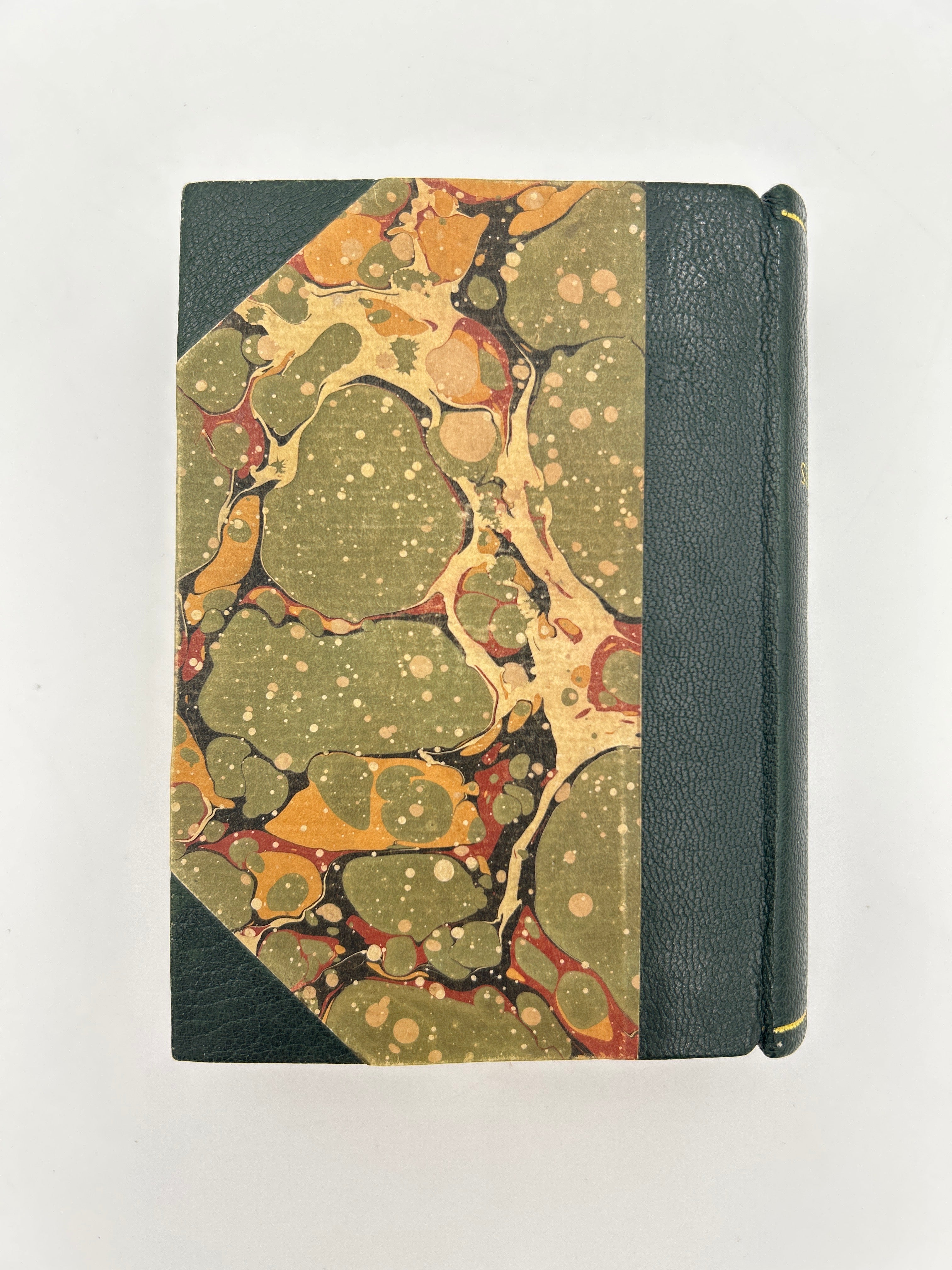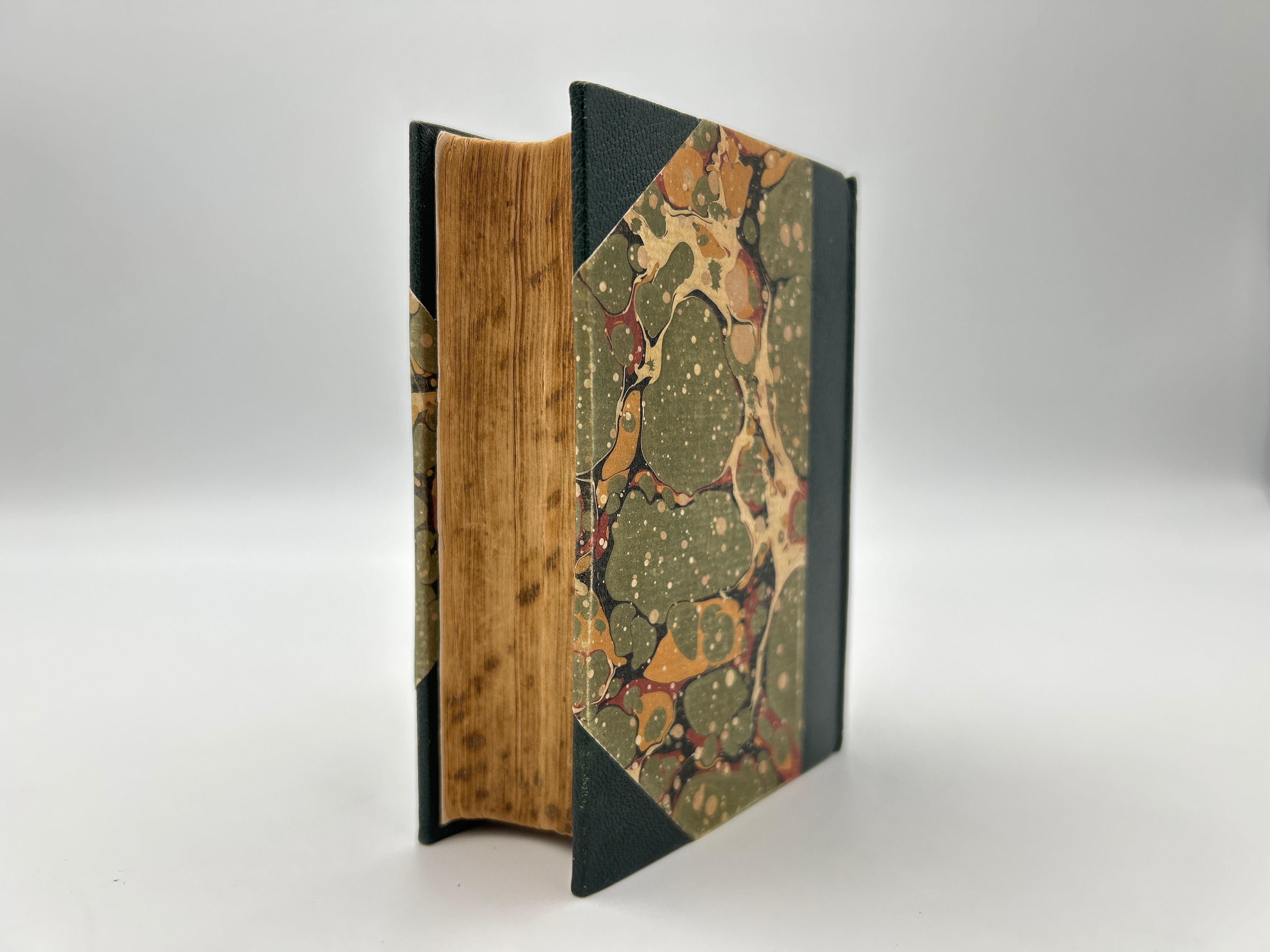 3/4 leather binding in dark green, gold lettering on spine, marbled design on front and back cover, rebound