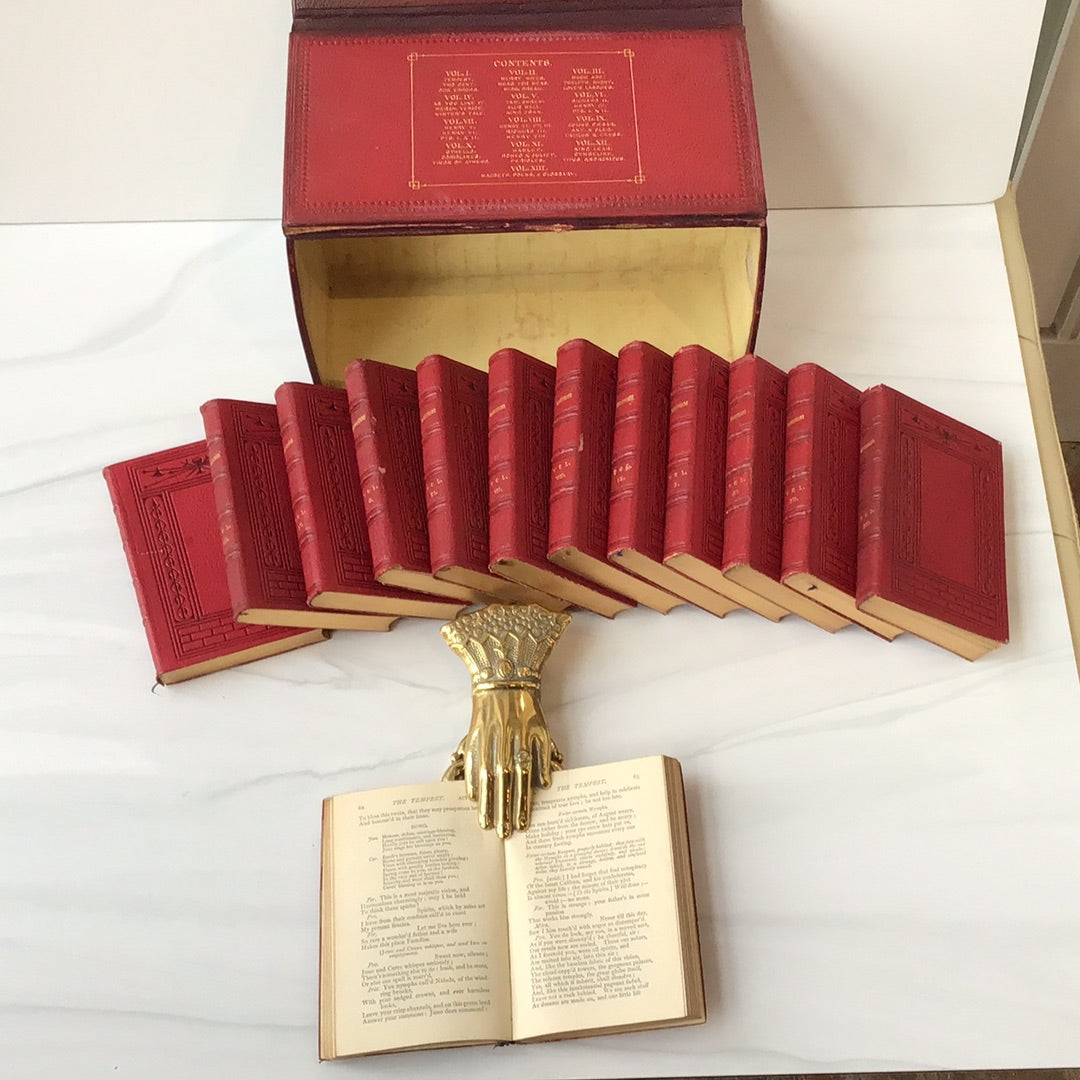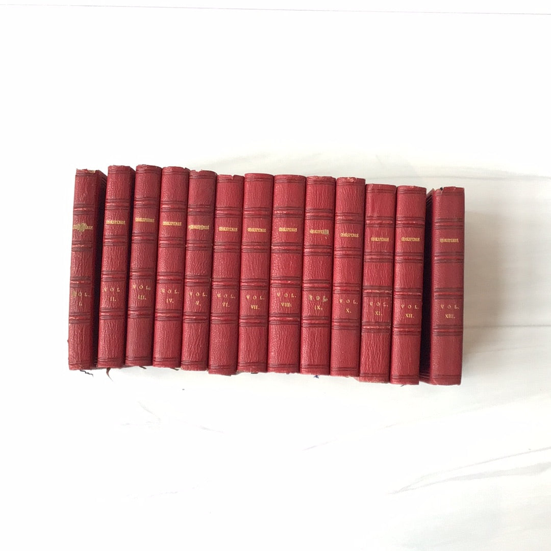 Thirteen volume set of the works of Shakespeare, pocket sized leather volumes, with blind tooling on the covers. Matching leather box.