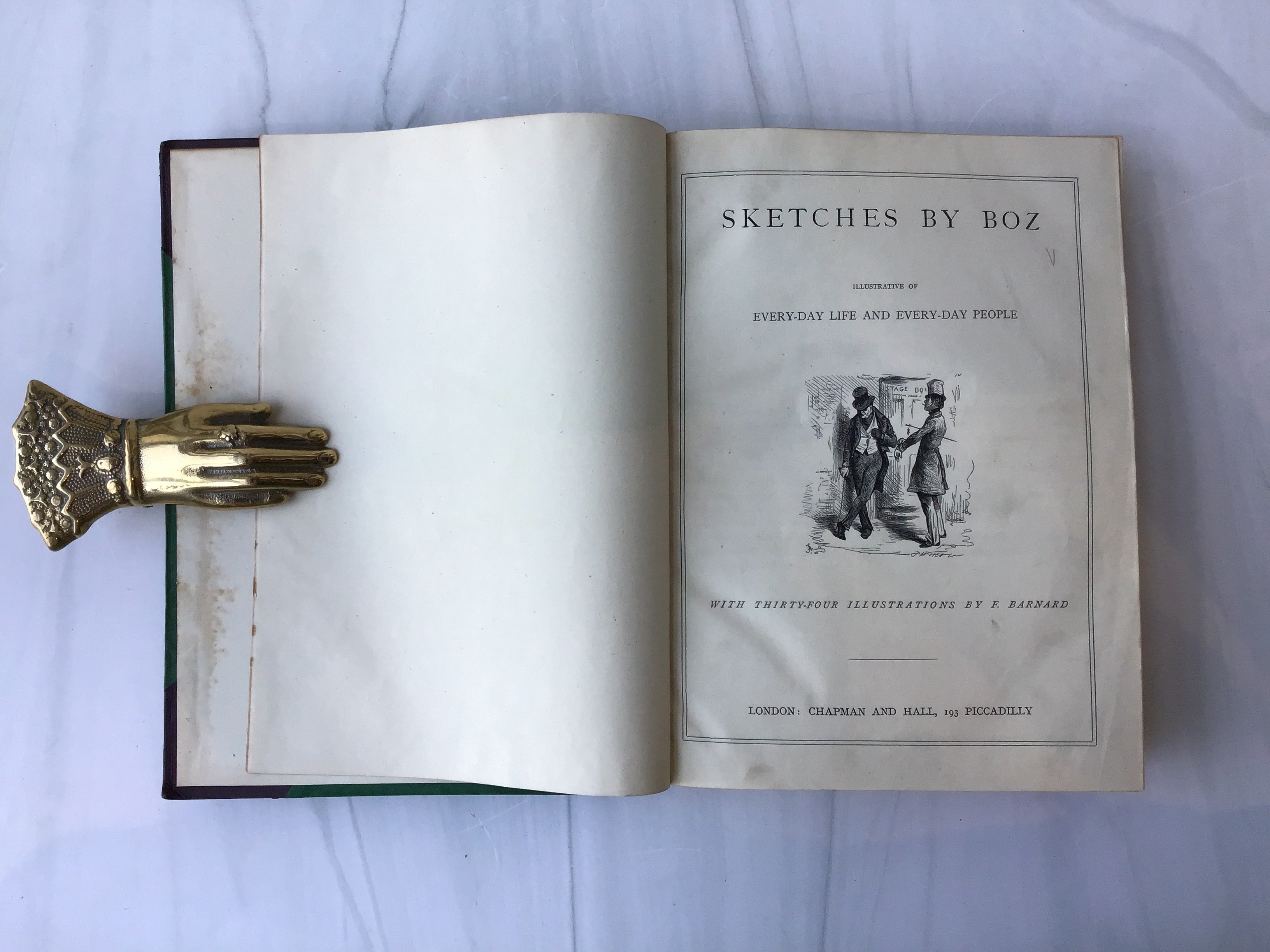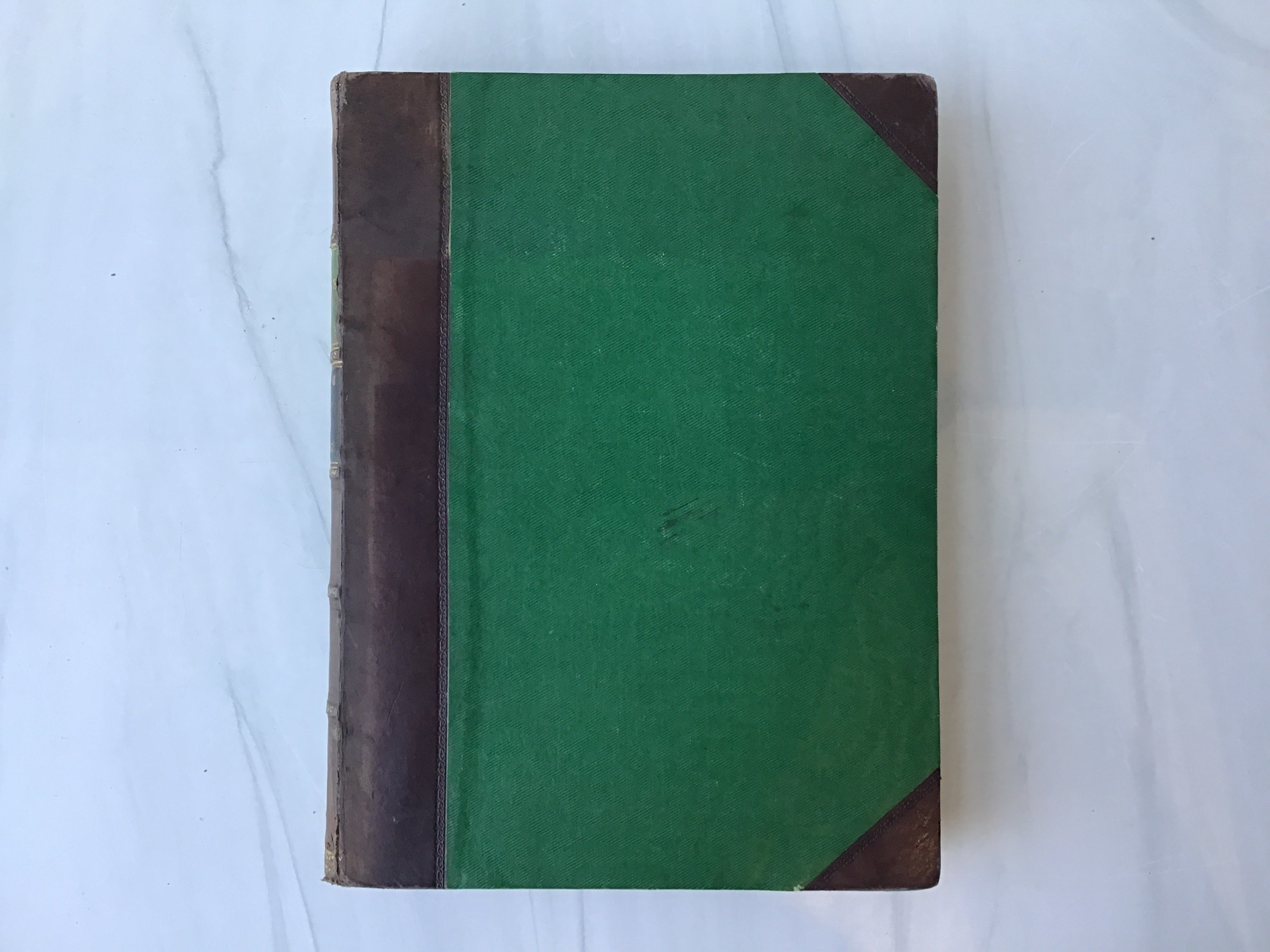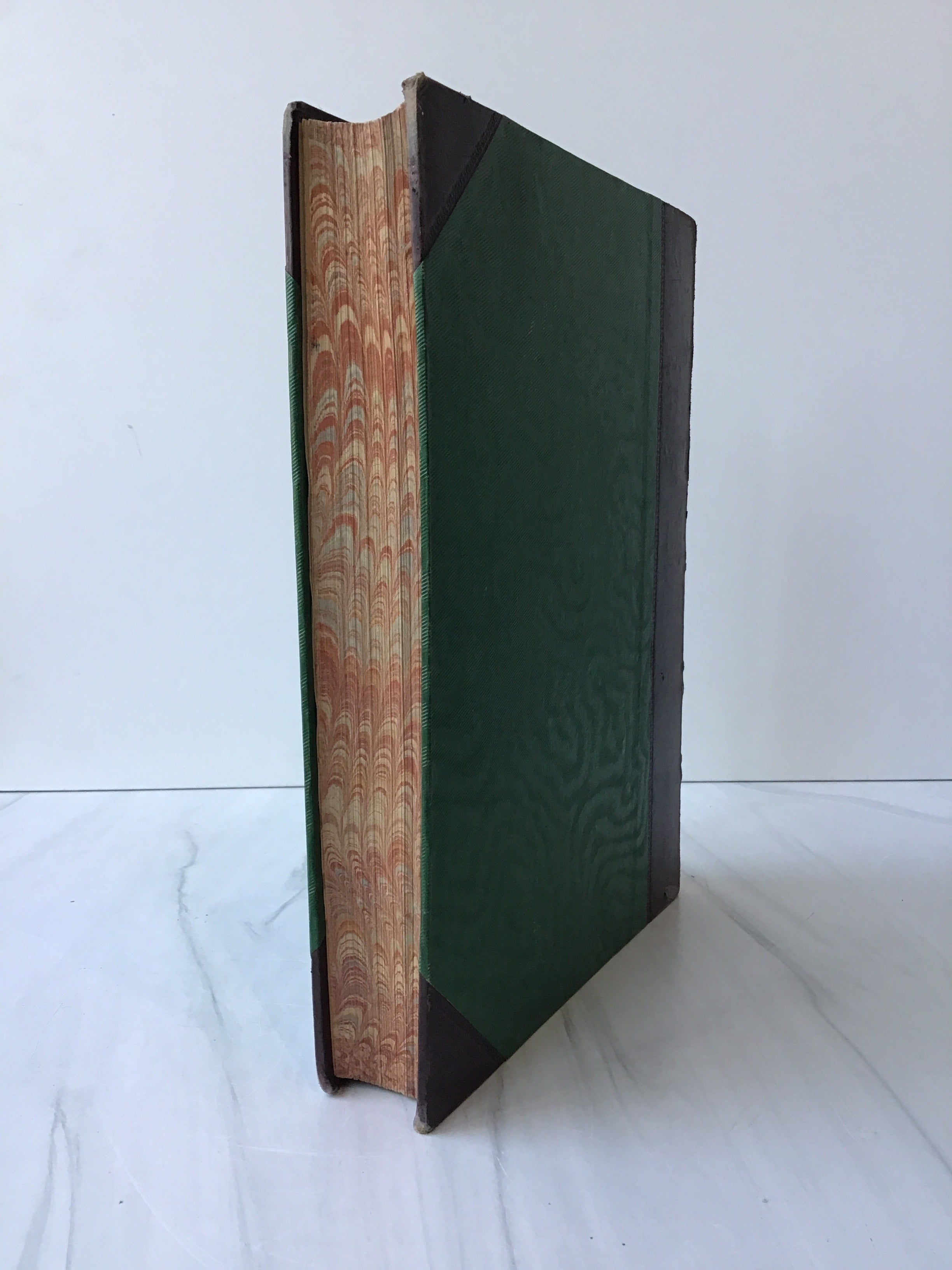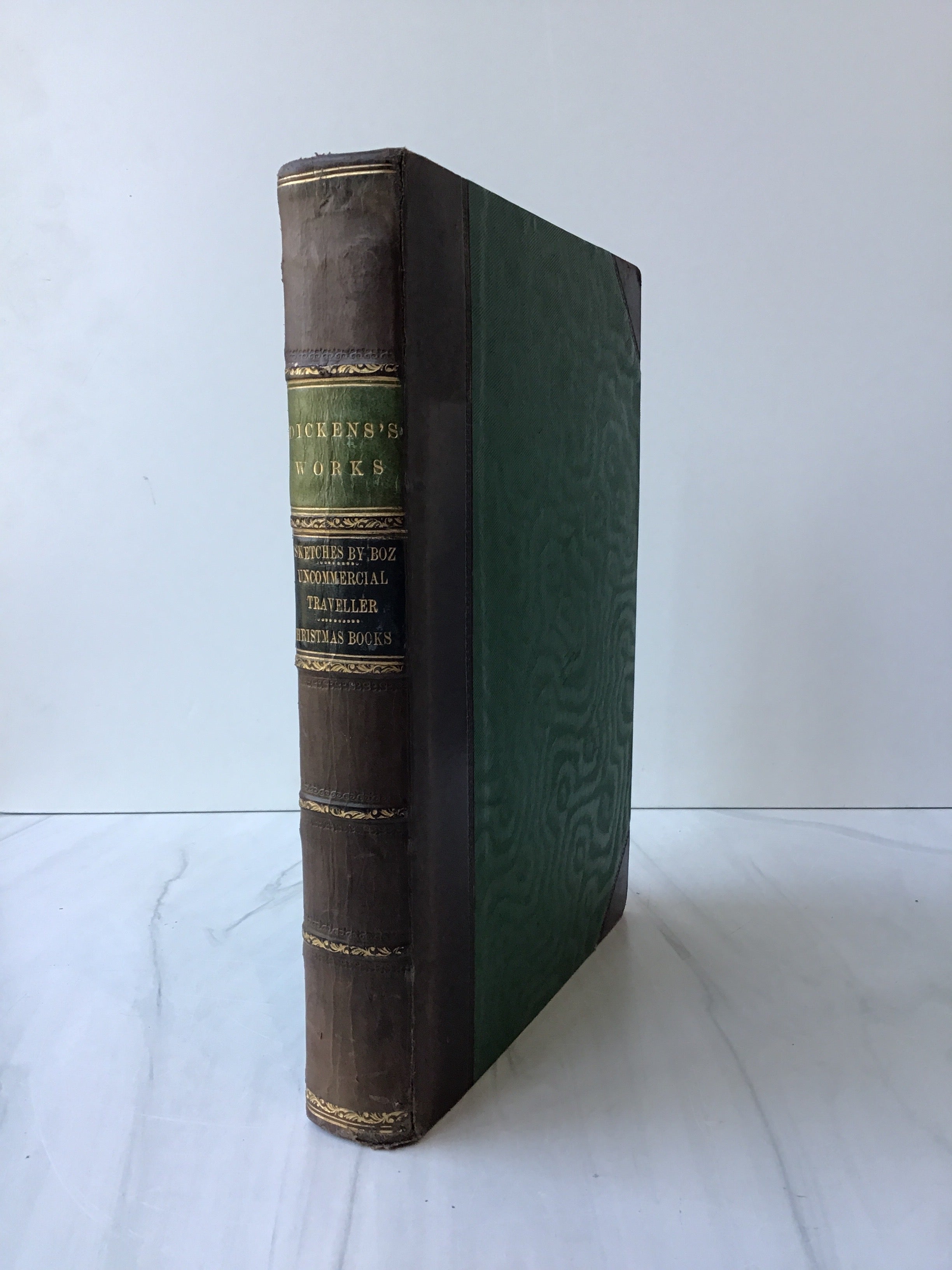 3/4 brown leather/green textured fabric, five raised bands, title and author labels on spine, thirty-four illustrations by F. Barnard, gold tooling on spine, three edge marbling, very good condition.