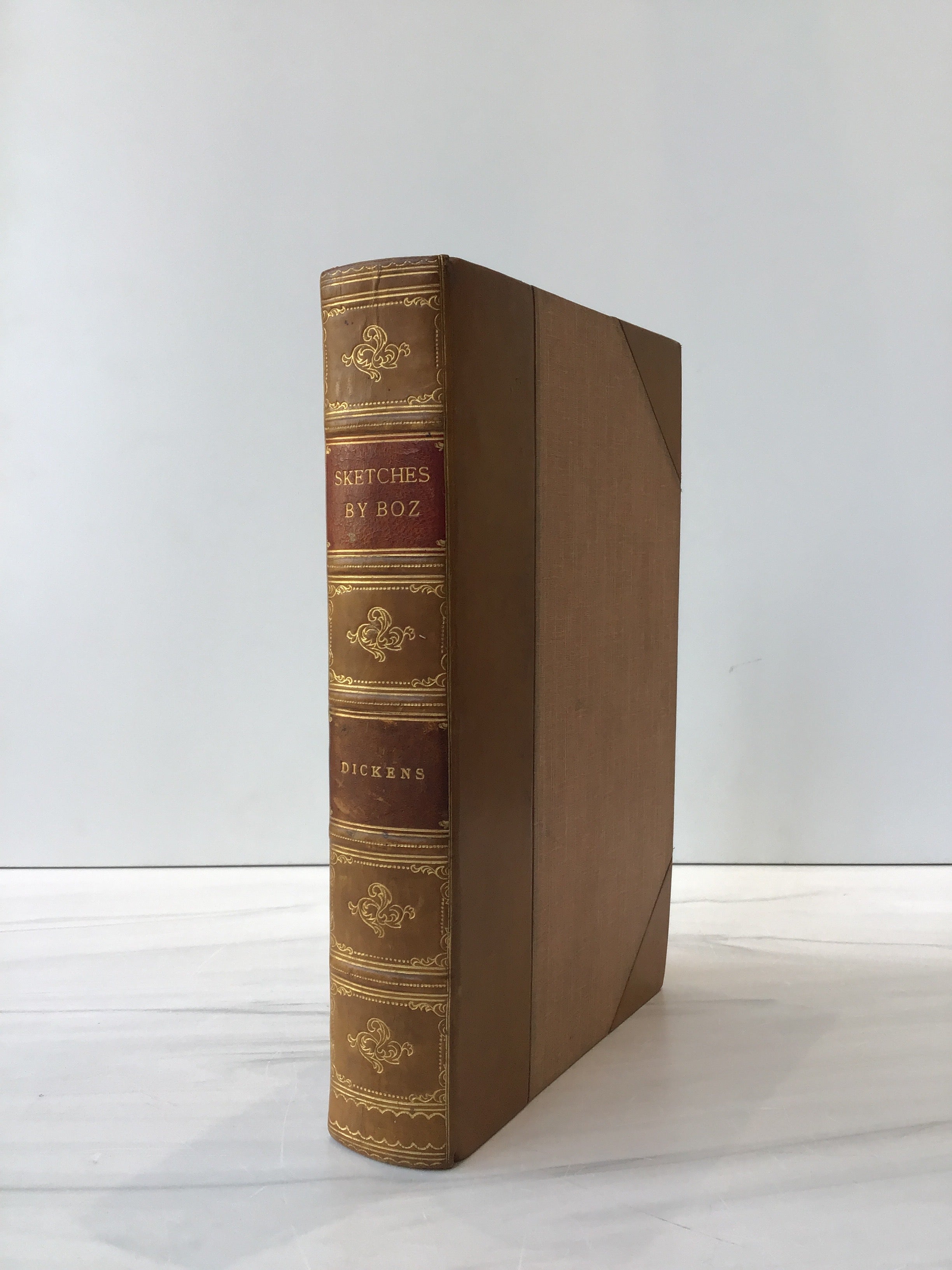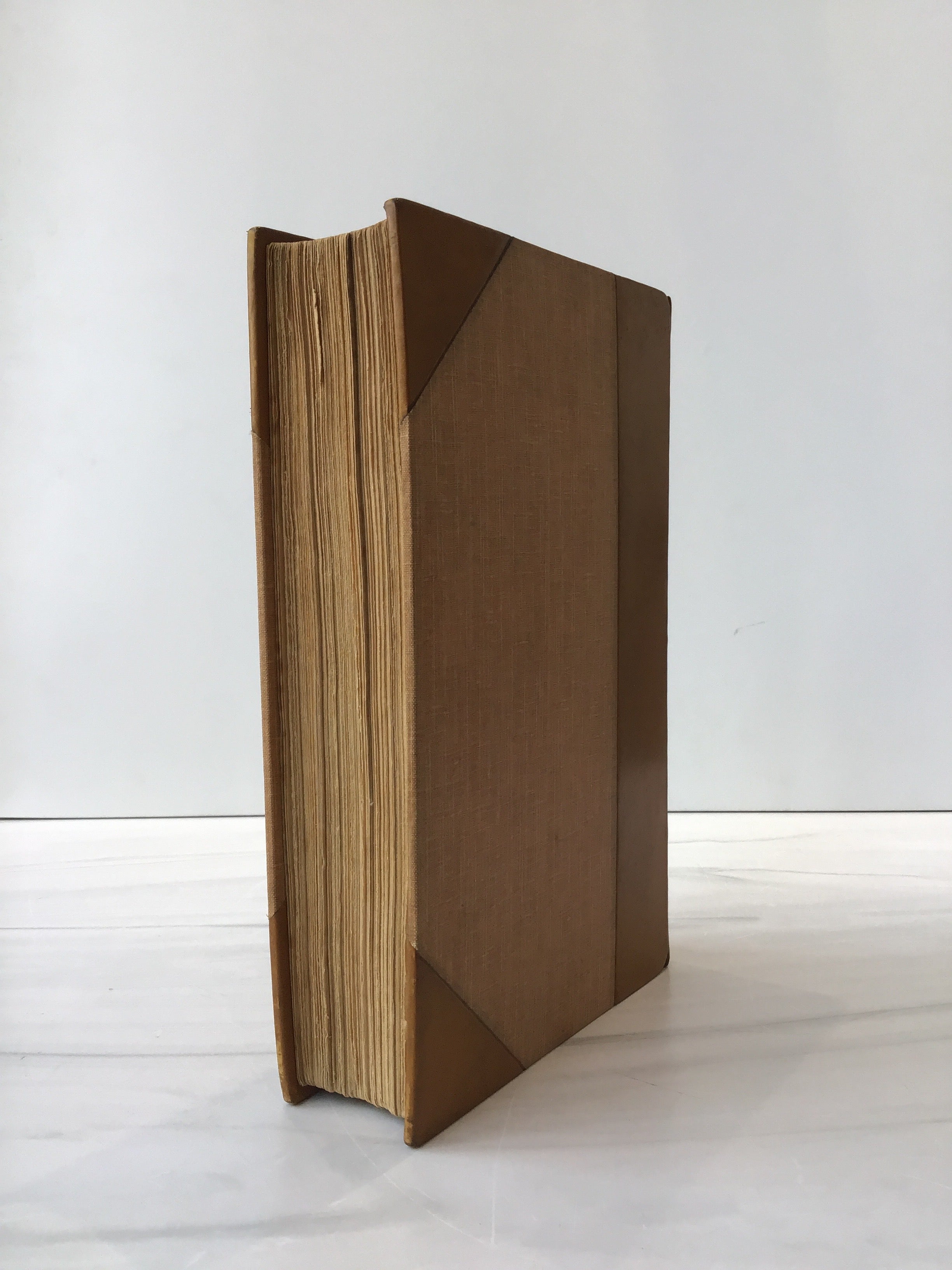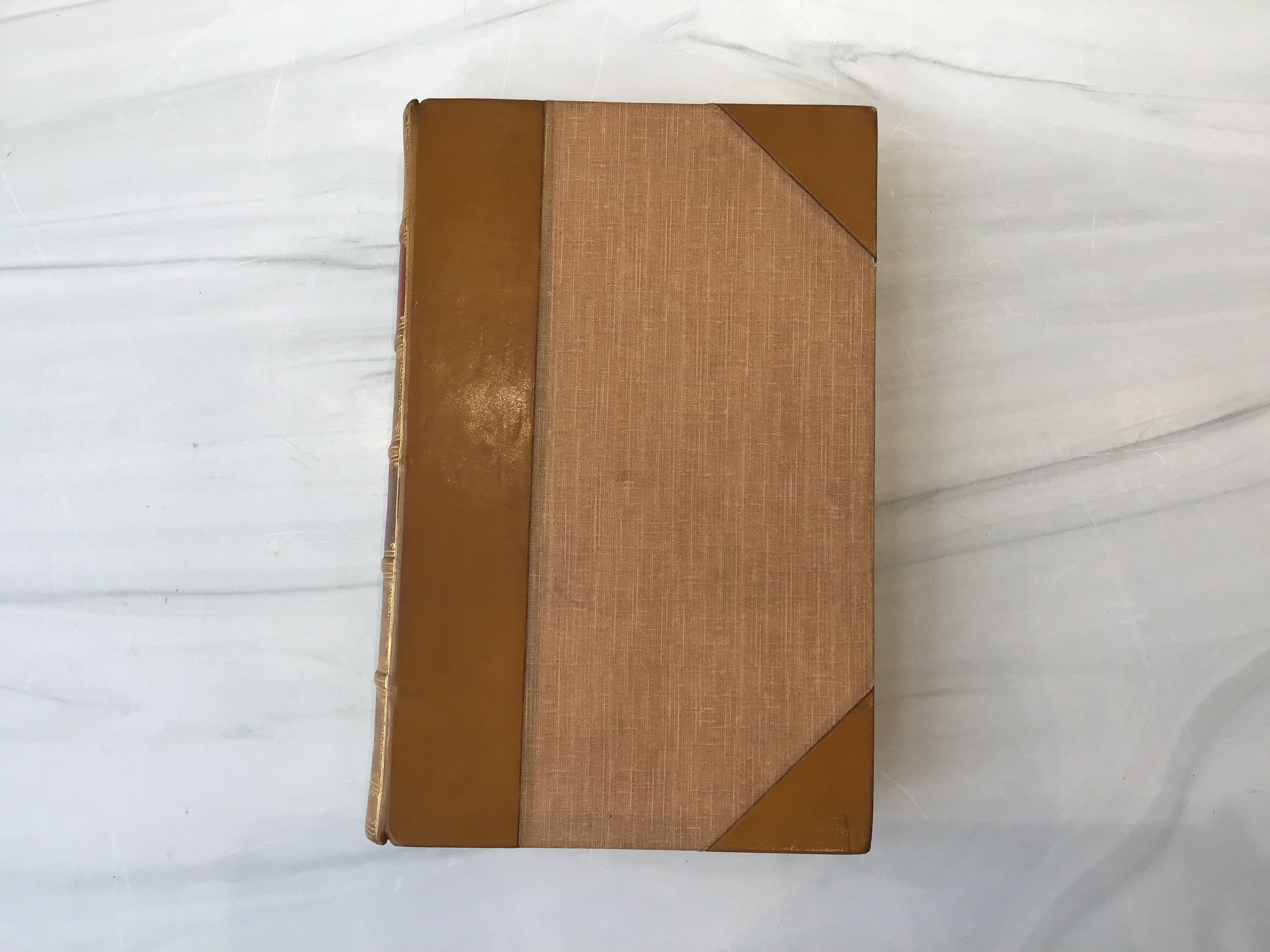 Three-quarter leather binding, camel tan leather and light brown book cloth. Red and tan leather labels on the spine with title and author. Spine has beautiful gold tooling. Fine condition.