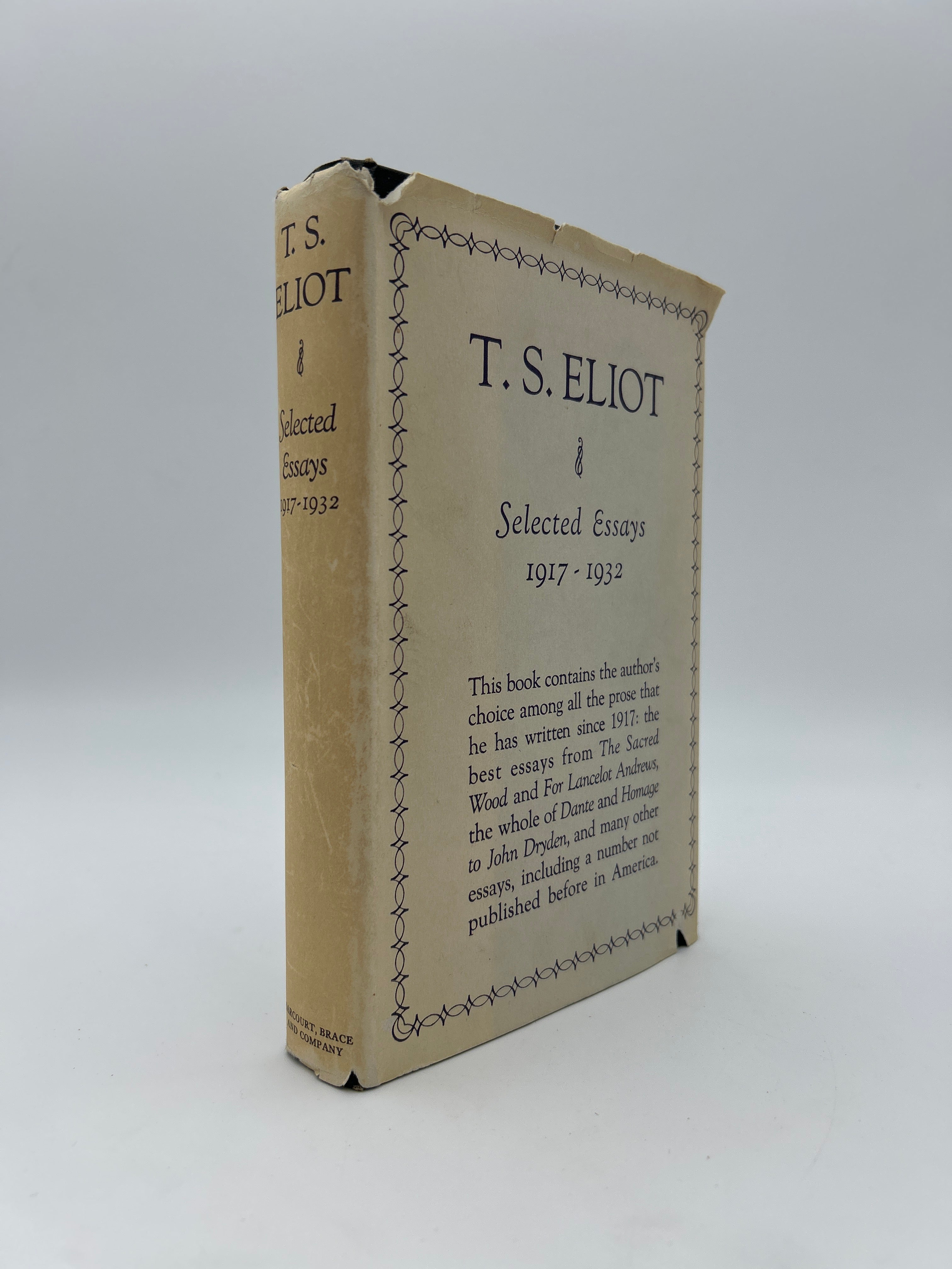 Black cloth with gold lettering and dust jacket, paper dust jacket reading, "This book contains the author's choice among all the prose that he has written since 1917: The best essays from The Sacred Wood and For Lancelot Andrews, the whole of Dante and Homage to John Dryden, and many other essays, including a number not published before in America" some tearing on four corners of dust jacket..