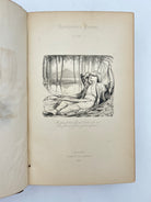 Brown textured leather with raised bands, blue & white sewn endbands, marbled paper paste down/end papers, black/blind tooling around edges of cover and sections on spine, gold star-like decoration on front and back with gold titling and simple flowers on spine, gold tooling around inside edges of covers, gold edged textblock, a few pictorial illustrations at front and smaller, decorative illustrations throughout