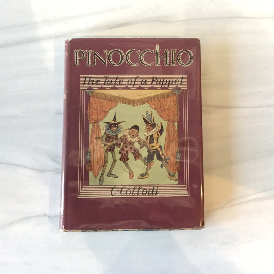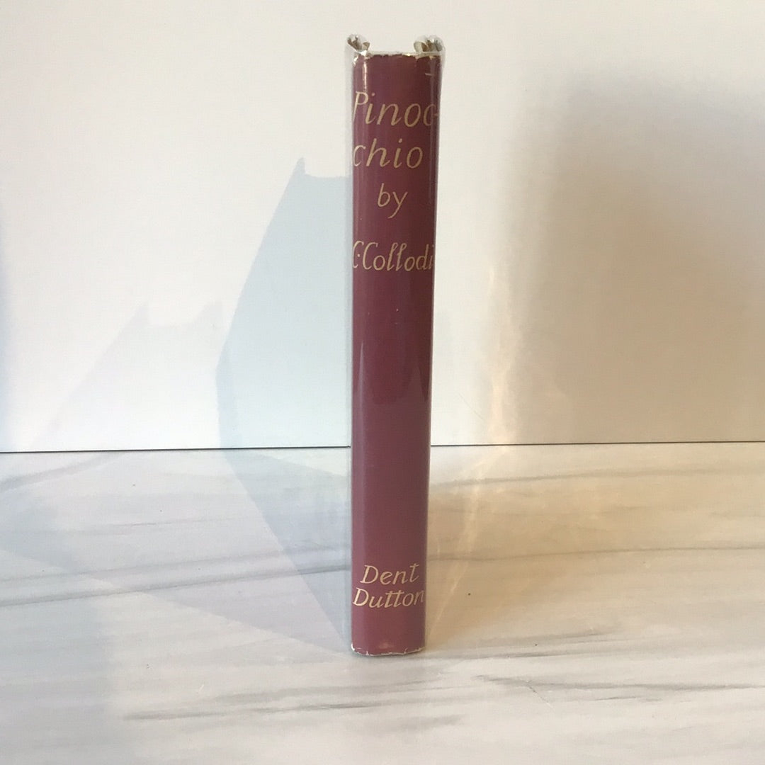 Hardback copy with dust jacket, little wooden Pinocchio dances across the binding, front, back and spine, eight illustrations in full color and eighy line drawings and decorations in the text by Charles Folkard.