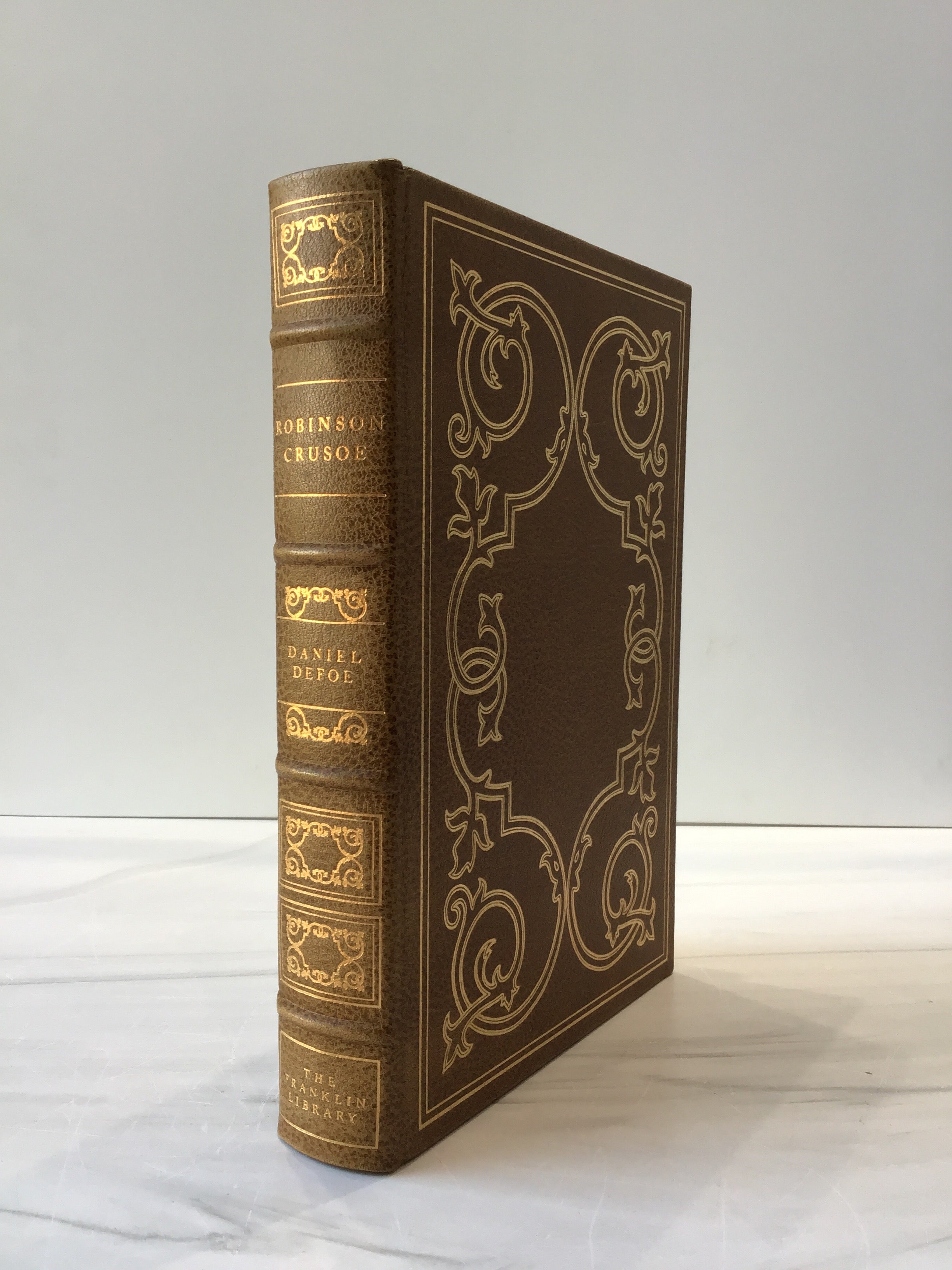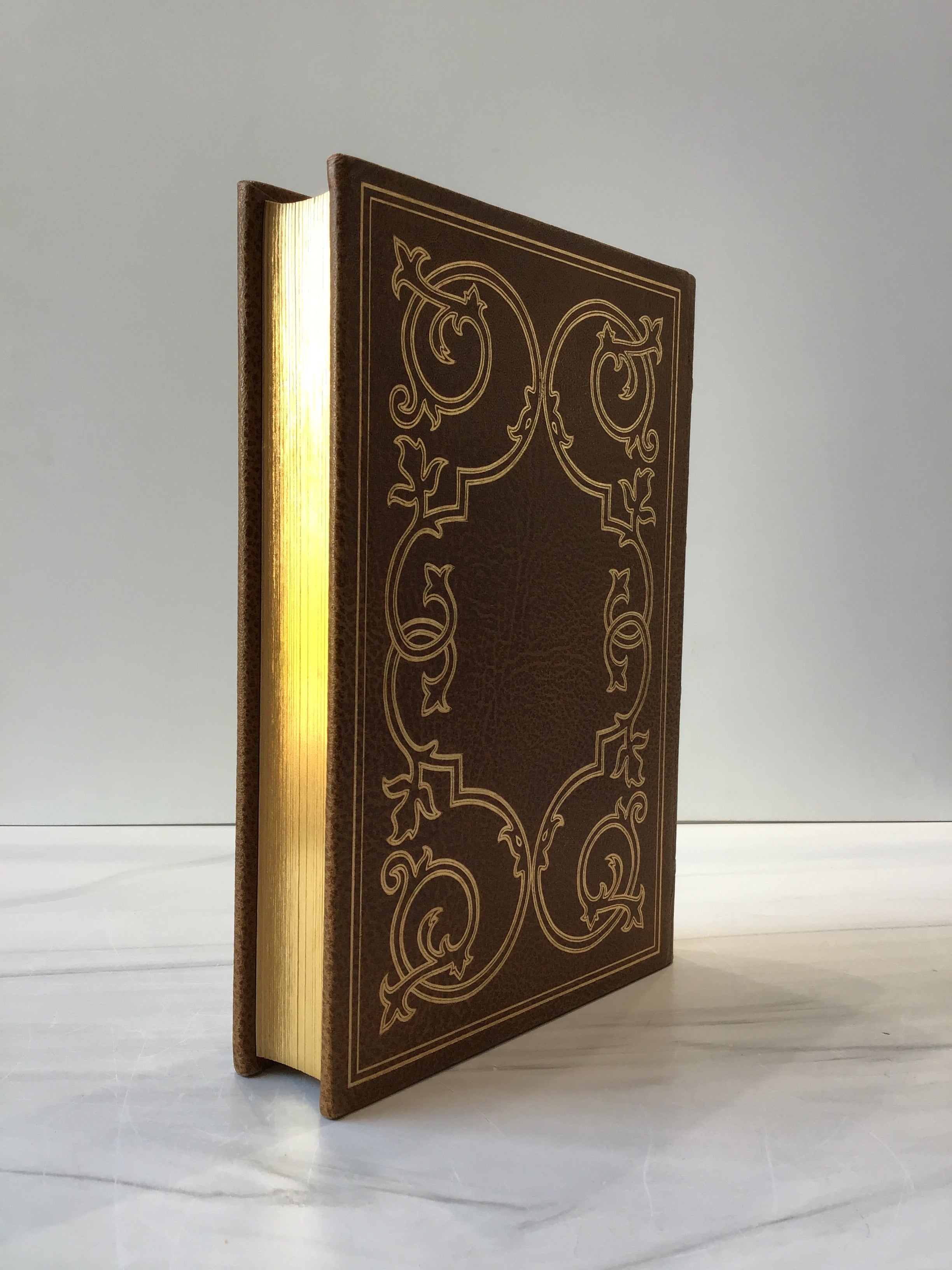 Brown leather bound Hardback copy with gold embossed detailing on front and back covers and spine with gold lettering on the spine. Gold fore edge design with brown silk bookmark, and four raised bands. Pristine Franklin Library Edition.