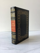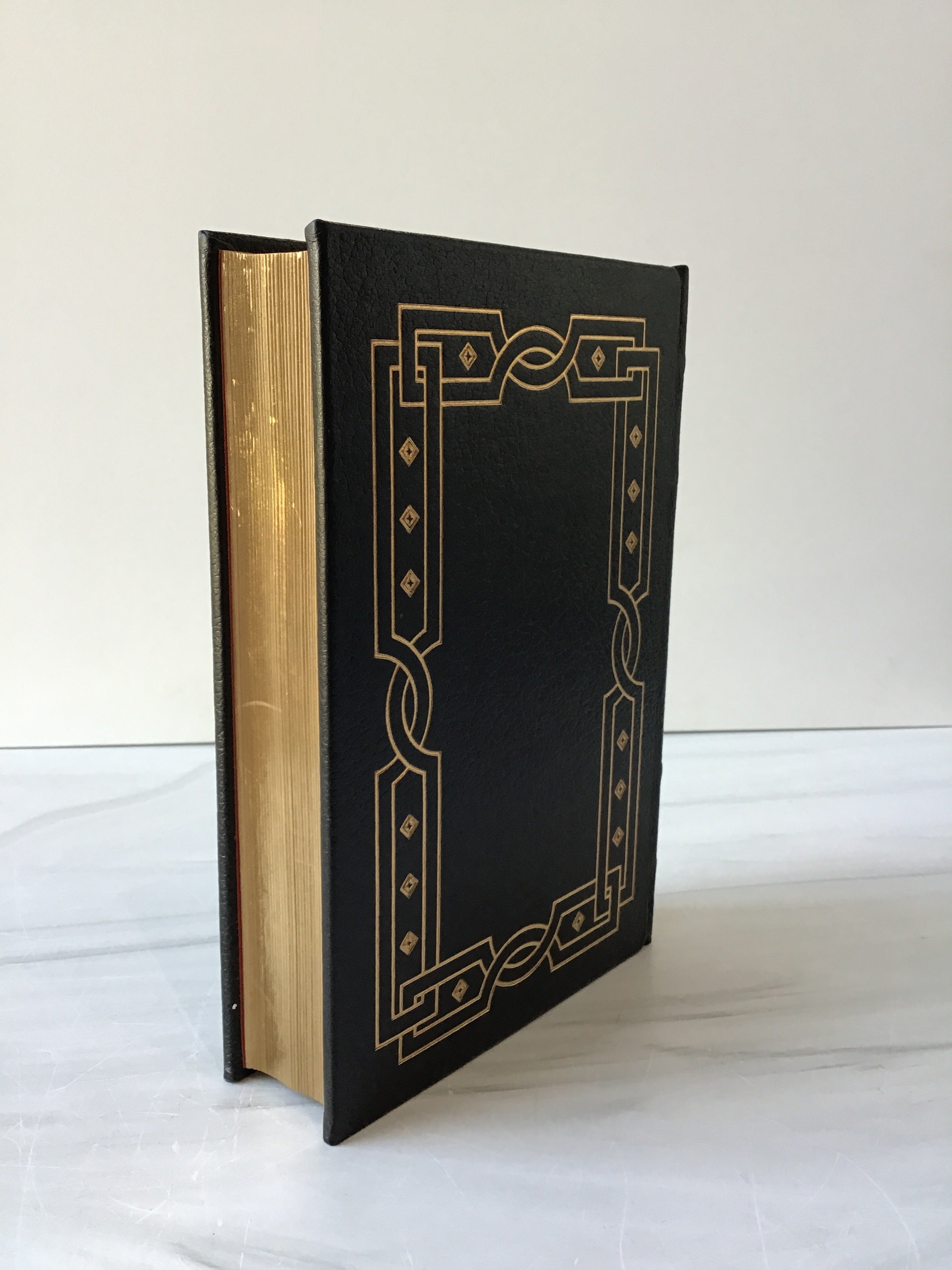 Black leather hardback edition with gold embossed detailing on front and back cover and spine with gold lettering in a red block on spine, gold fore edge, four raised bands, and red silk bookmark. Pristine Franklin Library edition.