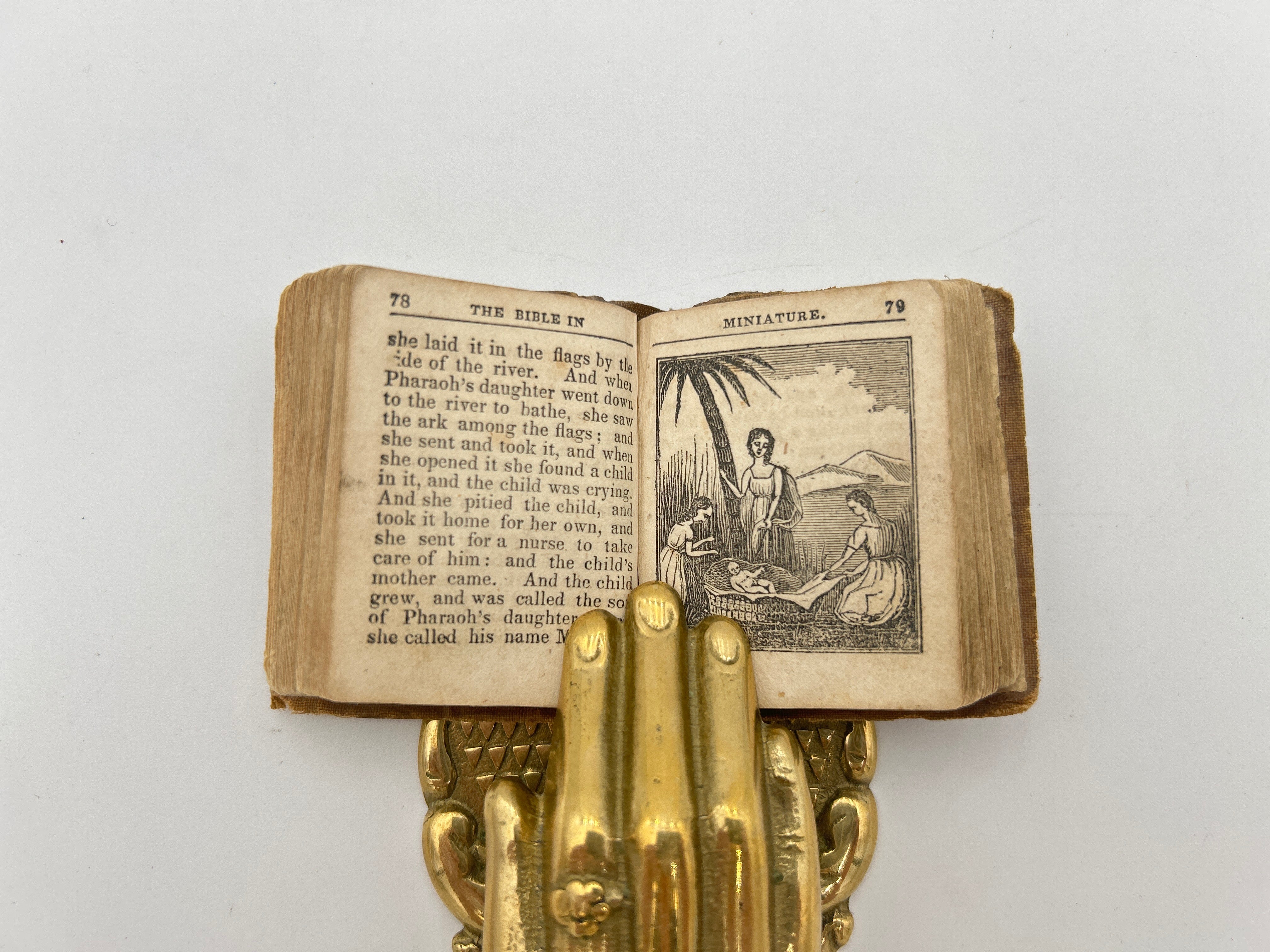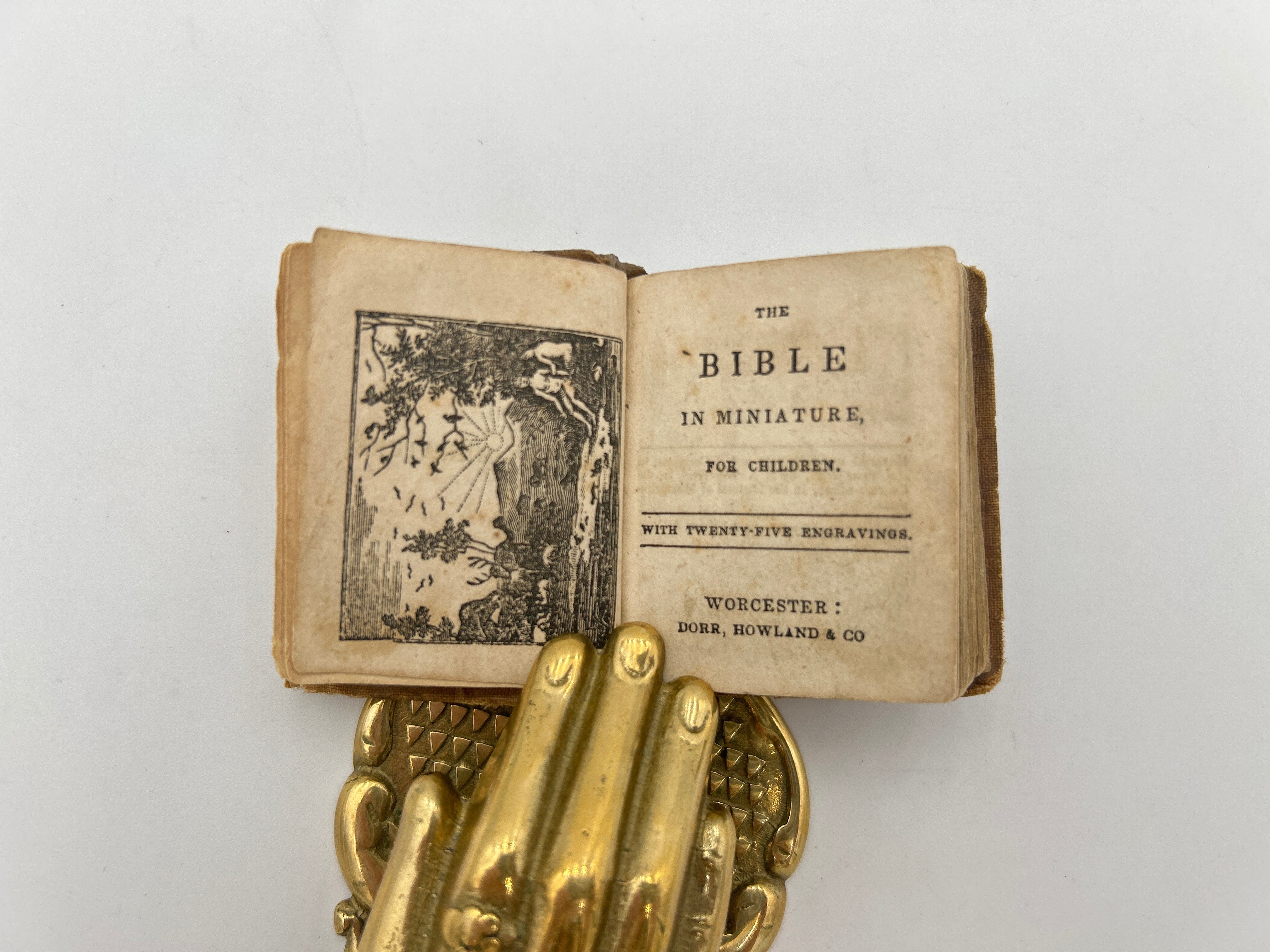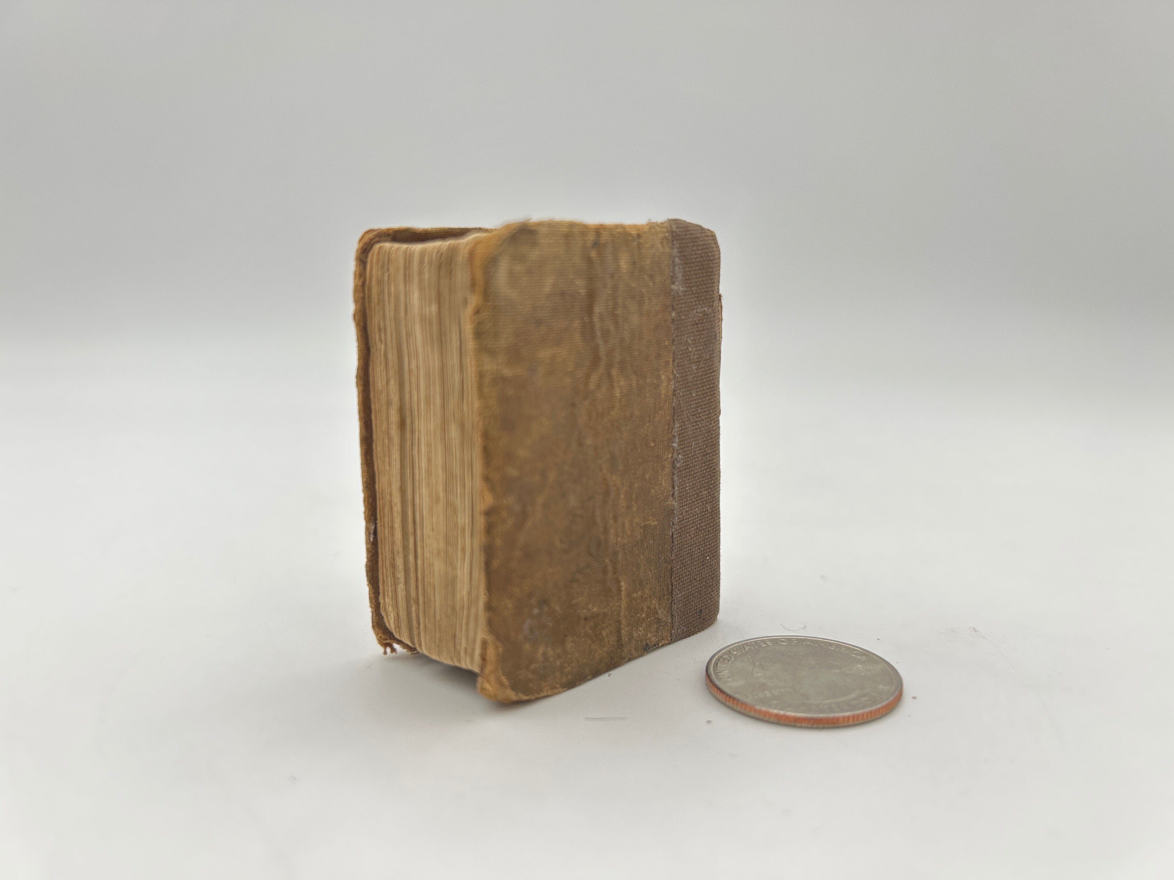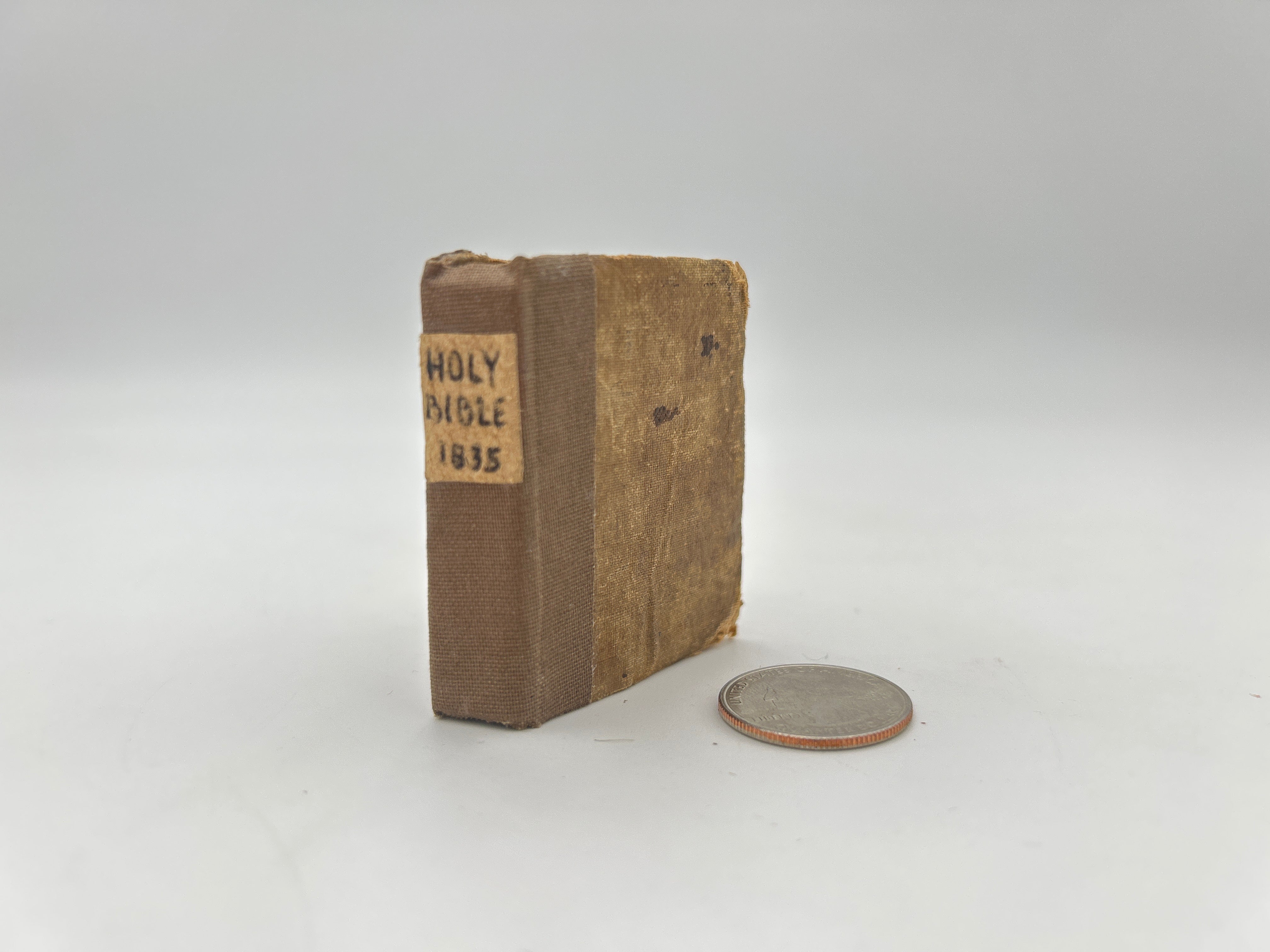Miniature bible, brown paper binding, Holy Bible 1835 label on spine, some bending corners, intact, good condition.