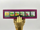 Twelve colored slides in two glass slides with purple seal around the edges. Each slide is 1 1/2in x 5 1/4in painted in vibrant colors. Comes in original vintage pictorial box with original slide dialogue pages.