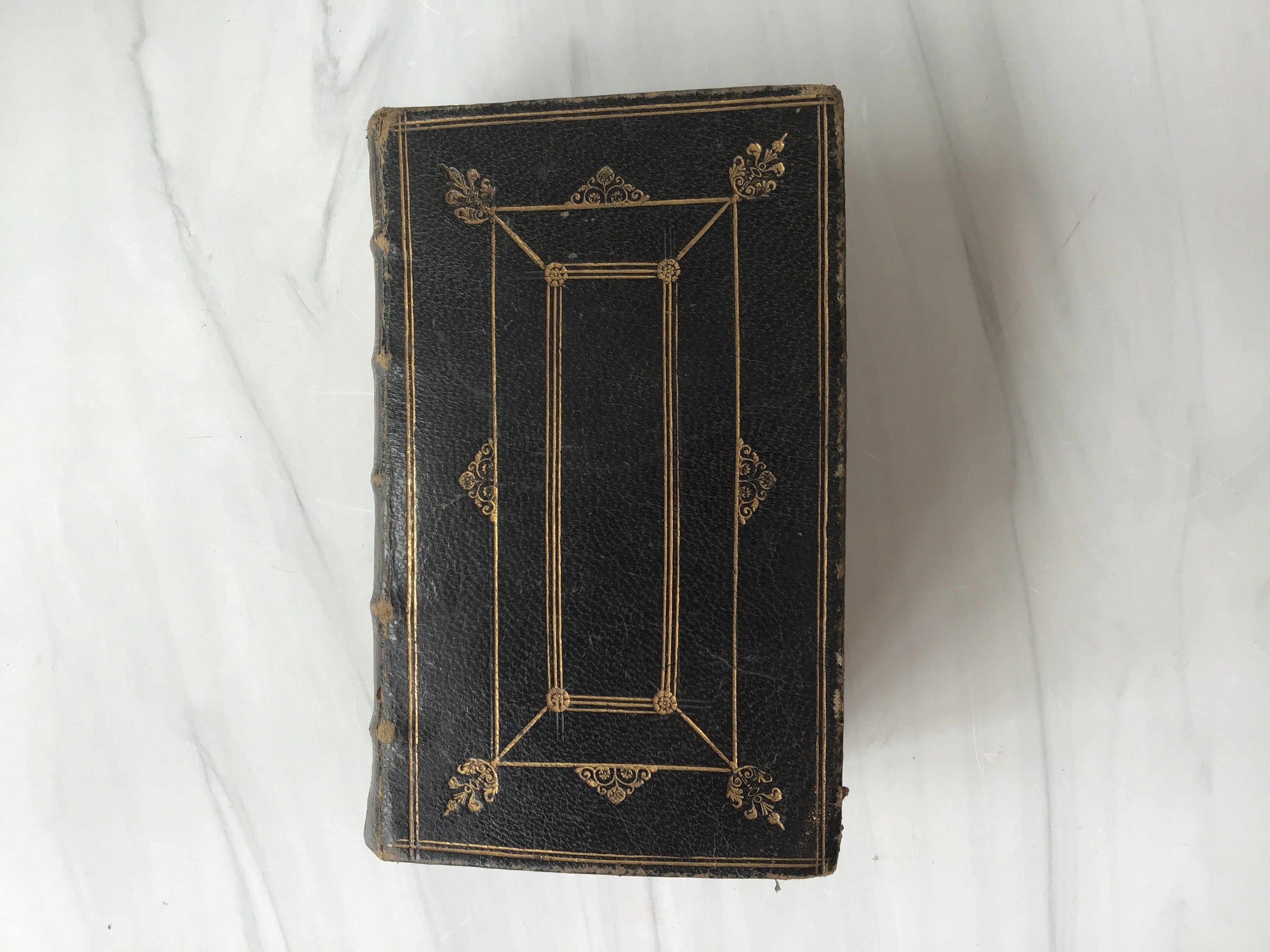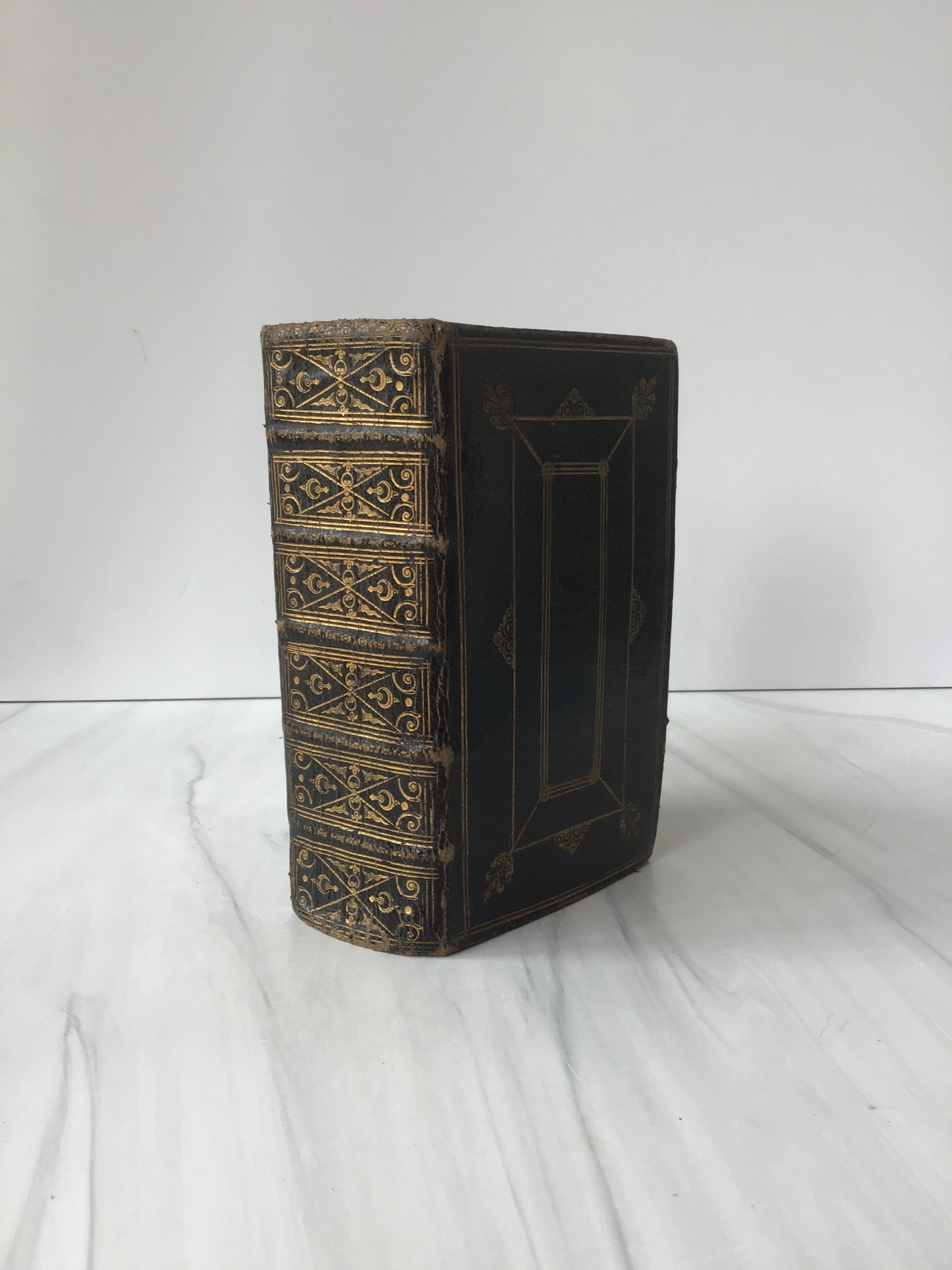 Pocket size, black leather and gold tooling front, back and spine, five raised bands, some rubbing on edges, three edge gilted.