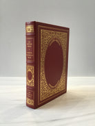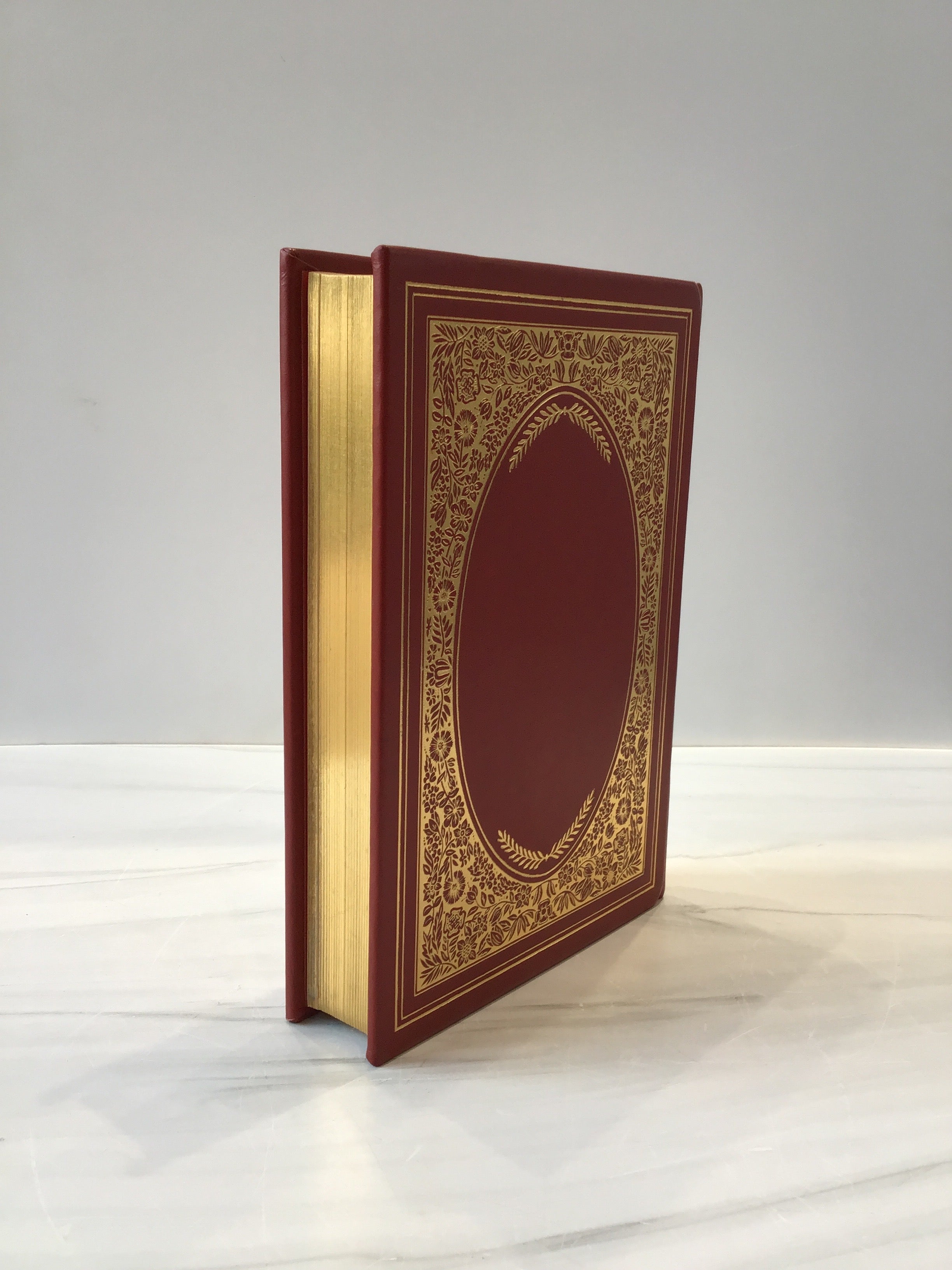 Red leather bound hard back edition with gold embossed design on front and back cover and gold embossed lettering on the spine. Gold for edge with silk red bookmark, four raised bands, and a few illustrations throughout. Pristine Franklin Library Edition.
