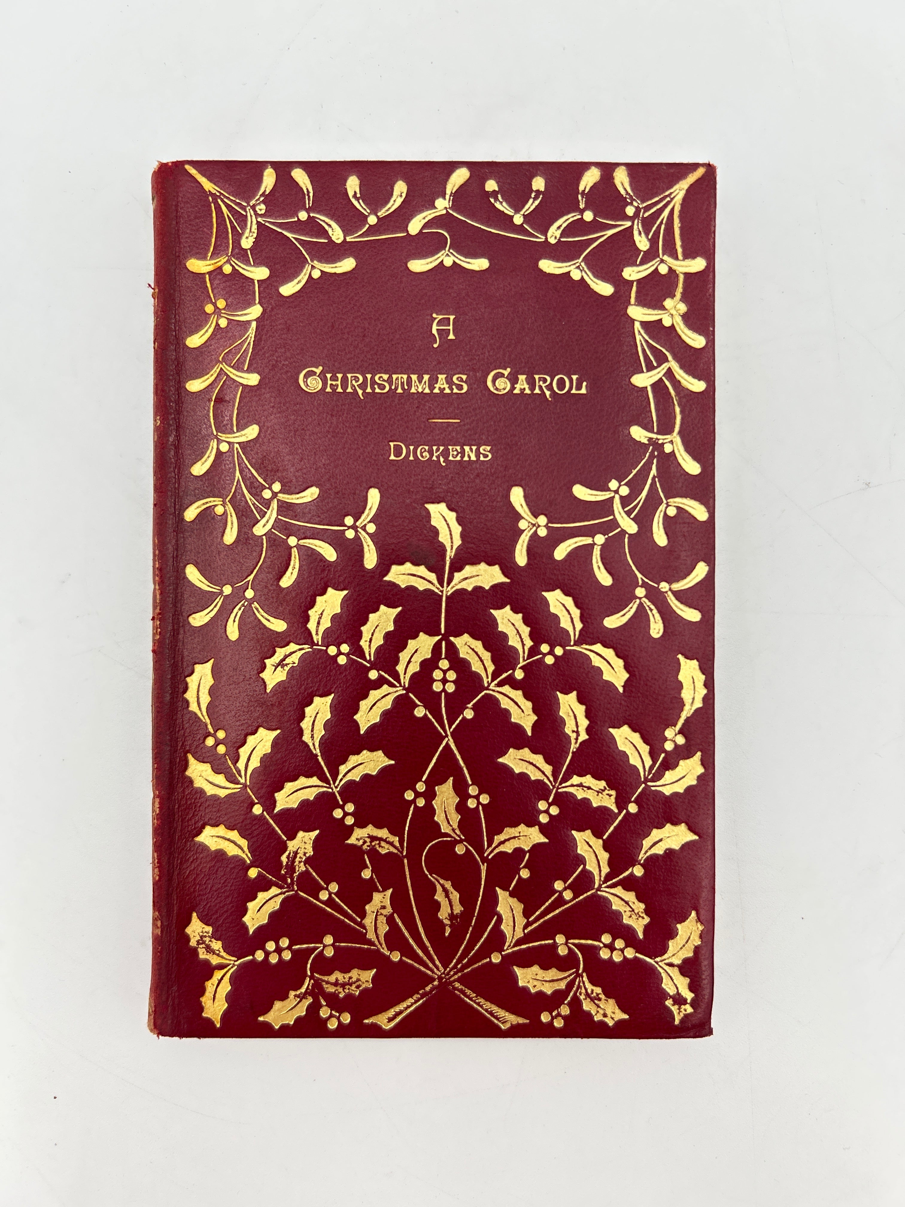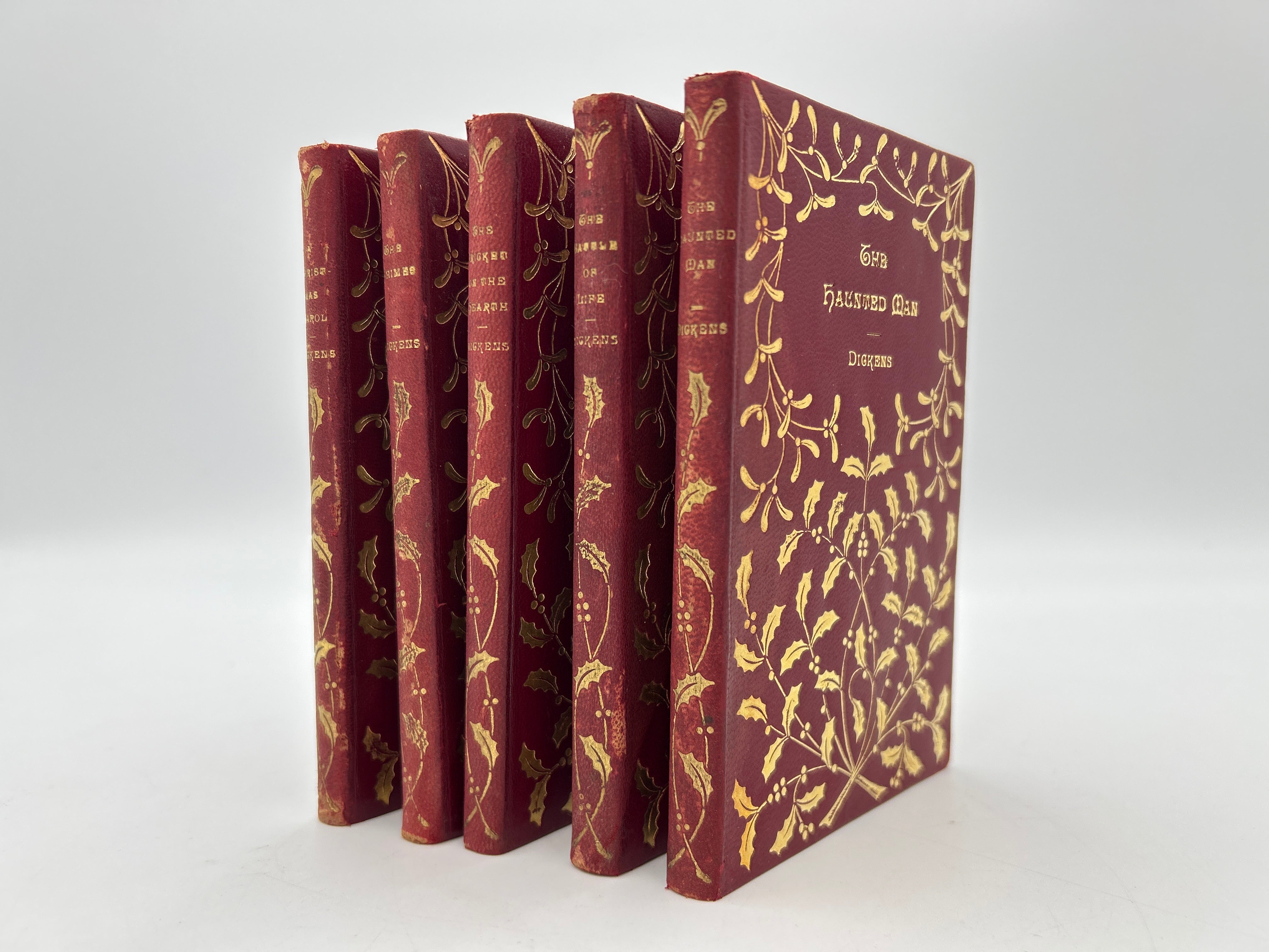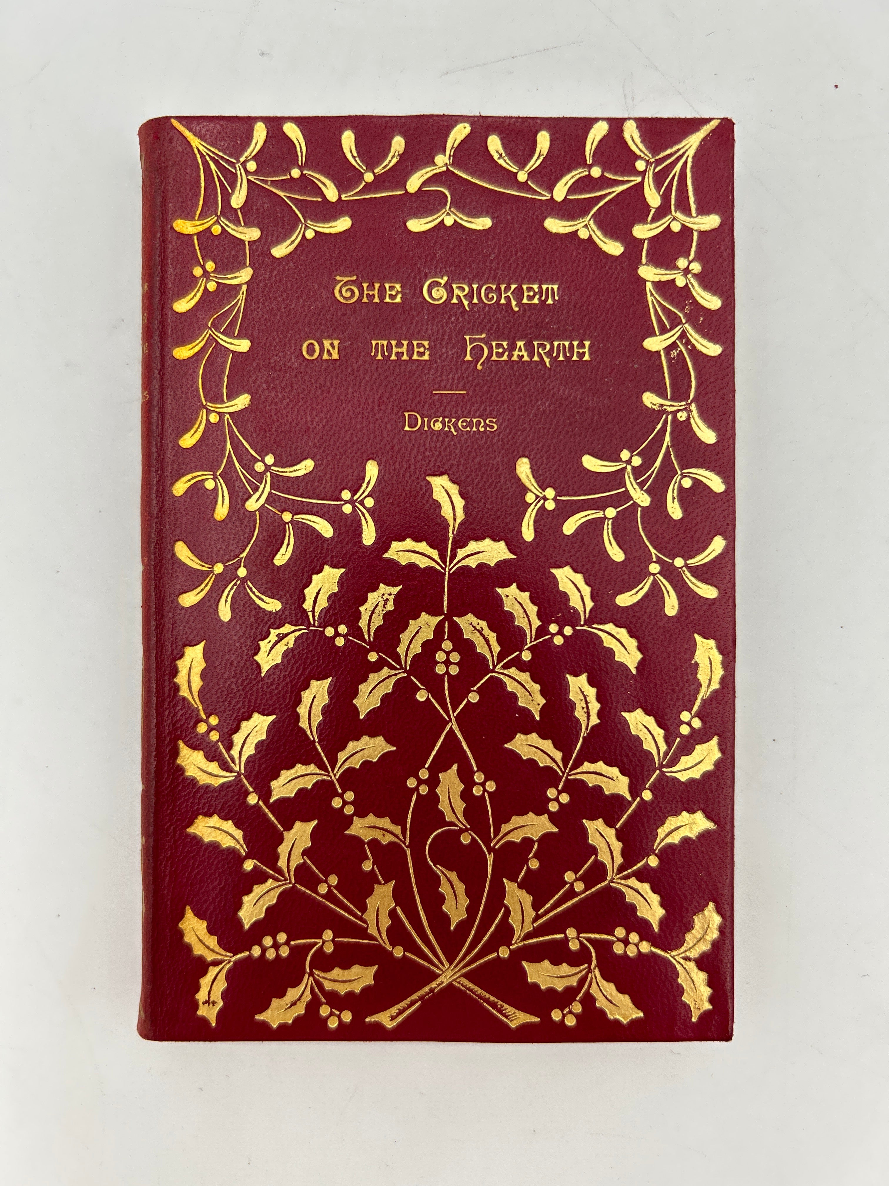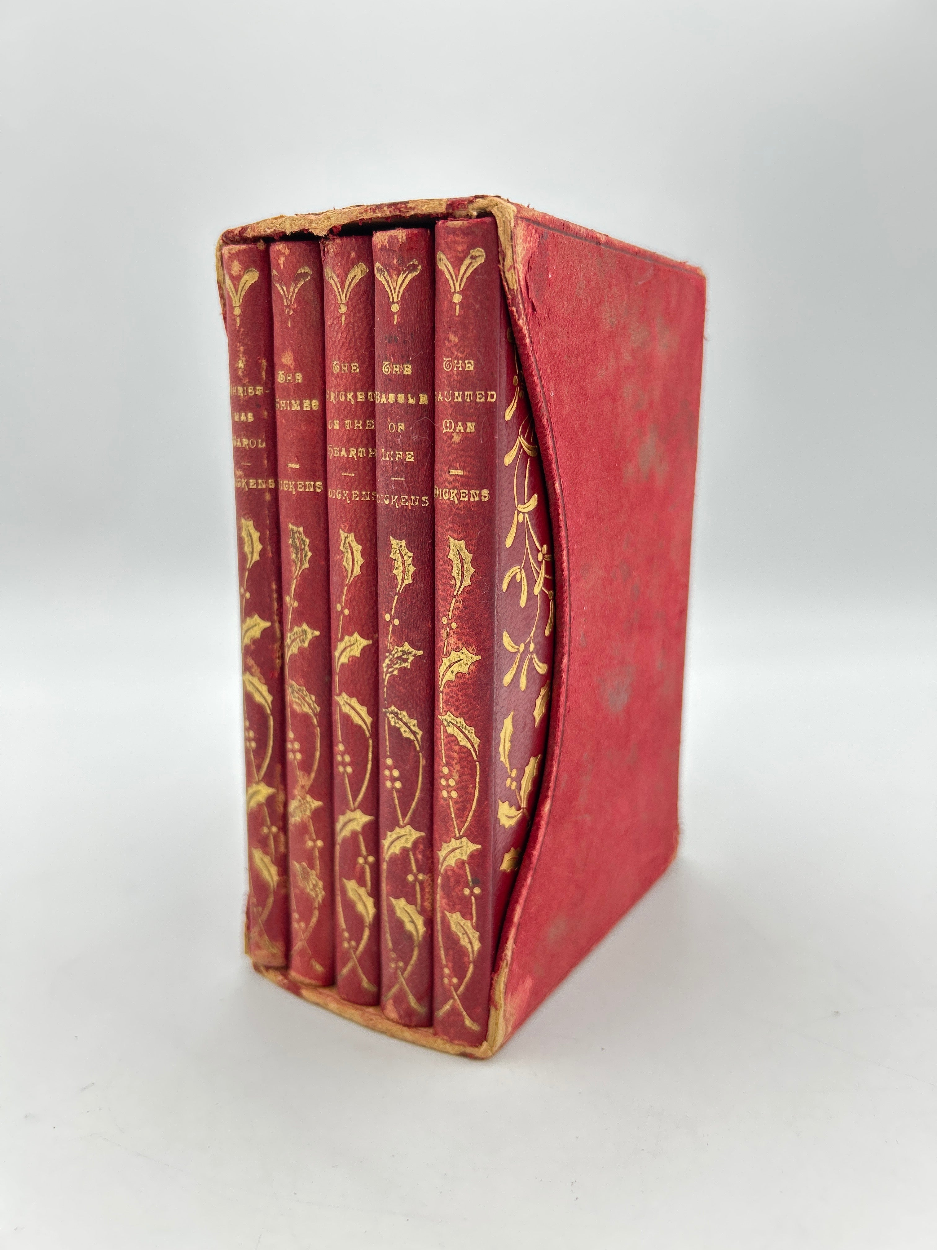 Red leather volumes with gilt holly leafs over the upper boards and spine of every book. Gilt lettering on upper boards and spines as well. All edges gilt. Each book has some sun fading to the spine and rubbing with slight fraying to the head and foot of the spines. Some superficial bumping to the points on some books. Fine condition overall.