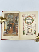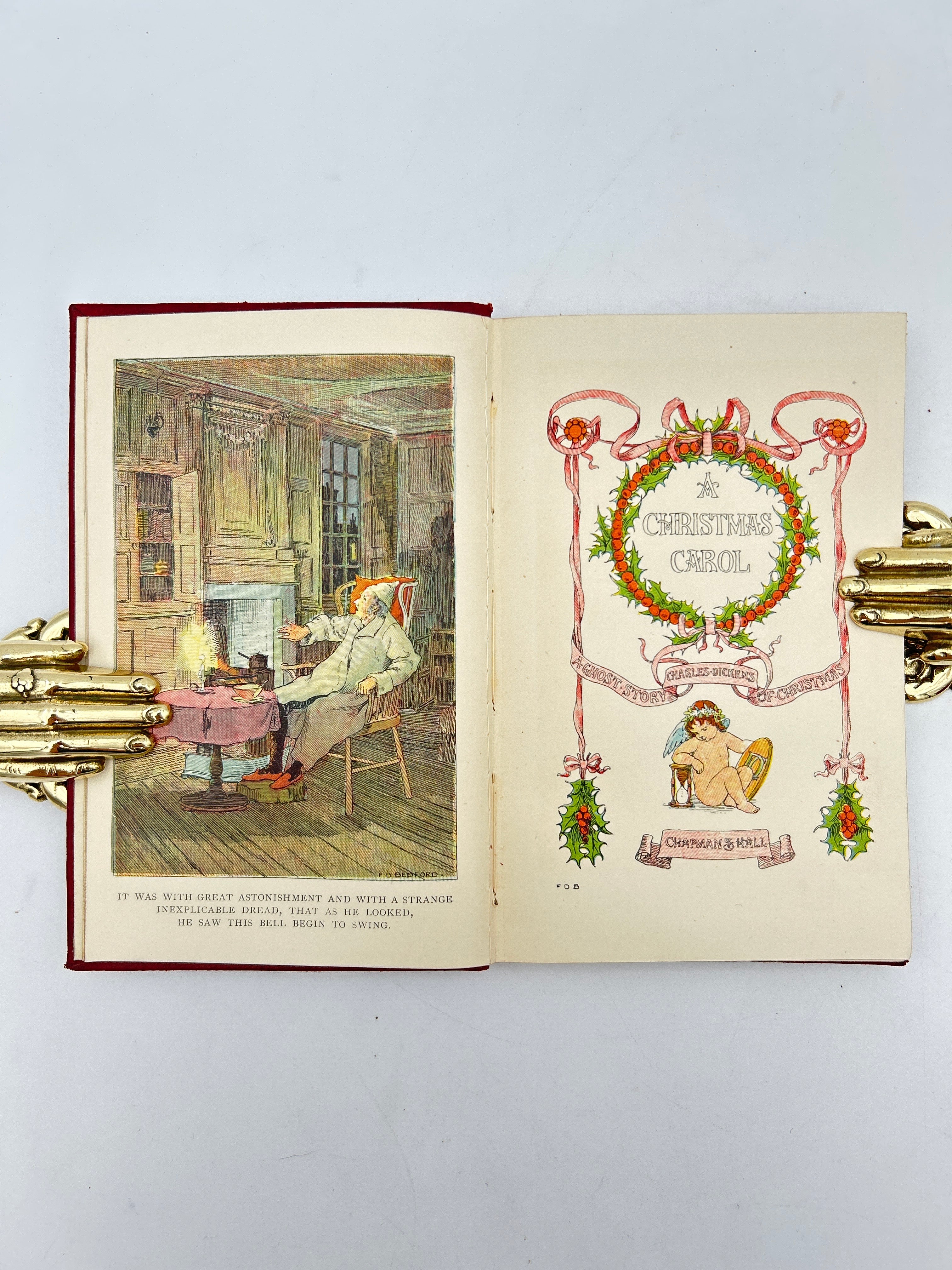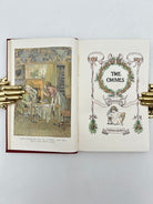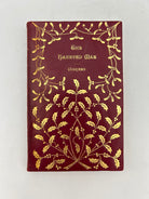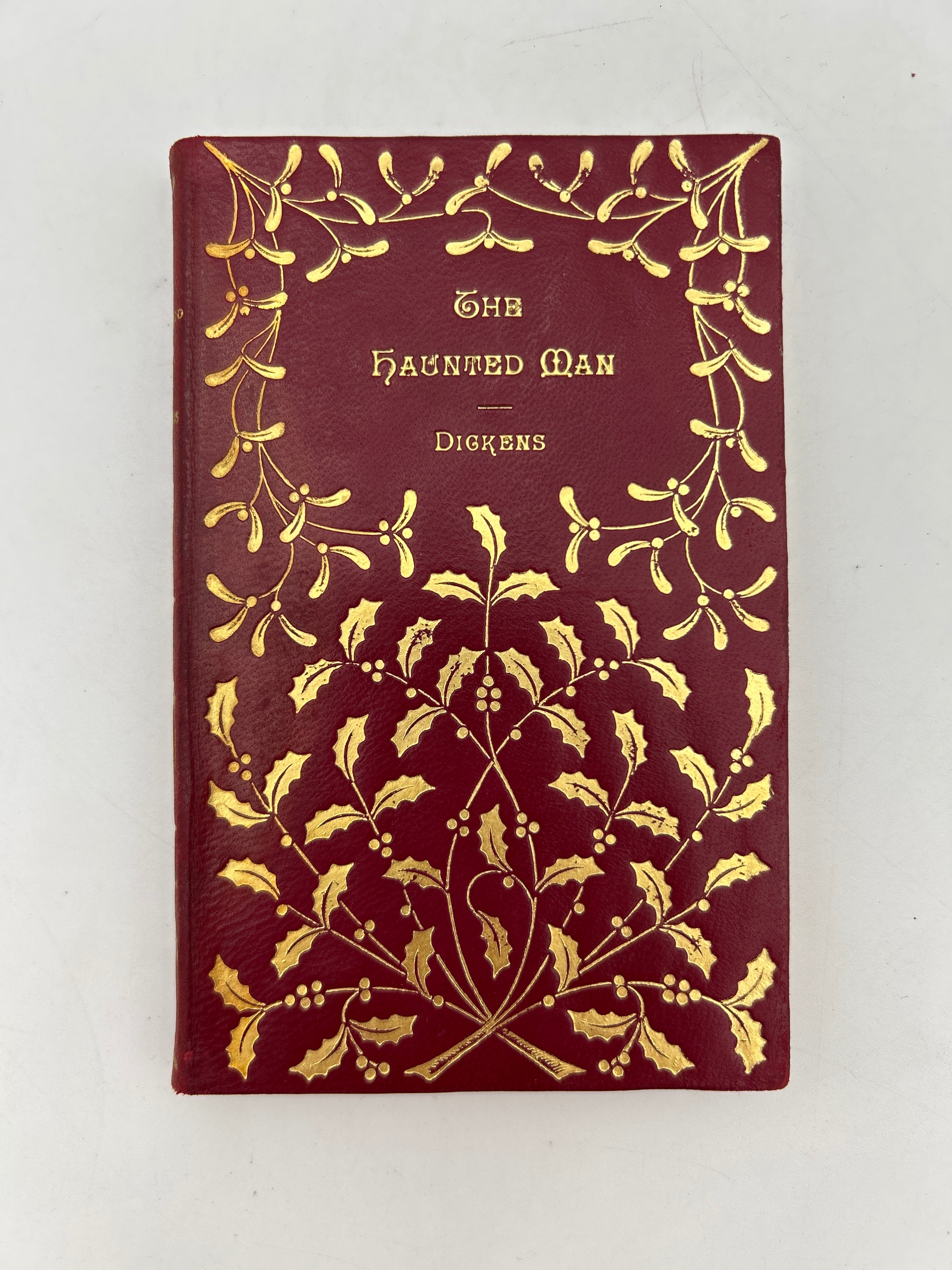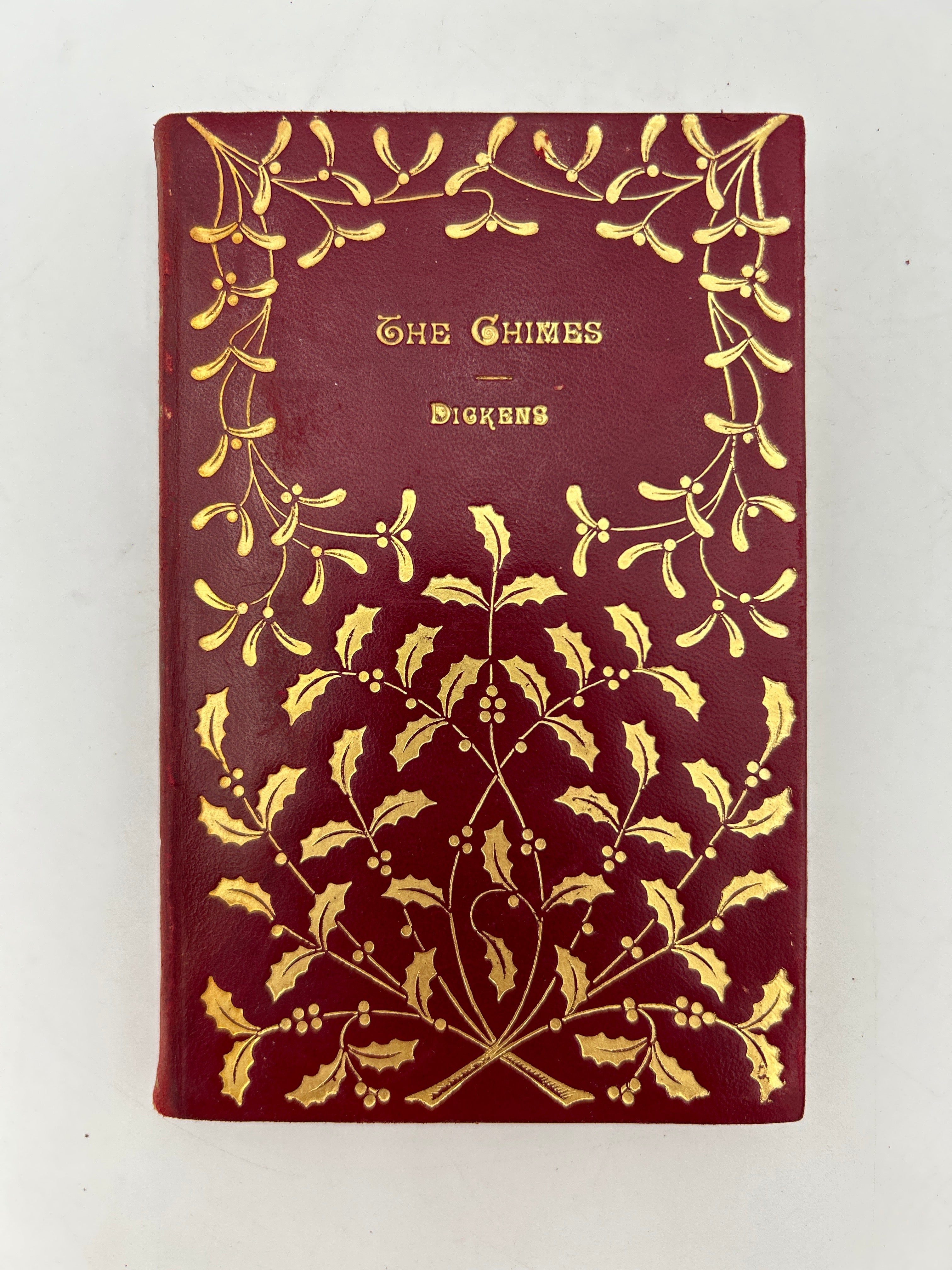 Red leather volumes with gilt holly leafs over the upper boards and spine of every book. Gilt lettering on upper boards and spines as well. All edges gilt. Each book has some sun fading to the spine and rubbing with slight fraying to the head and foot of the spines. Some superficial bumping to the points on some books. Fine condition overall.