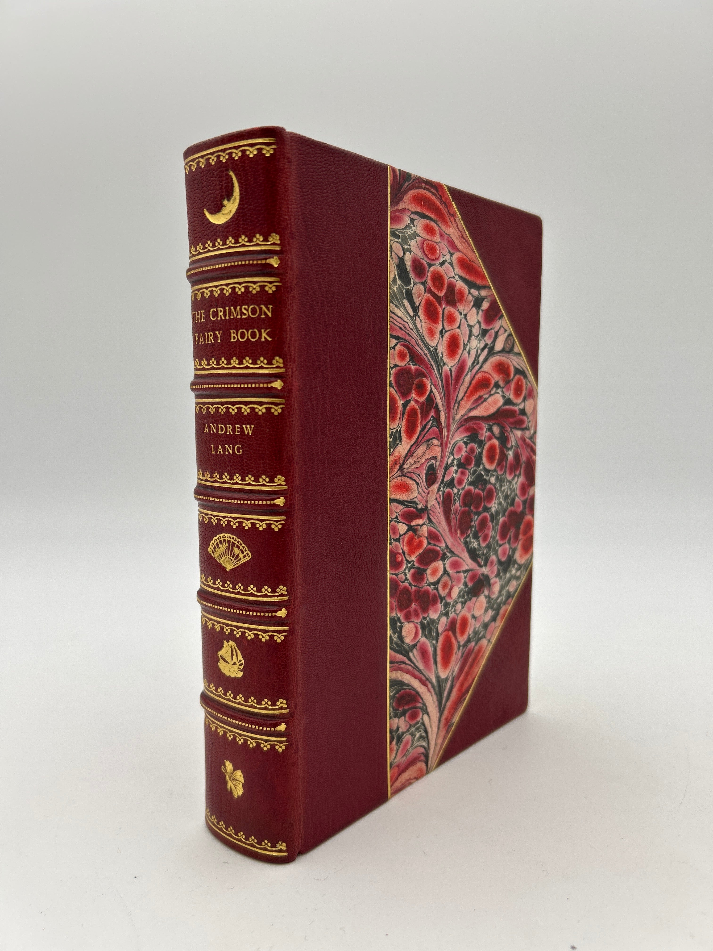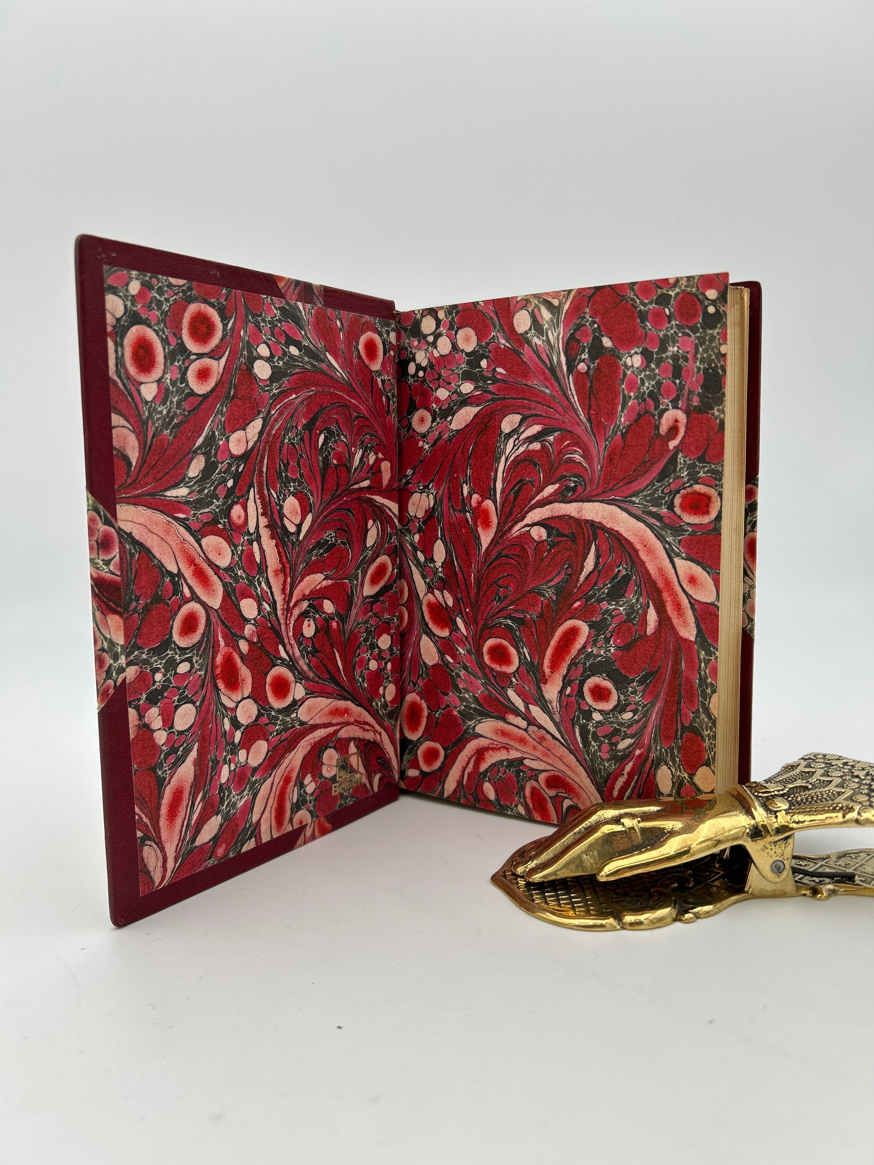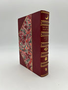 Red marbled boards with three quarter red leather. Five raised bands with gilt embossed elements in each compartment except the second and third which showcases gilt lettering. Marbled endpapers. Many illustrations throughout. Eight colored plates. Gilt top edge. Pristine condition.
