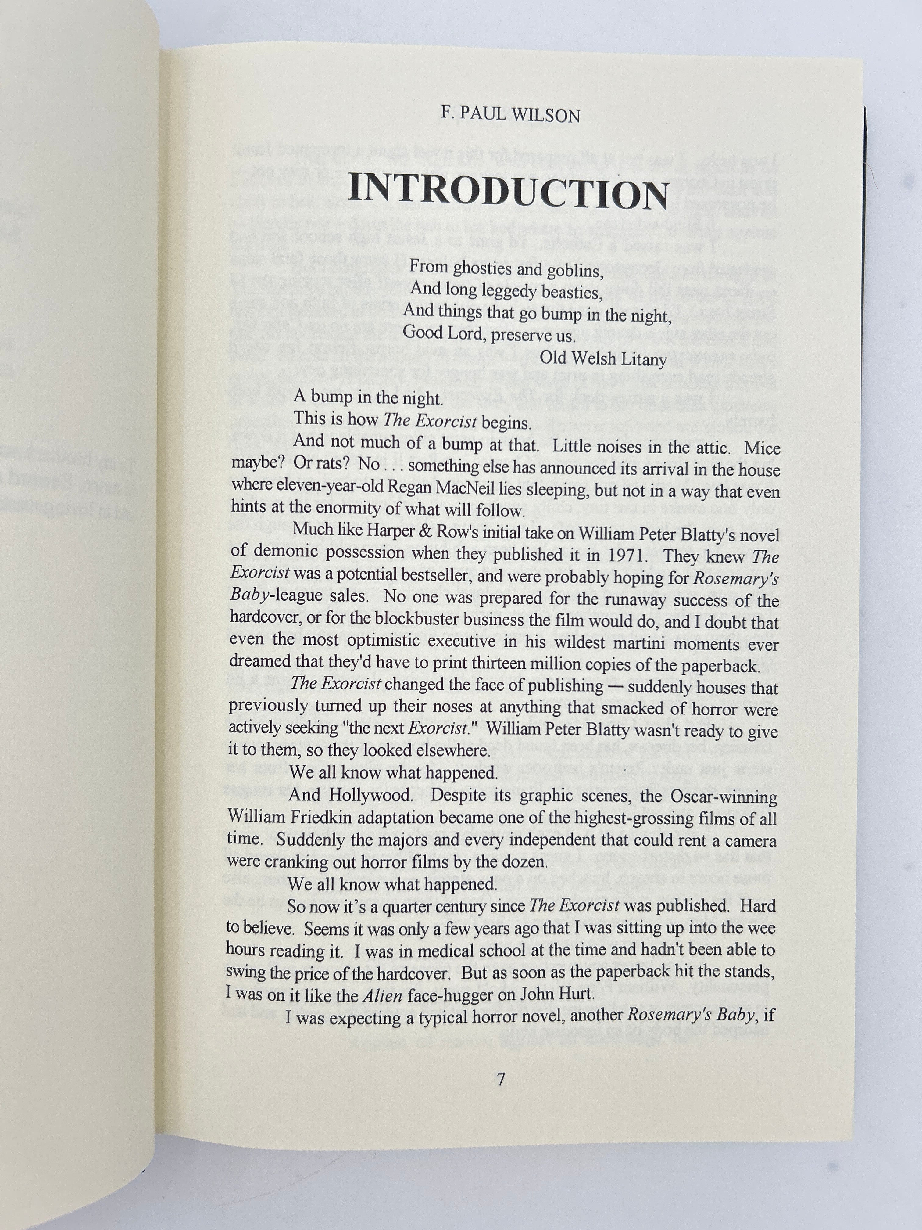 Black cloth hardcover with dust wrapper. Signed by William Peter Blatty, F. Paul Wilson, and Paul Clemens.