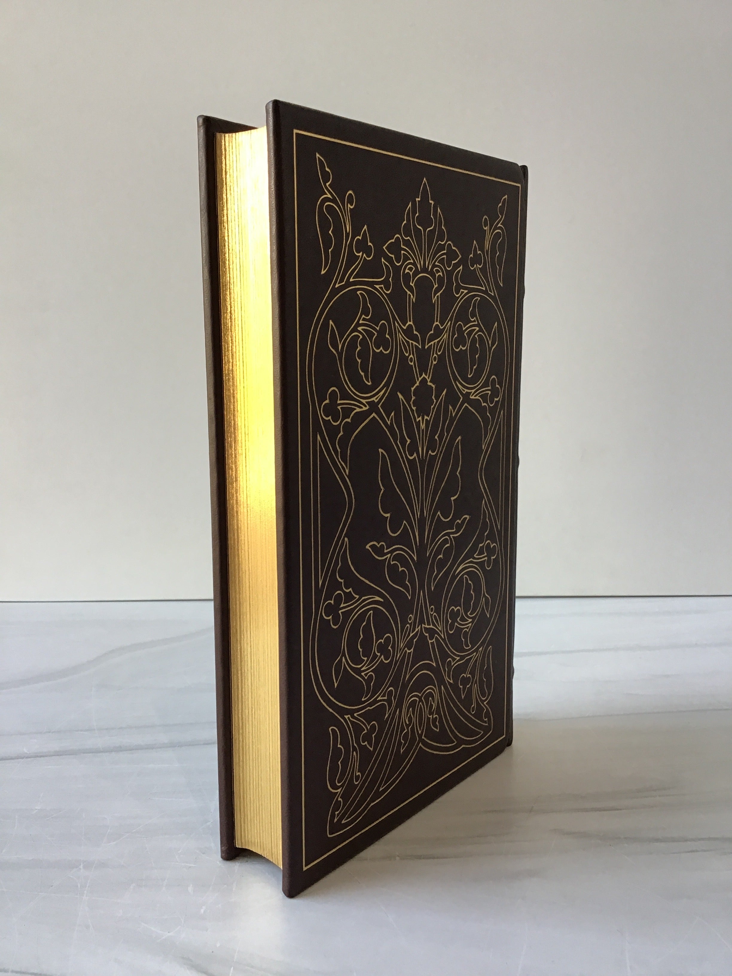 Brown leather hardback edition with gold embossed detailing on front and back cover and spine with gold lettering on spine, gold fore edge, three raised bands, and mulberry silk bookmark. Pristine Franklin Library edition.