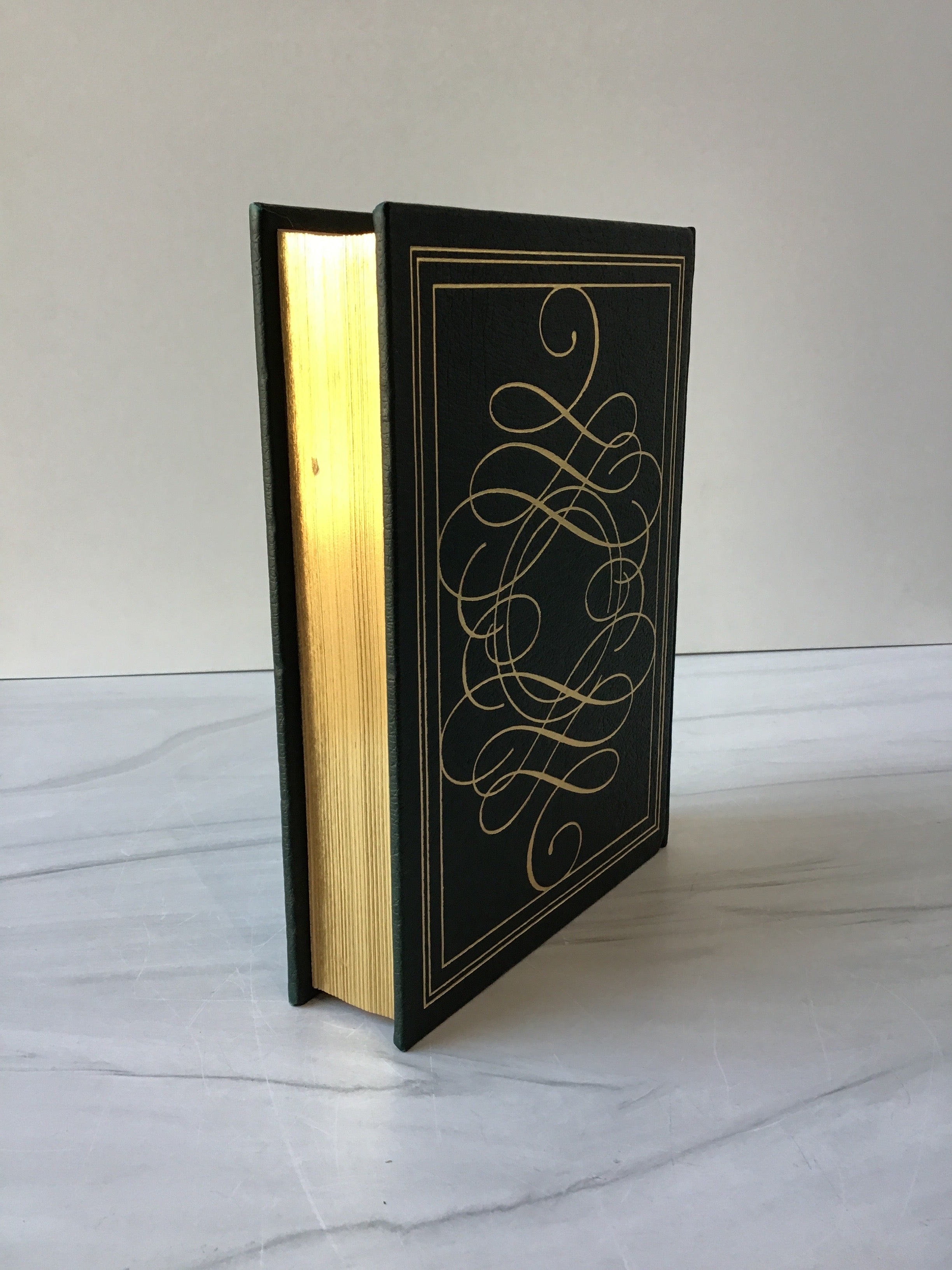 Green leather hardback edition with gold embossed detailing on front and back cover and spine with gold lettering on spine, gold fore edge, four raised bands, and green silk bookmark. Pristine Franklin Library edition with illustrations throughout.