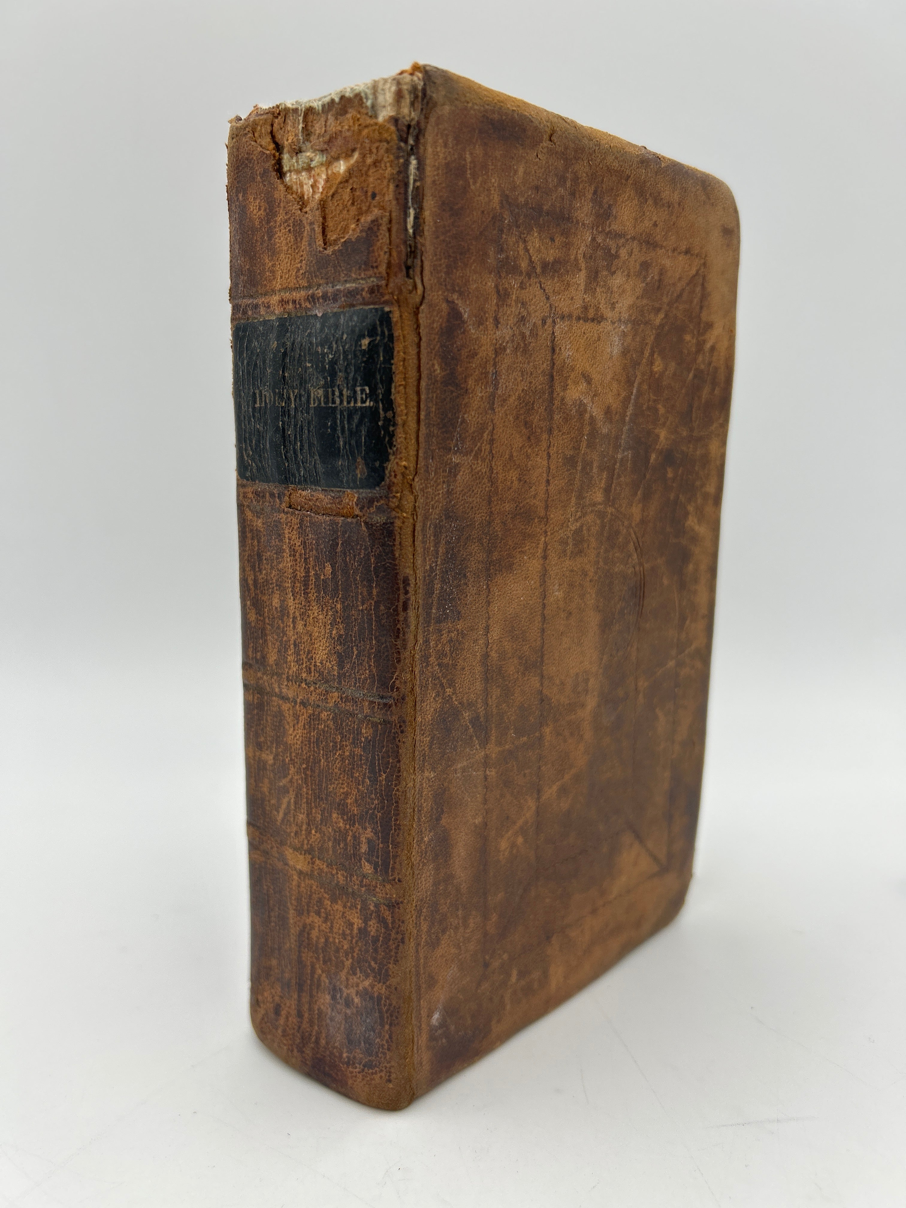 Brown leather edition of the bible, black title plate on spine, four raised bands on spine