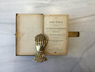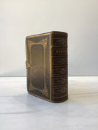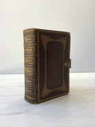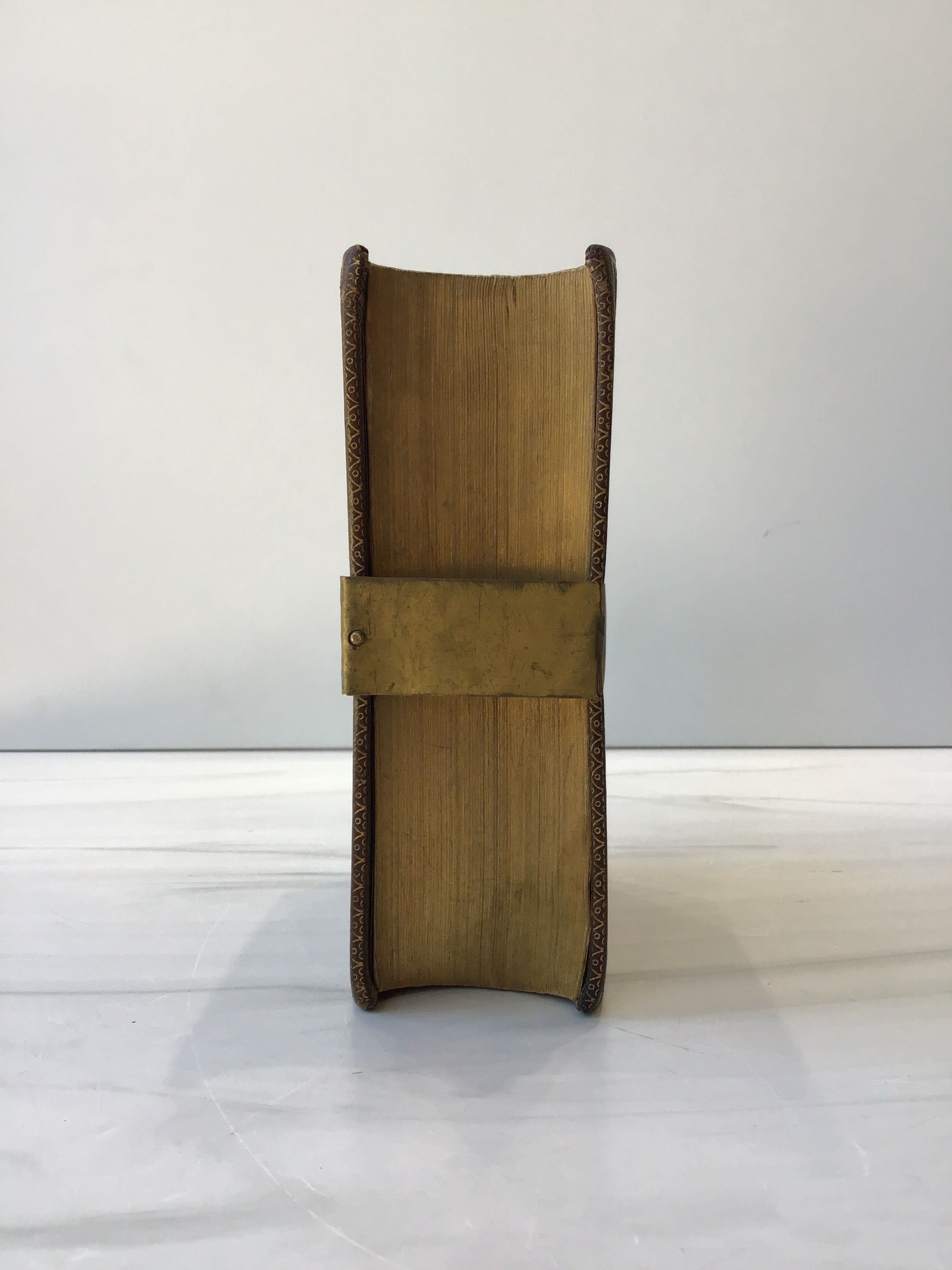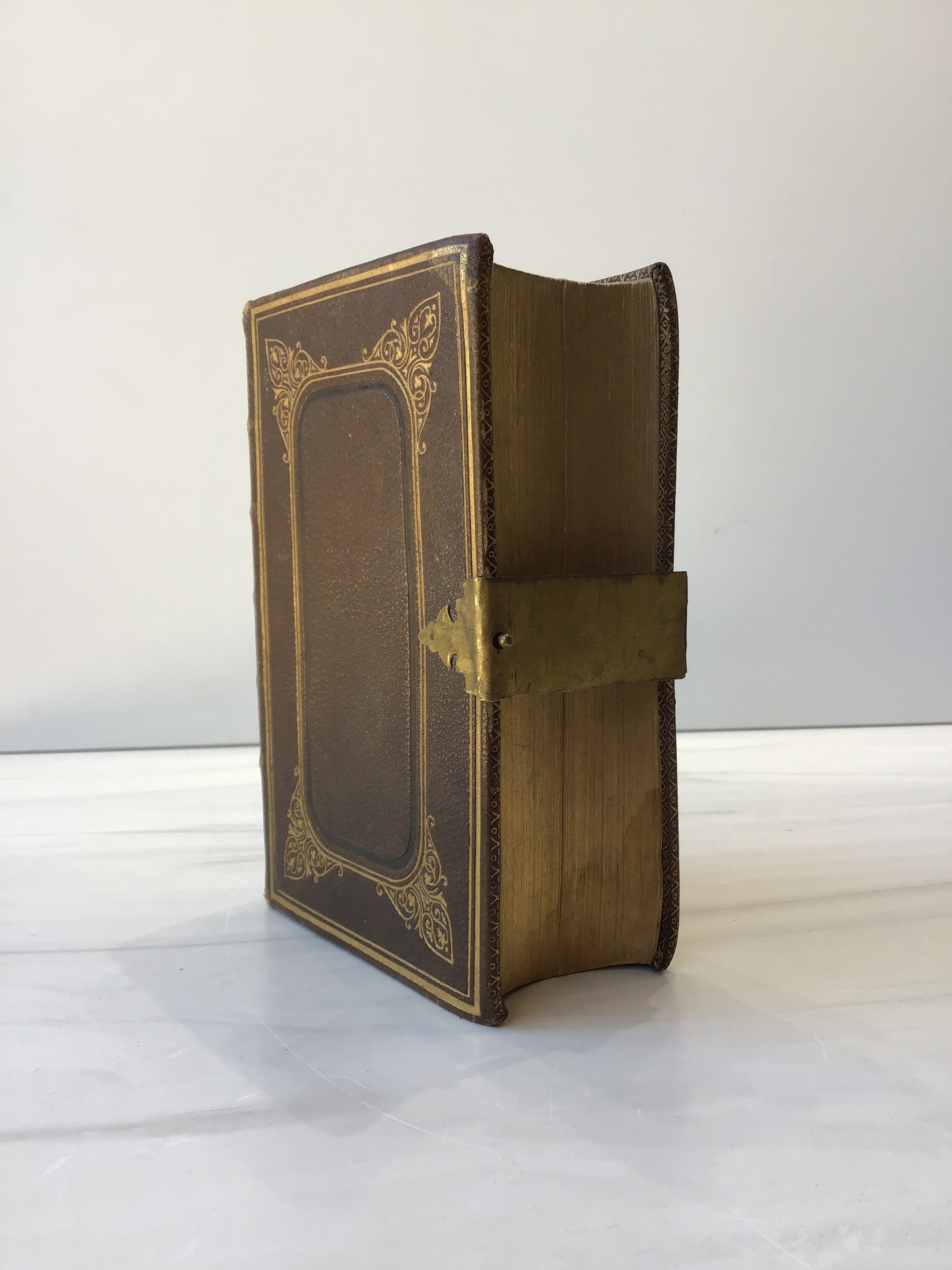 Brown leather pocket editon with gold tooling front, back and spine, five raised bands on spine, gold design tooled on front, back and spine, gold tool title label, three edge gilt, brass enclosure clasp, very fine condition.