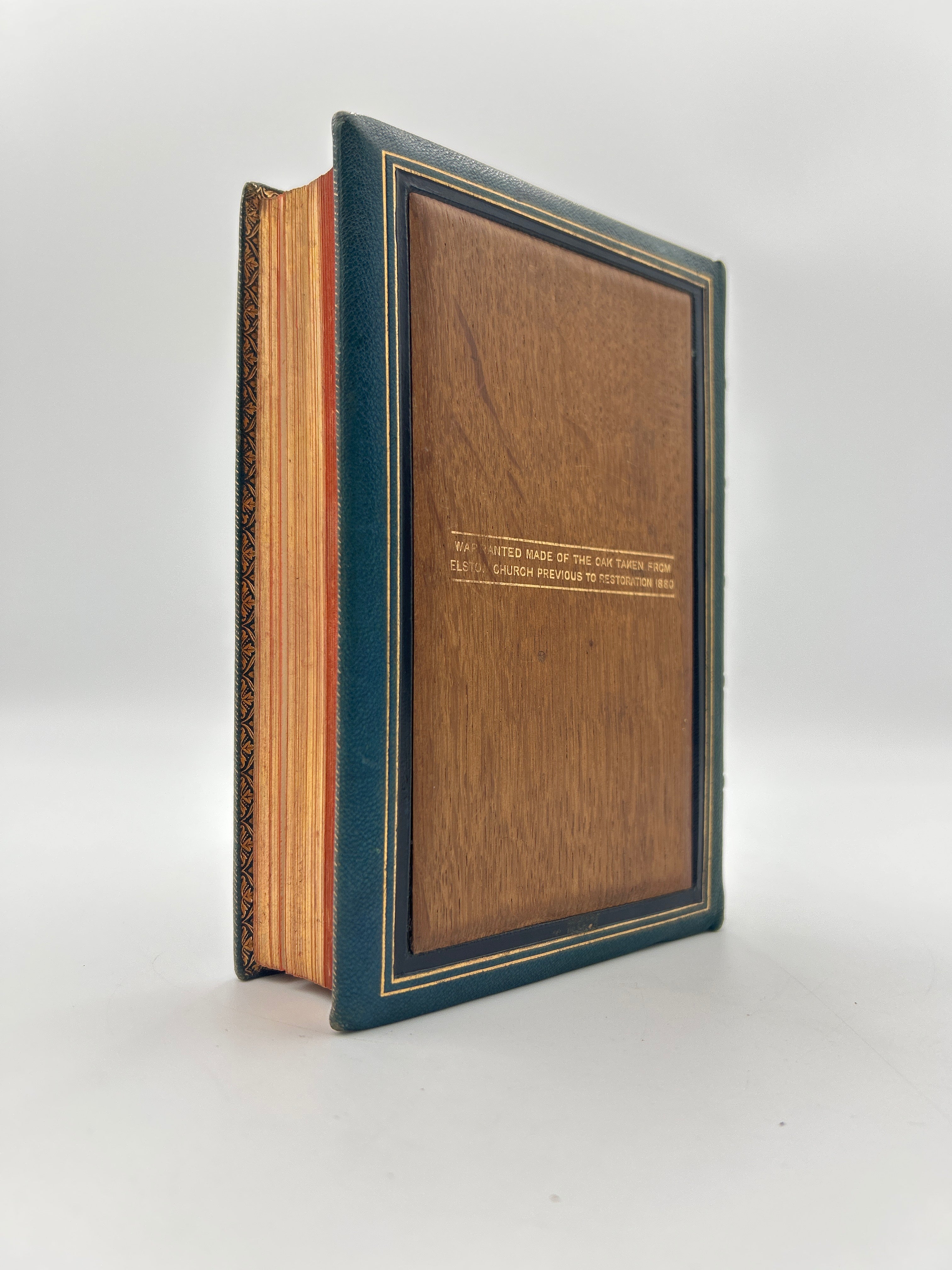 Blue Morocco minding with panel of oak set into both covers. Front cover features a pasted portrait of Bunyan. Stamped in gilt to boards and spine. All edges gilt. Illustrated throughout. Some fading to spine and slightly foxed. Very good condition.