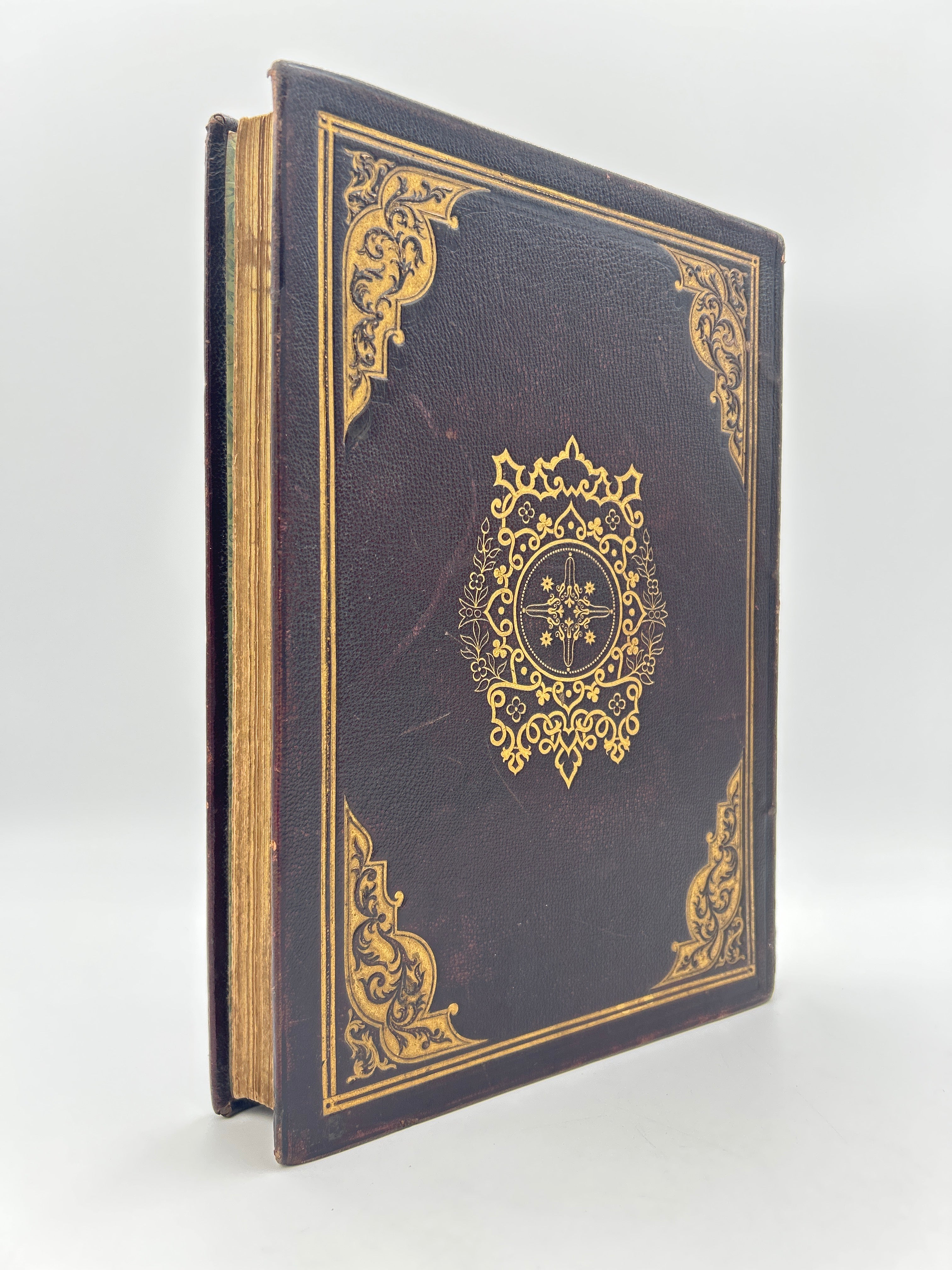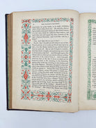 Maroon cloth illustrated and decorated in gilt with hilt corner pieces embossed with red, green, and blue decorative flourishes. All edges gilt. Green endpapers decorated in gilt. Chromolithographed title page. Illustrated throughout and every page has a decorative border. Corners slightly bumped with rubbing to joints. Minimal soiling to interior. Very fine copy.