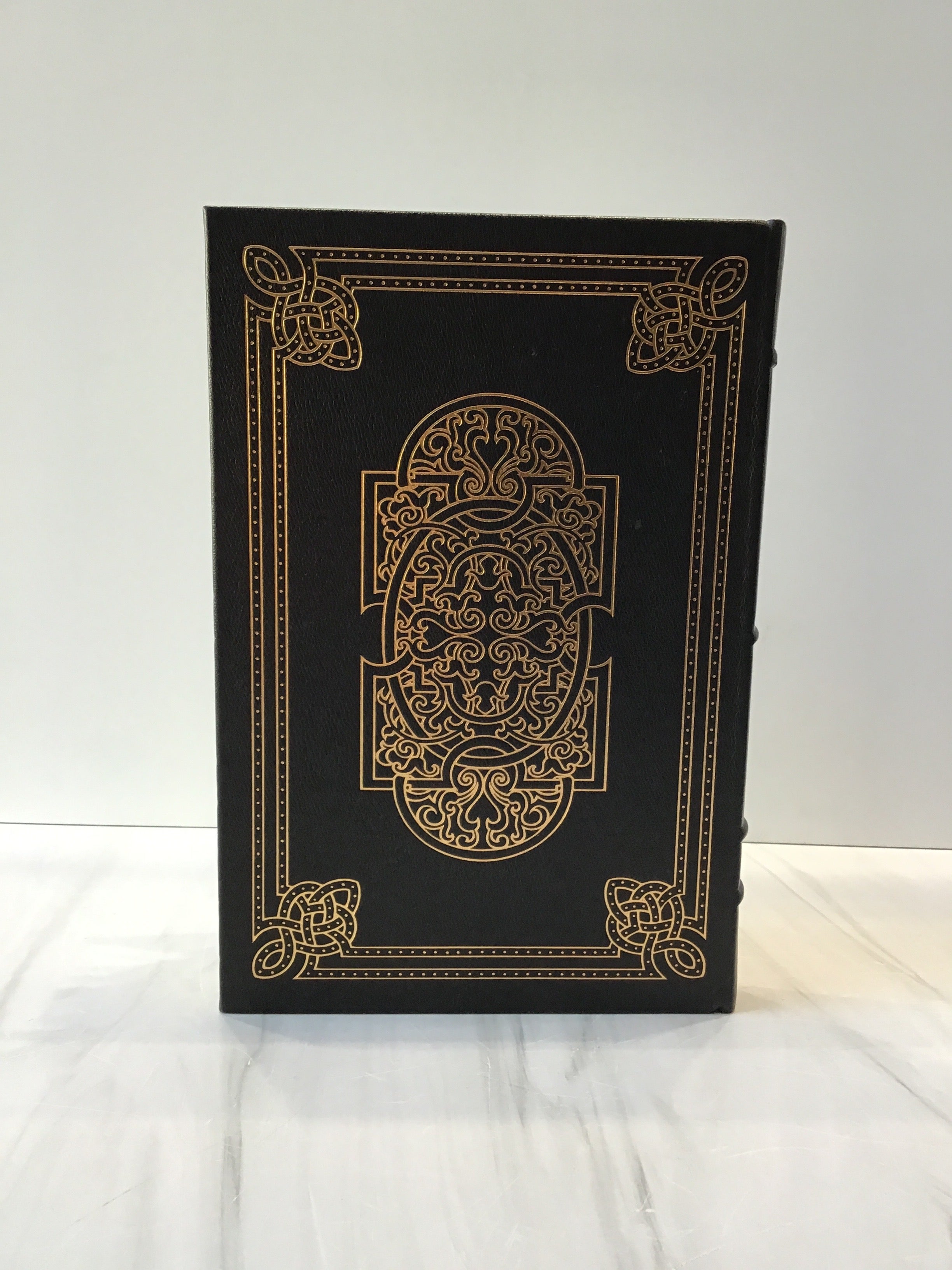 Black leather bound edition with gold embossed detailing on spine, front, and back cover as well as gold embossed lettering on the spine. Gold fore edge with lilac purple silk bookmark and four raised bands. Pristine Franklin Library Edition with illustrations throughout.
