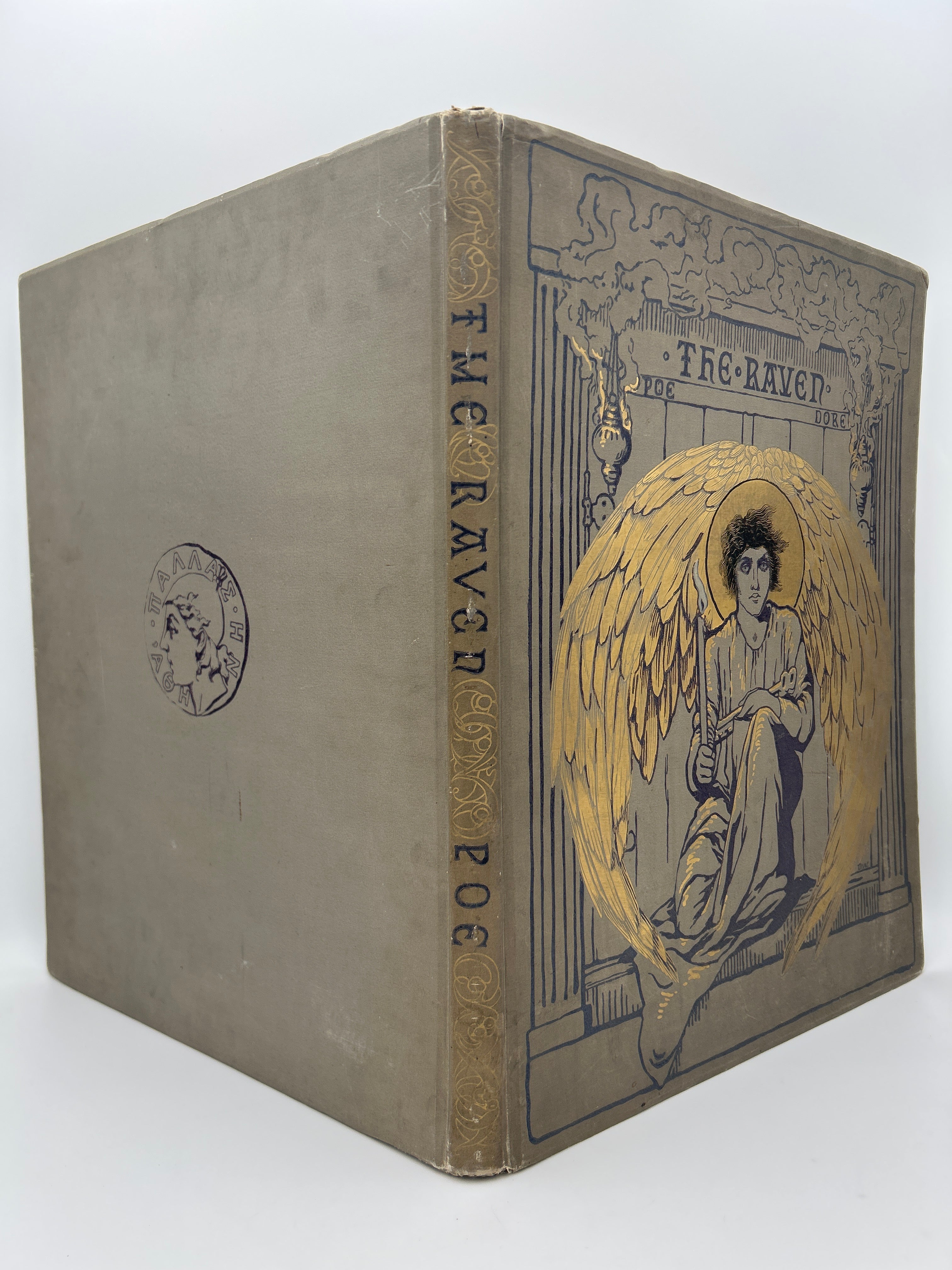 Large format edition with gray canvas boards and lavishly illustrated upper board with gilt detailing and black stamping, beveled edges, and brown endpapers. Gilt decoration and black lettering on the spine. All edges gilt. Rubbing to the extremities and minor bumping to the corners. Gift inscription on a prefatory blank leaf dated Dec. 29, 1885. 25 leaves of plates, which are separated by leaves with printed excerpts front the poem. Rare to find this edition still intact. Very Fine condition overall.