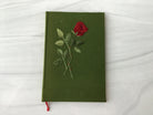 Beautiful green fabric binding with embroidery of rose on front cover.