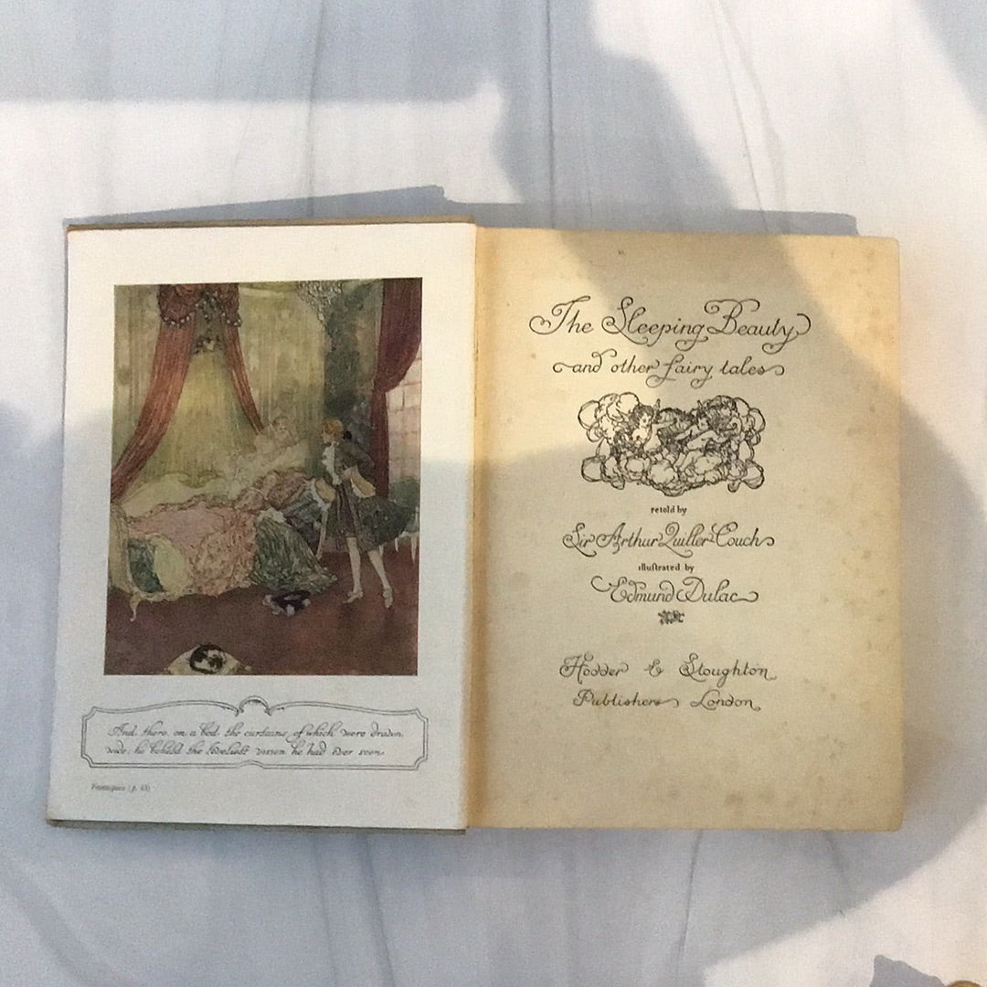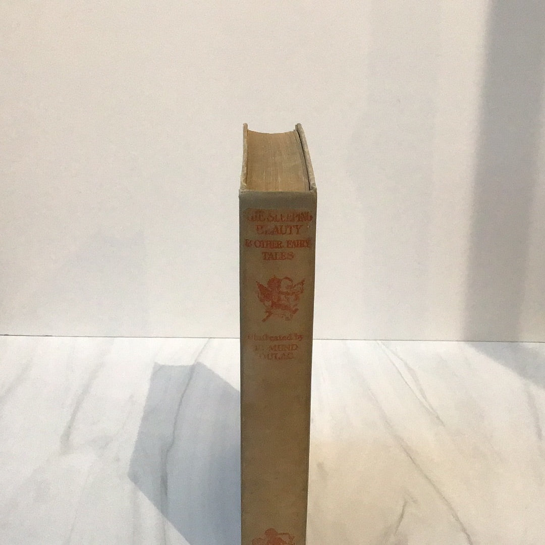 Tan binding with enchanting red cherubs on front and spine, illustrated by Edmund Dulac, 12 color illustrations with large font for young readers.