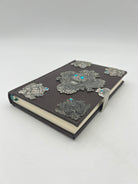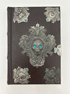 The book itself is bound in brown leather, with a faux hand-tooled cover embossed to simulate age and magical significance. A large, metal skull-shaped clasp with crossbones adorns the front, functioning as both a closure and a striking decorative element. The spine is also decorated with raised bands and elegant tooling, designed to resemble an old medieval tome one might find in the Restricted Section of the Hogwarts Library.