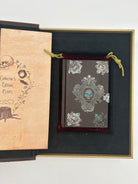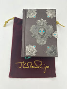 The book is housed in a purple velvet drawstring pouch, giving it a sense of magical secrecy and preciousness. This pouch fits inside a custom-designed clamshell case resembling a Hogwarts library book, complete with metallic foil embossing and a ribbon pull-tab. The case itself opens like a treasure chest, lined in satin, and is decorated with silver rune-like symbols and magical motifs that enhance the feeling of a relic from the wizarding world. Additional prints included in inner cover of custom box.