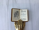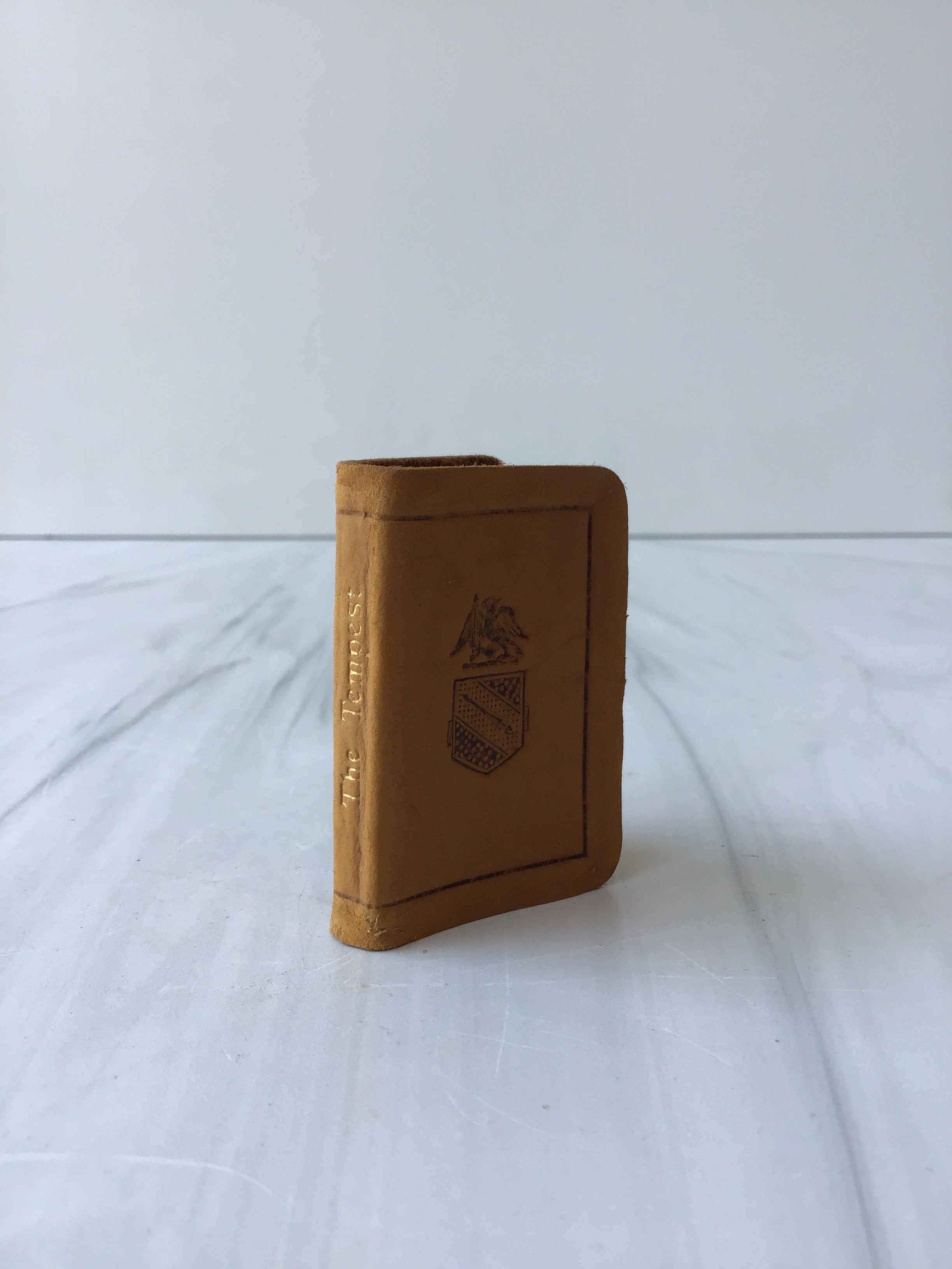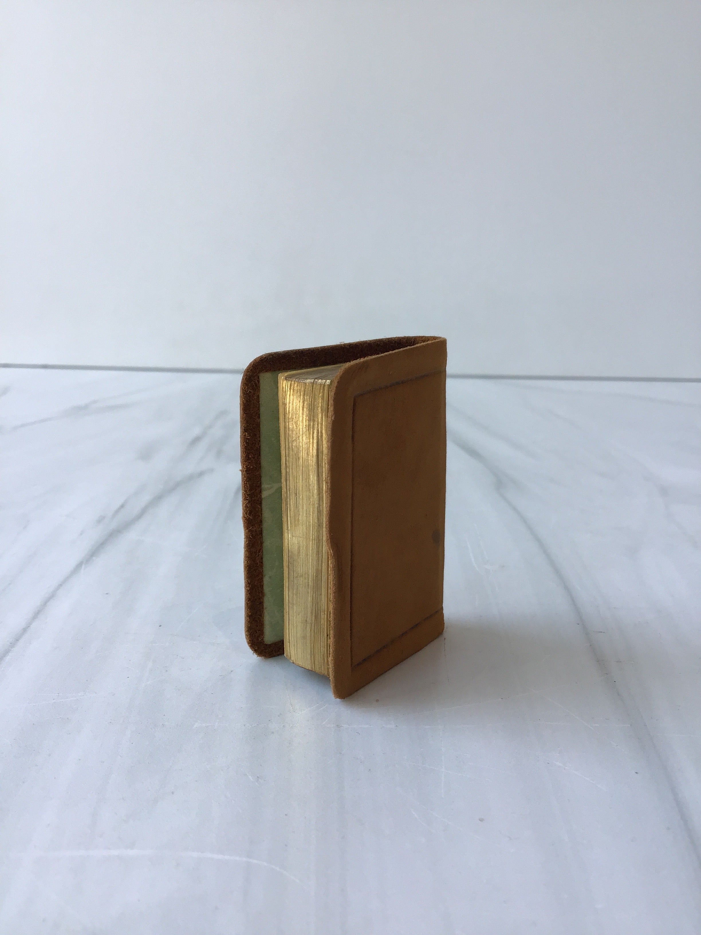 Miniature rust leather bound book, design embossed on front cover, three gold edge, good condition.