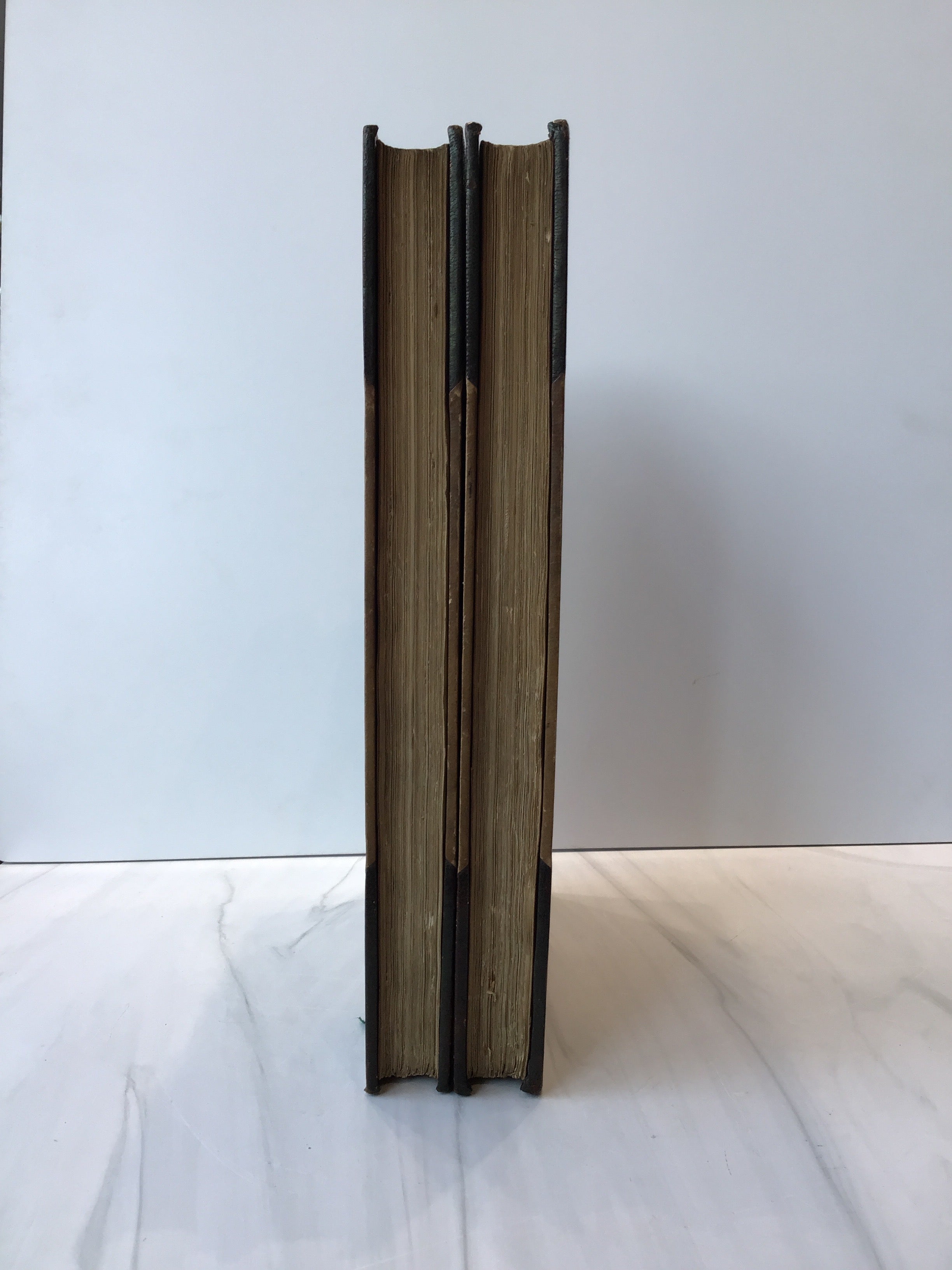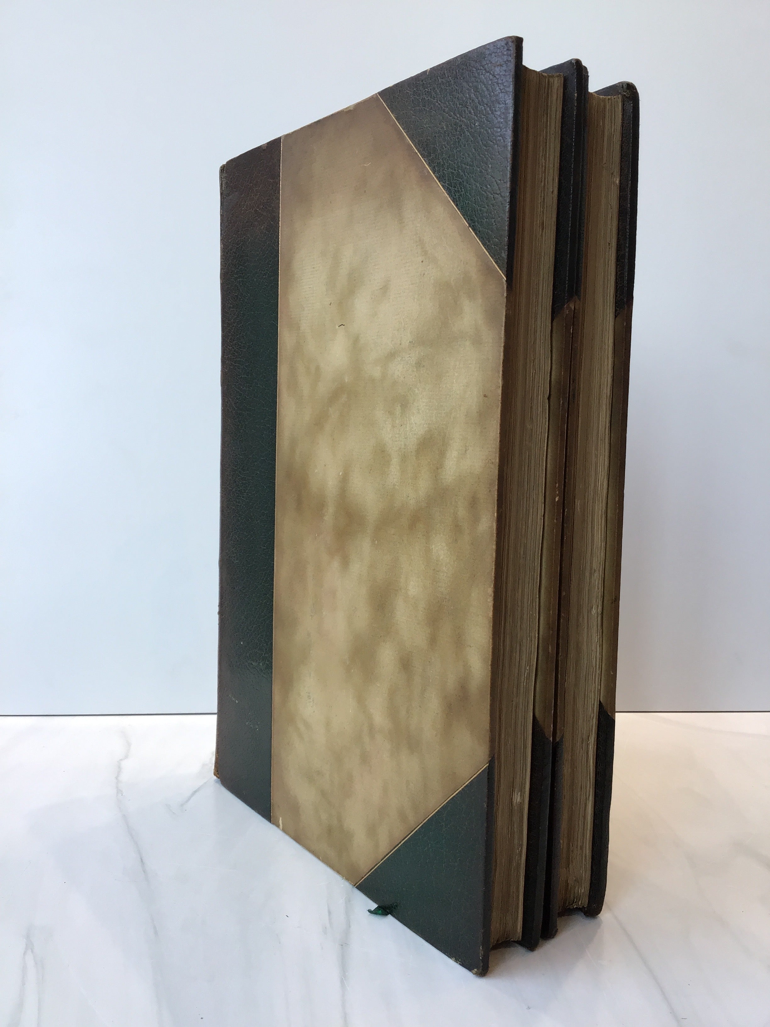 Two beautiful large volumes, 3/4 leather and marble paper, spines faded from emerald green to brown with gold tooling etched into them, intact, letter from Alexandre Dumas Fils, end papers marbling, very fine condition.