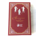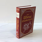 Burgandy soft faux leather cover with white and gold embossing on front, sides and back. Includes silver illustrations on front and back of book.