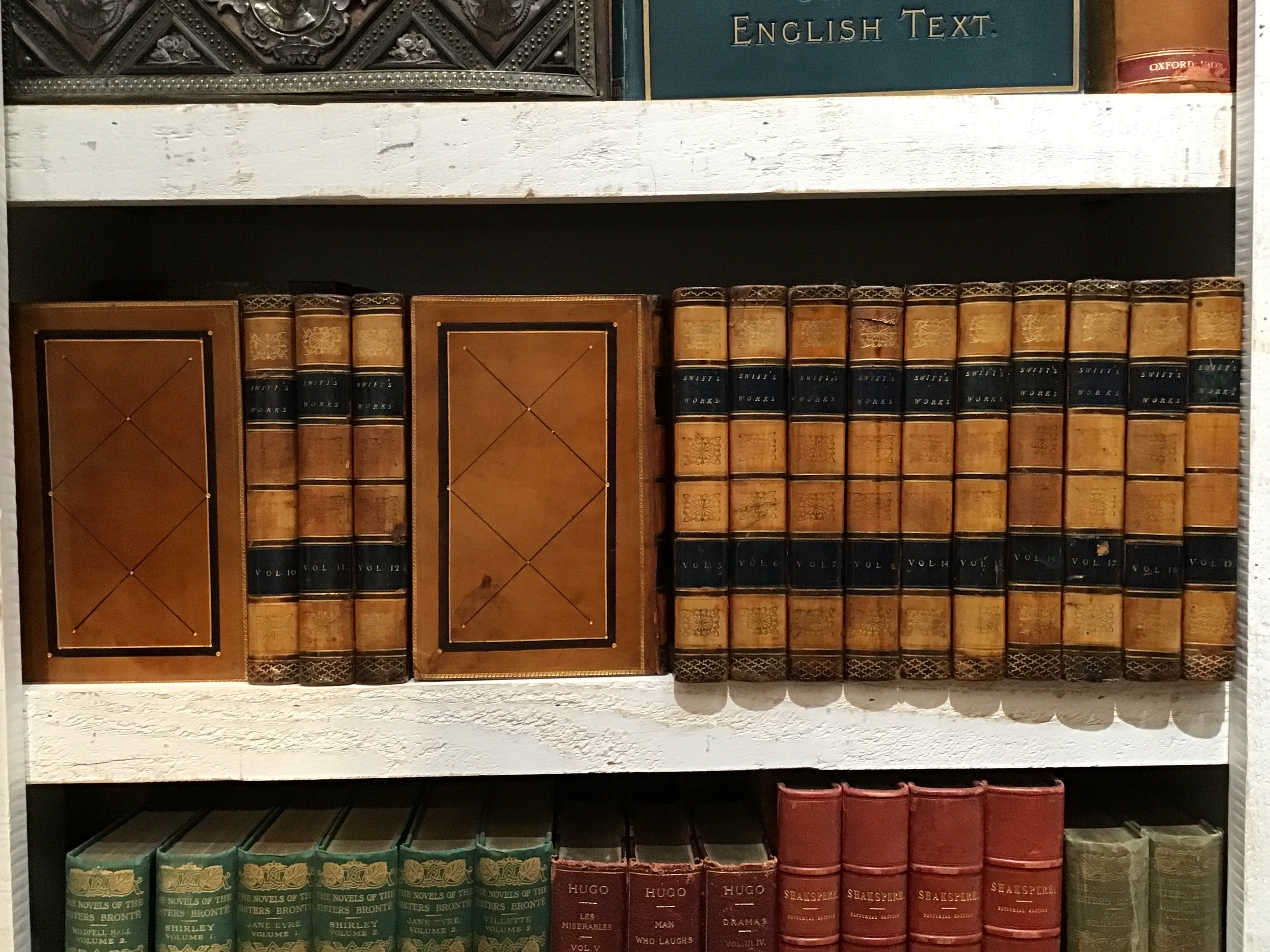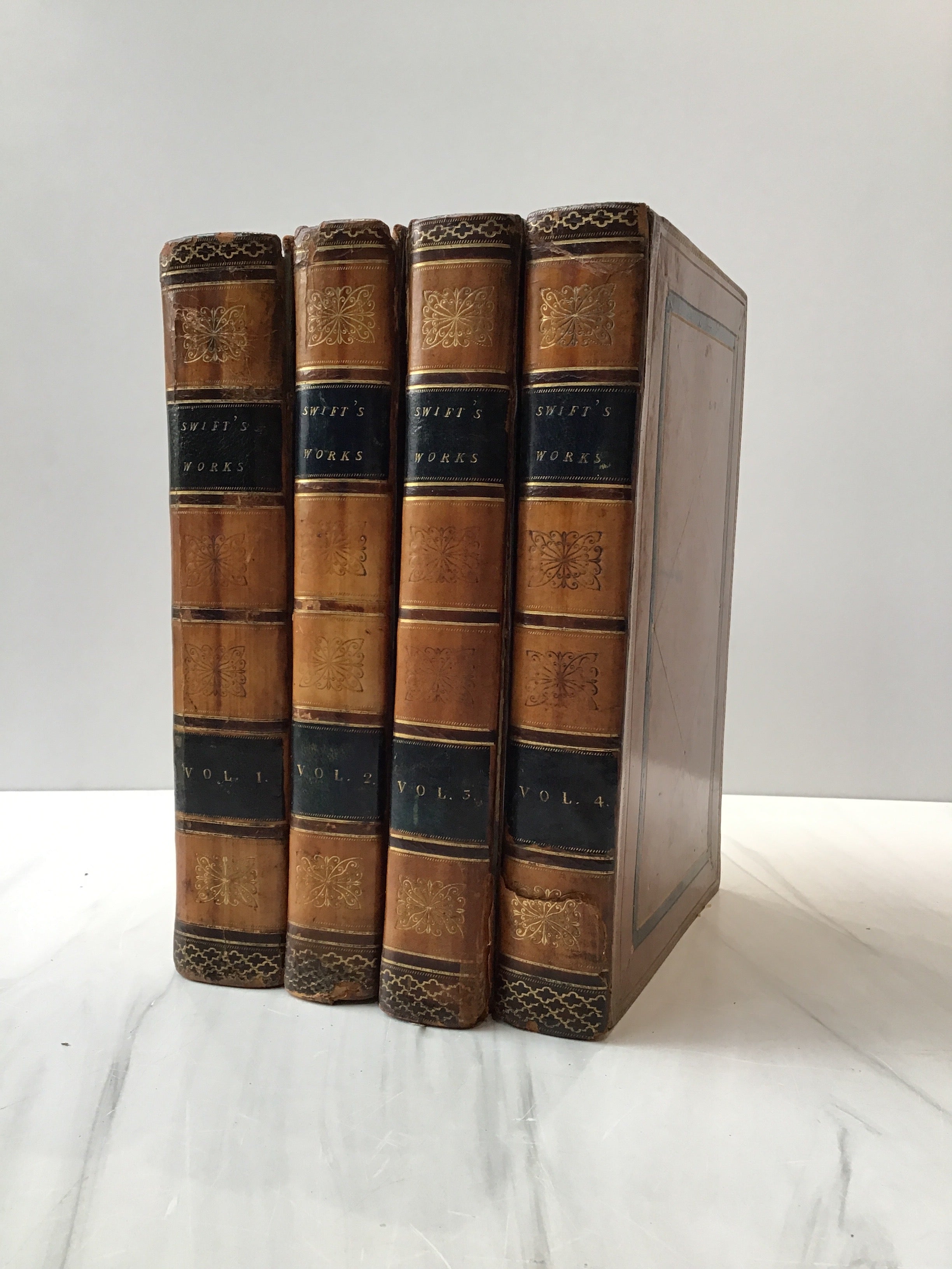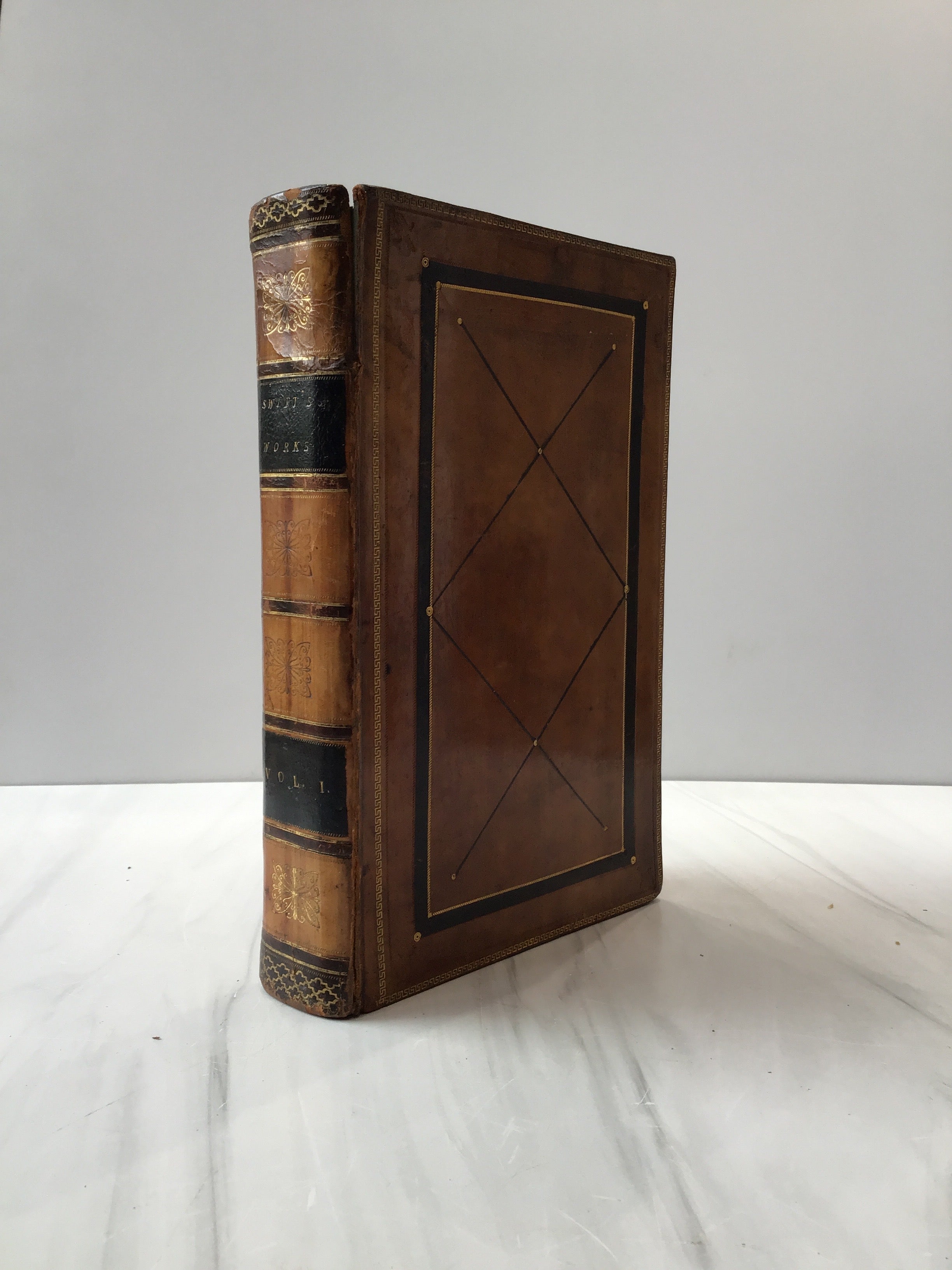 Nineteen beautifully leather bound caramel color with black and gold design front, back and spine, black name and vol numbers on spine, slight cracking on top of some spines, otherwise very good condition.