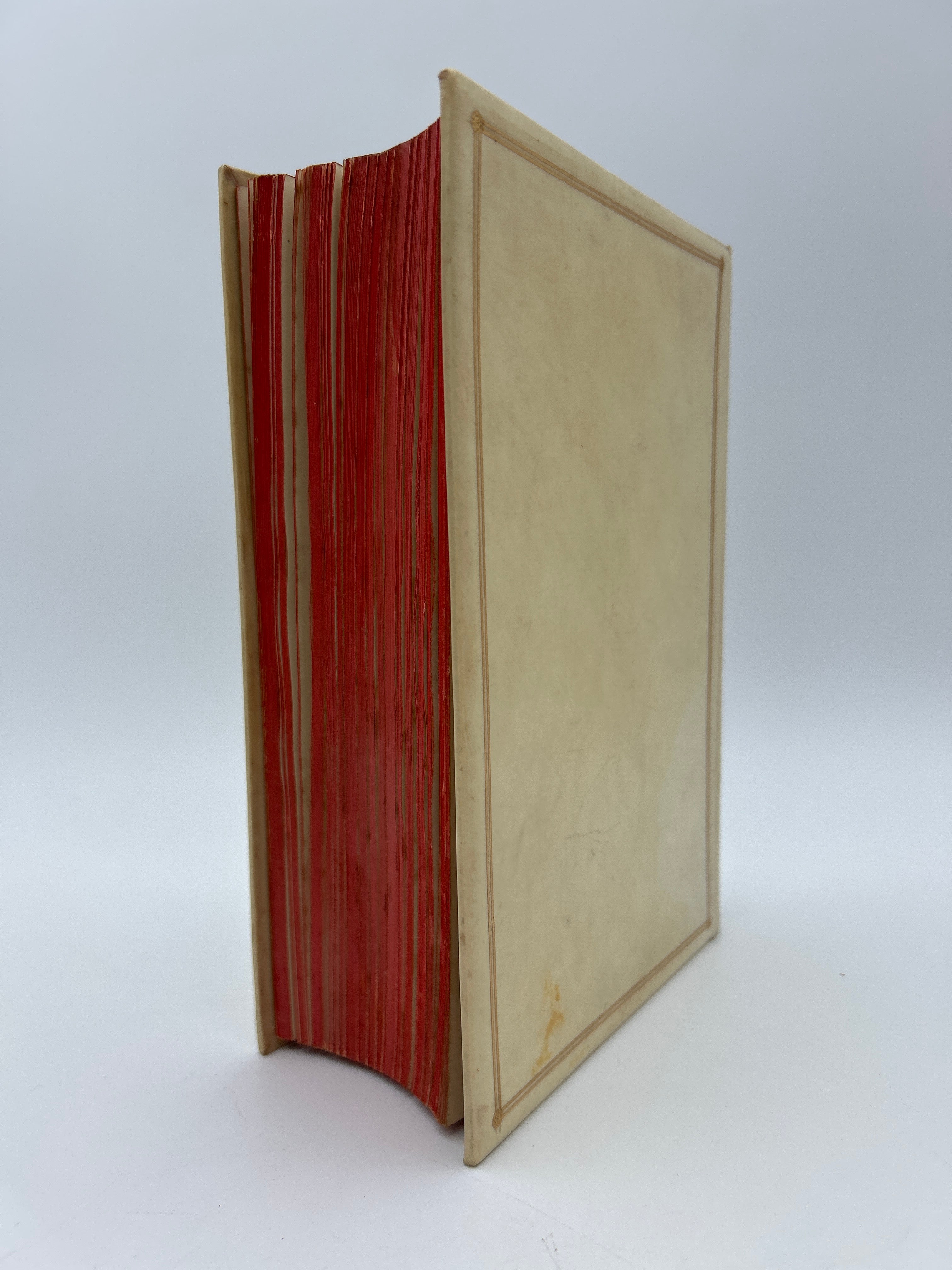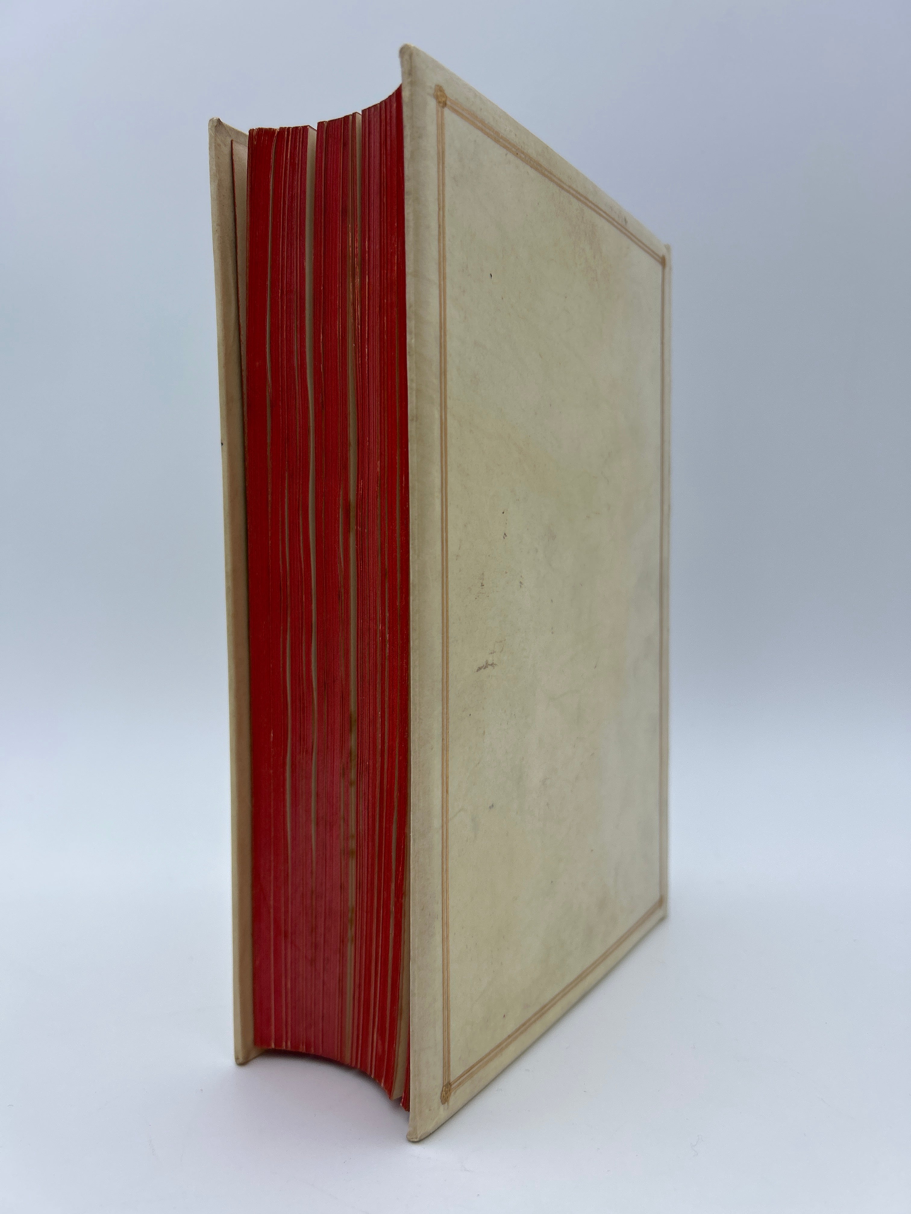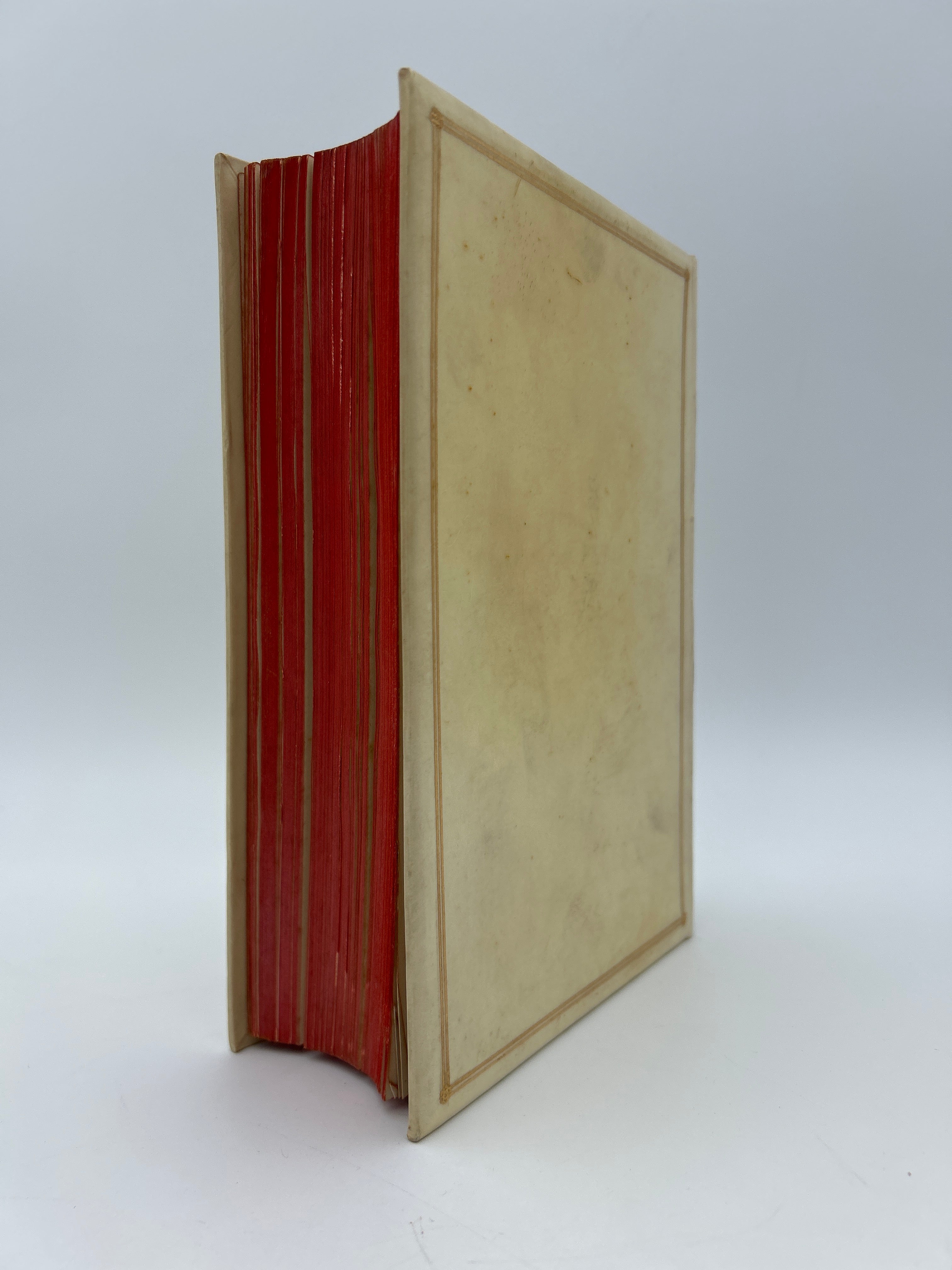 White vellum binding with red edges and gilt framing on upper and lower boards. Red, green, and another red label on the spine with gilt lettering and a few gilt decorative elements. Marbled endpapers and a few images throughout. Very fine condition.