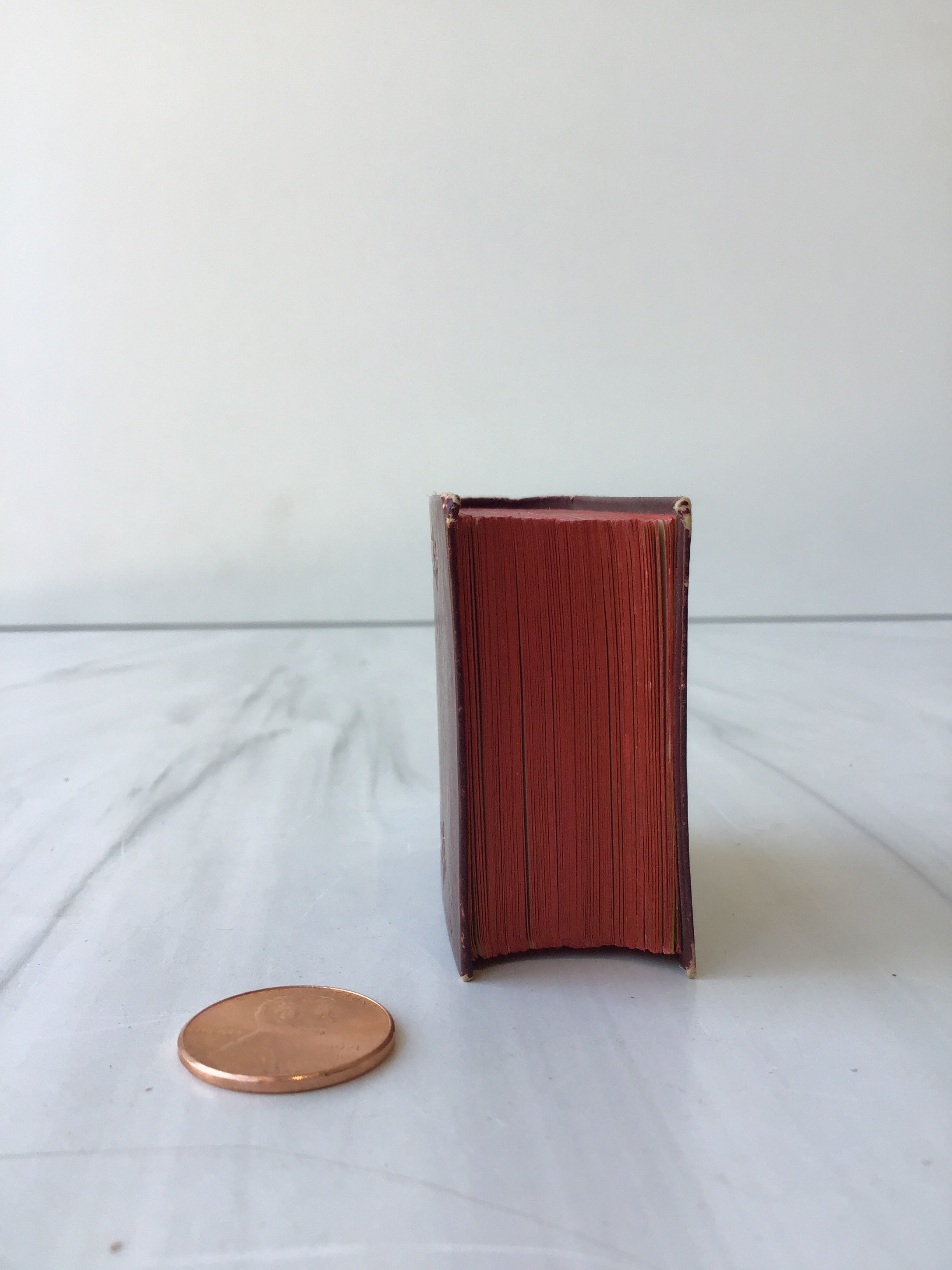 Thumb bible, burgundy with gold tooling front, back and spine. red three edge, inside page is printed "To His Illustrious Highness William Duke of Gloucester, Knight of the Most Noble Order of the Garter.", excellent condition.