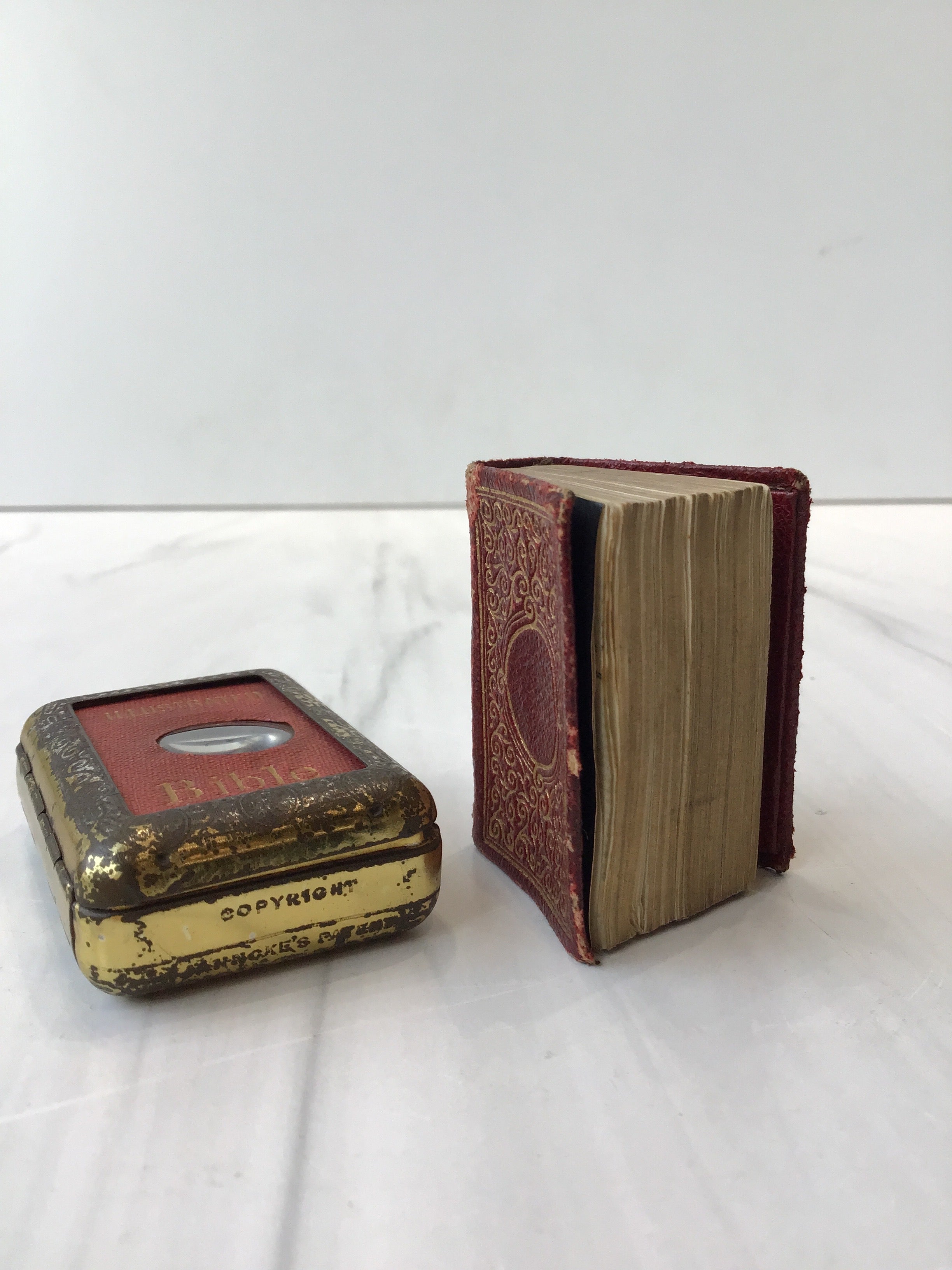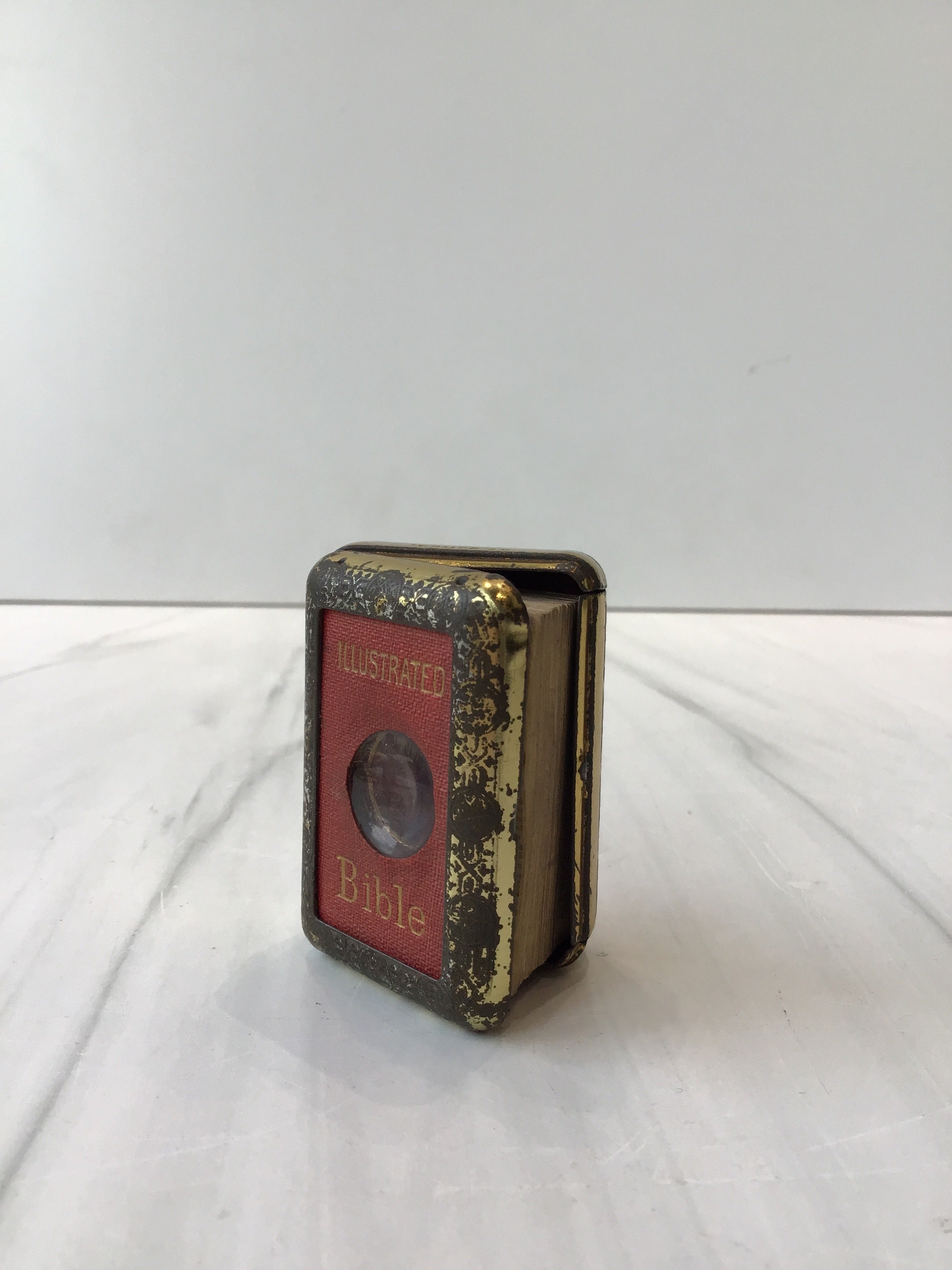 j, 1899 Illustrated miniature bible enclosed in metal case with magnifying glass