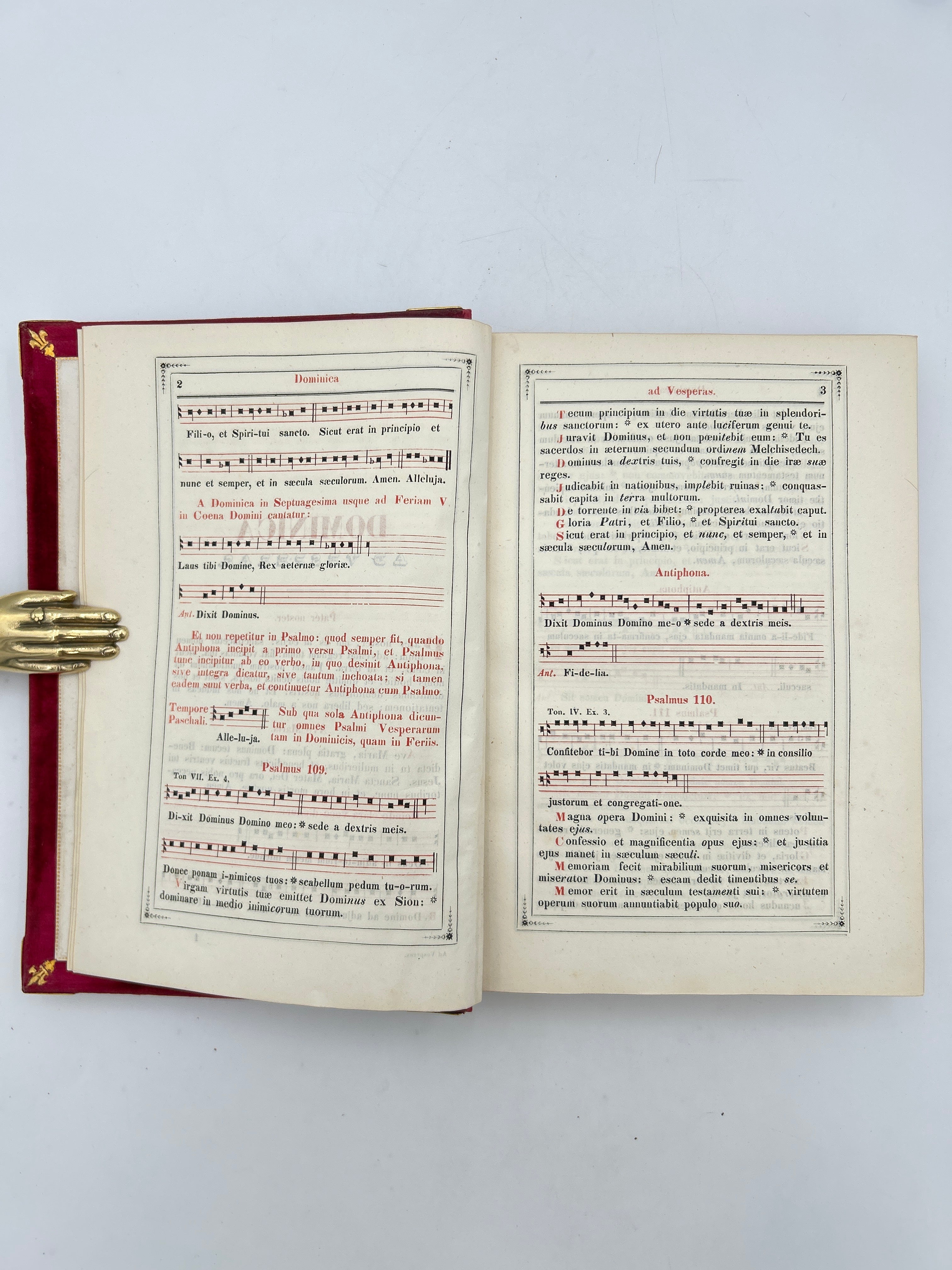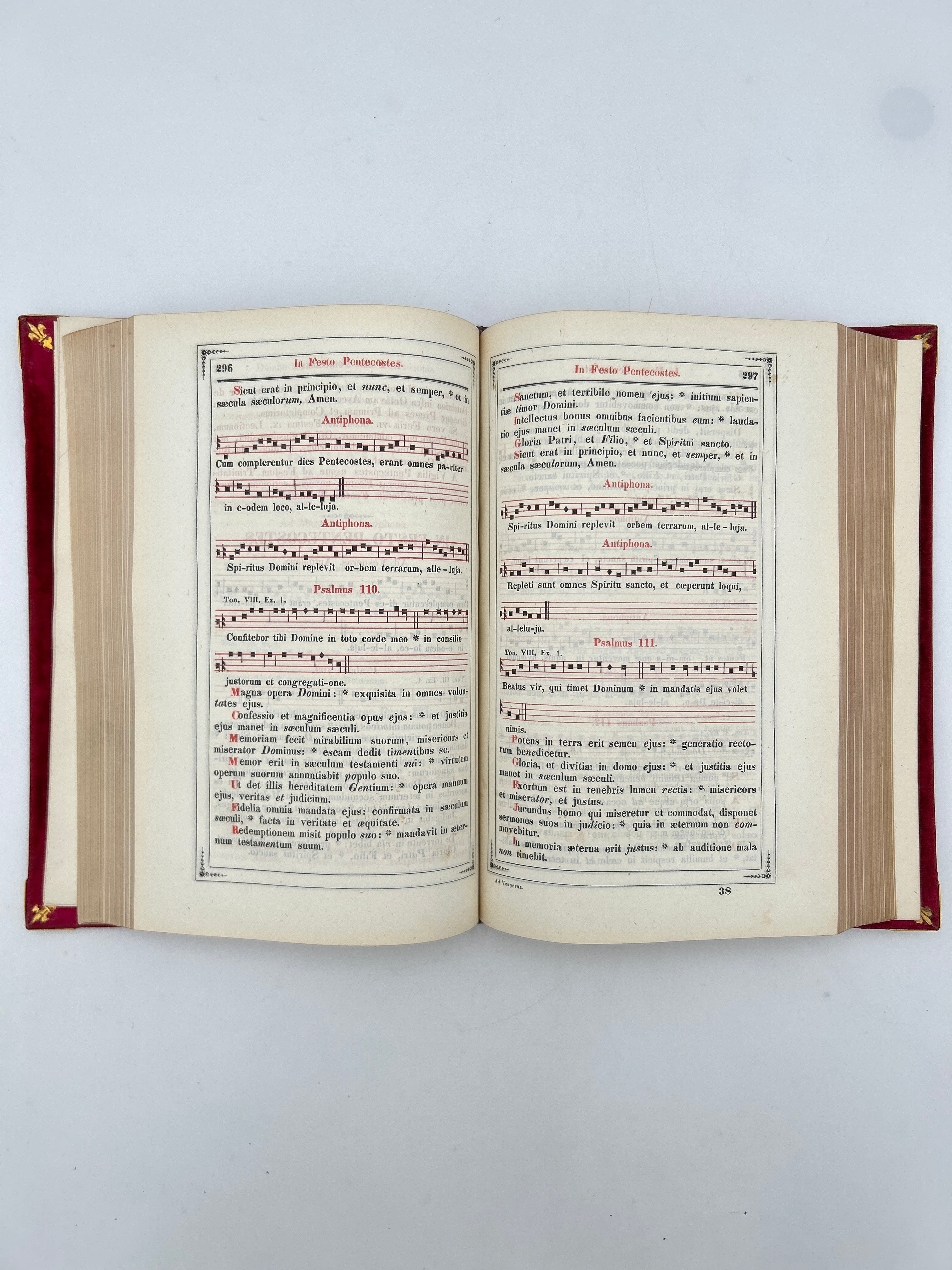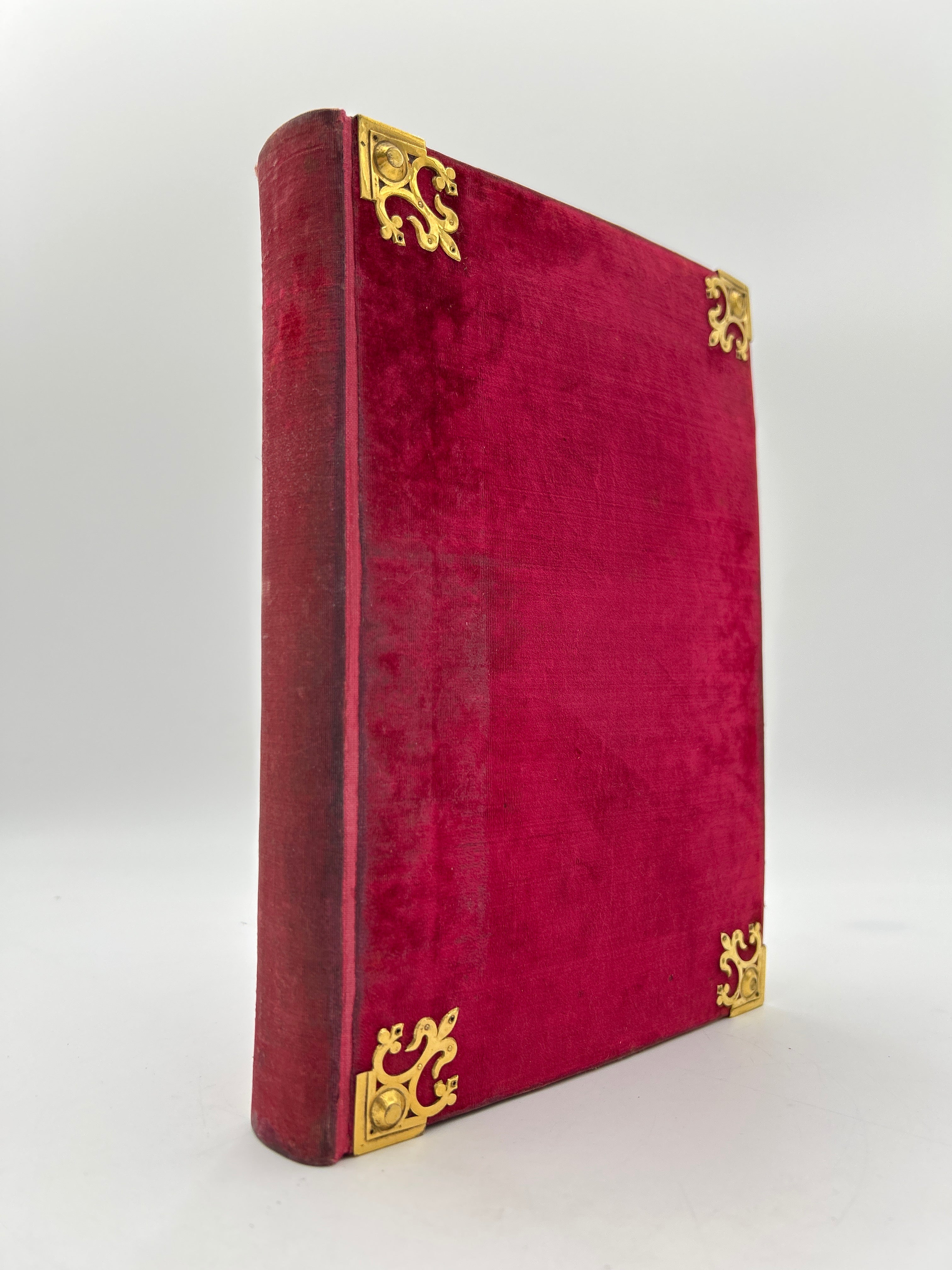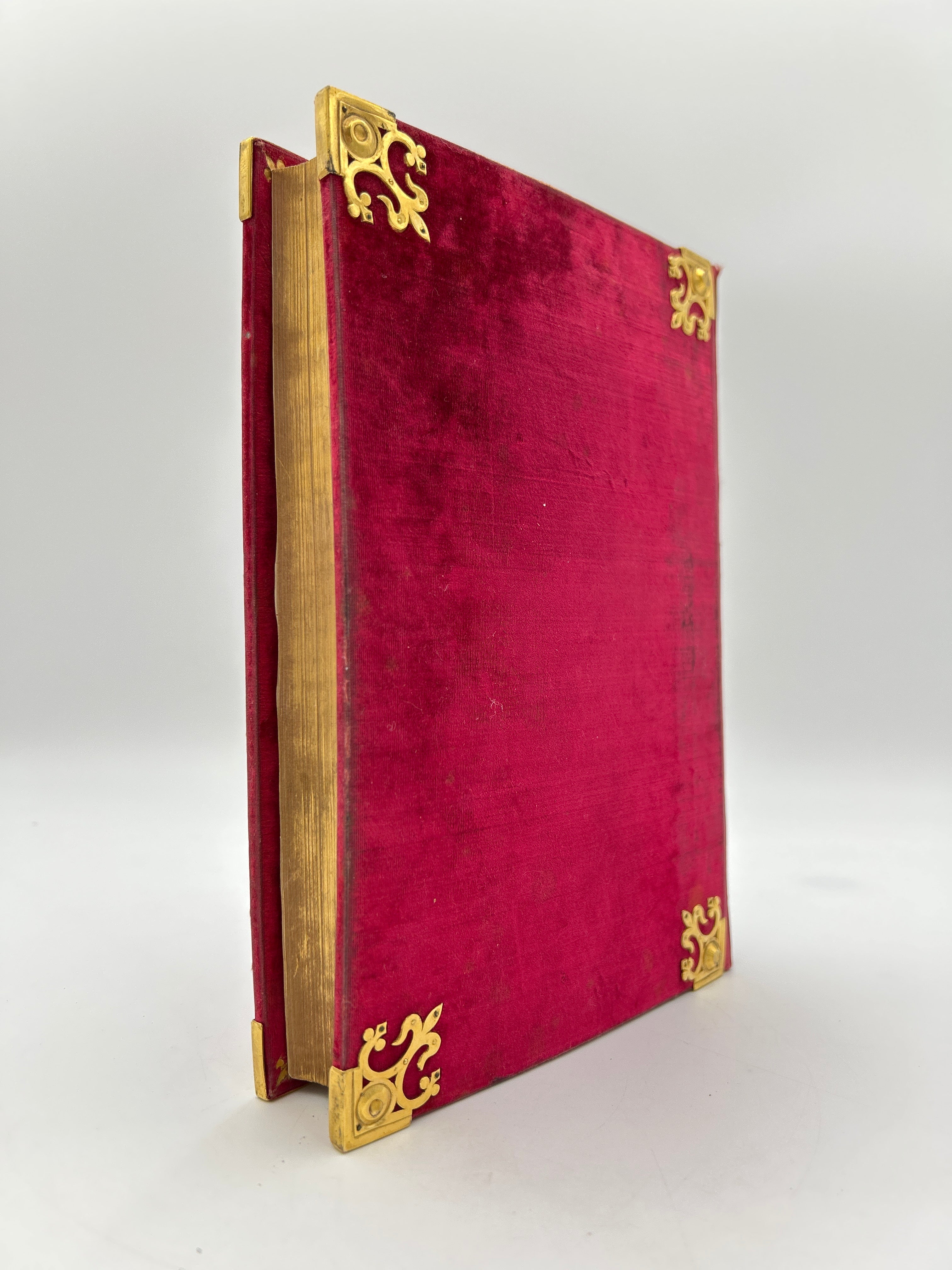 Beautiful red velvet binding, brass corners, three edge gild, some wear on spine, otherwise intact and very good condition.