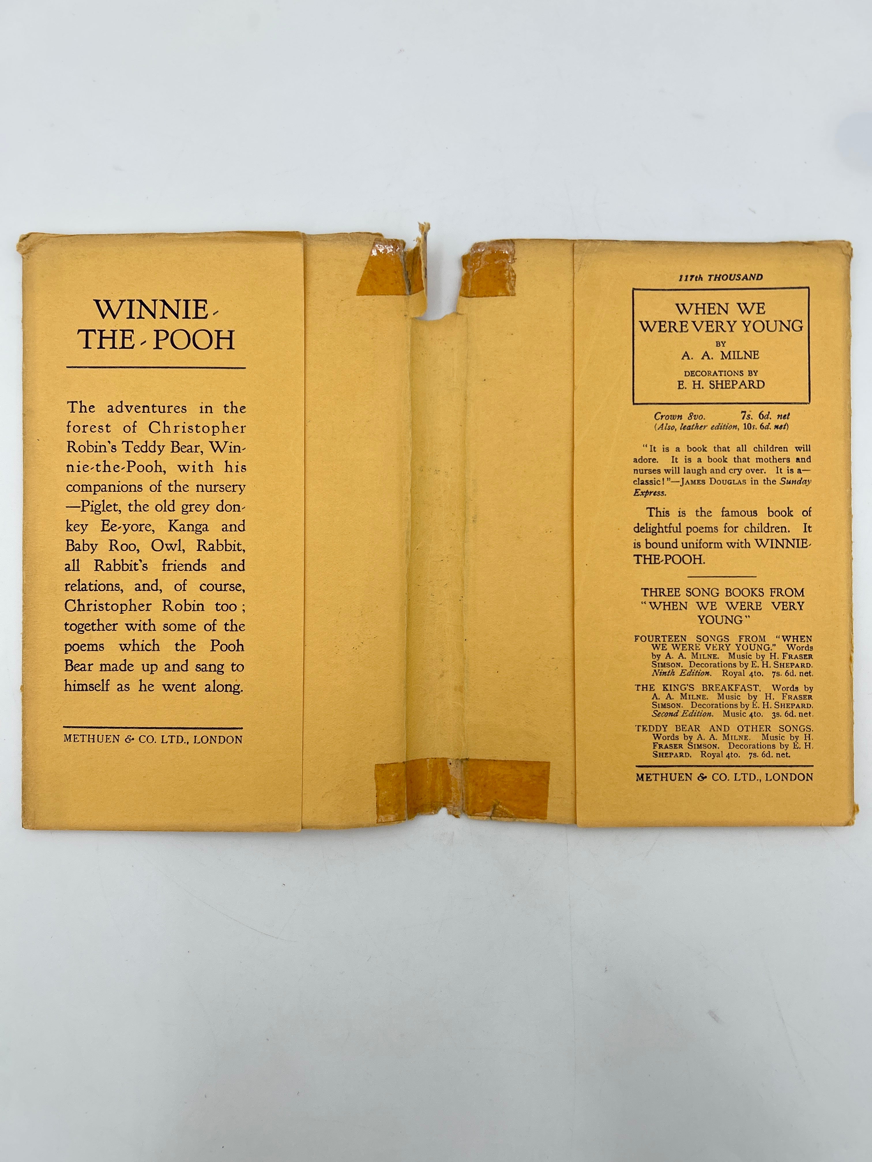 Original paper dust jacket with ‘117th Thousand When We Were Very Young’ on lower flap. Tear to title on spine but still attached with tape applied to folded corners to reinforce. Chipping to points and head and foot of spine. Good condition all things considered.