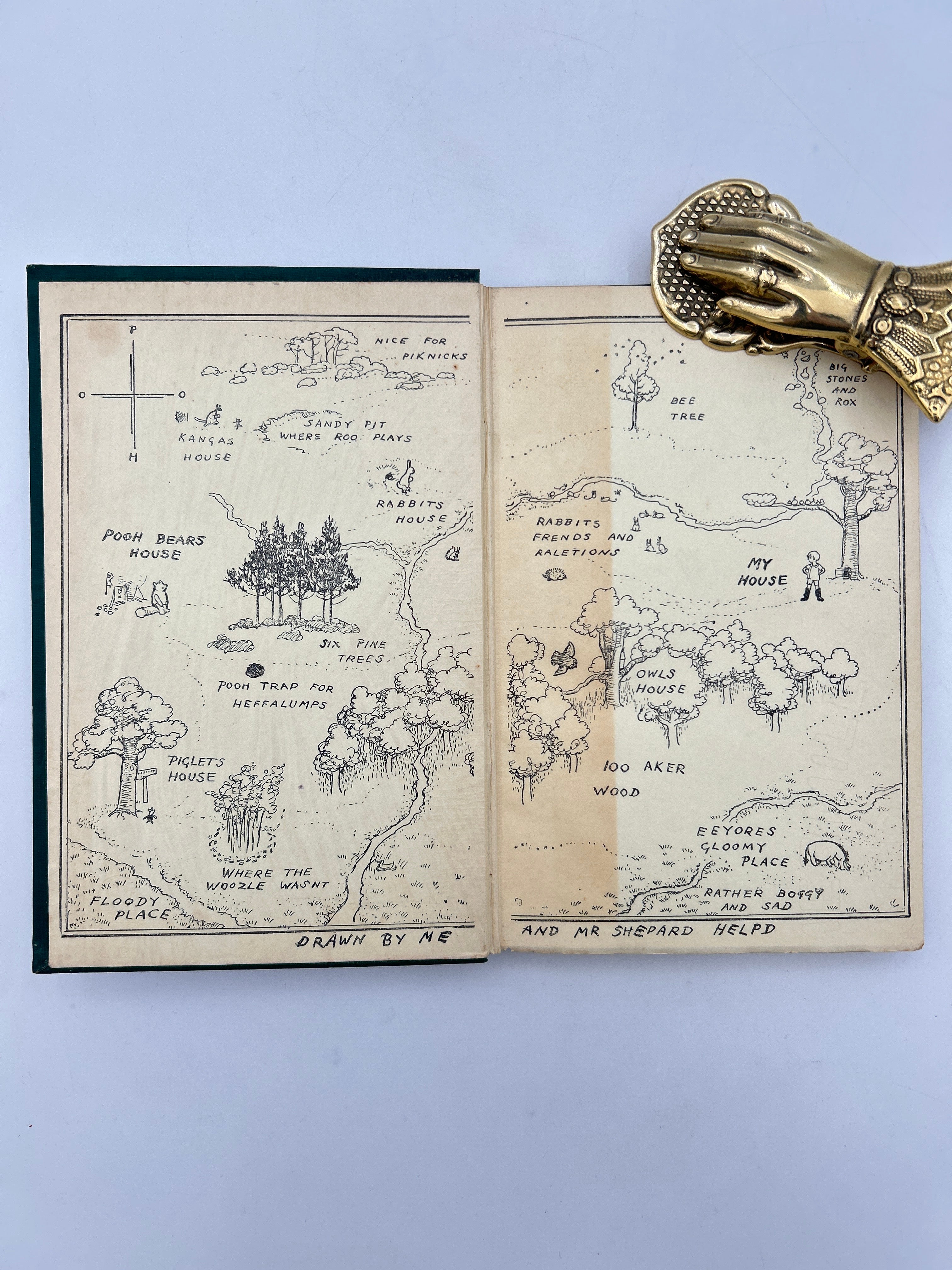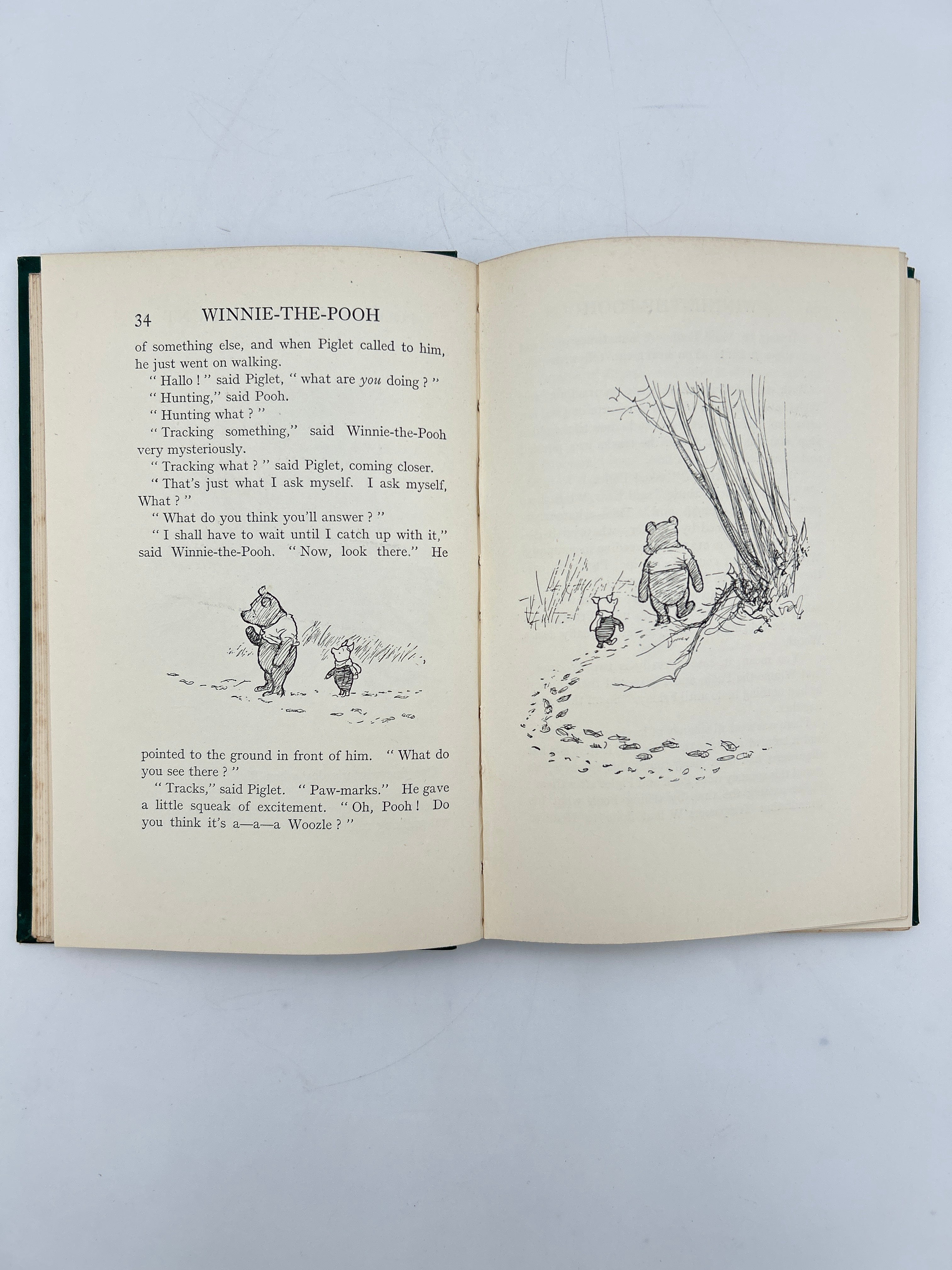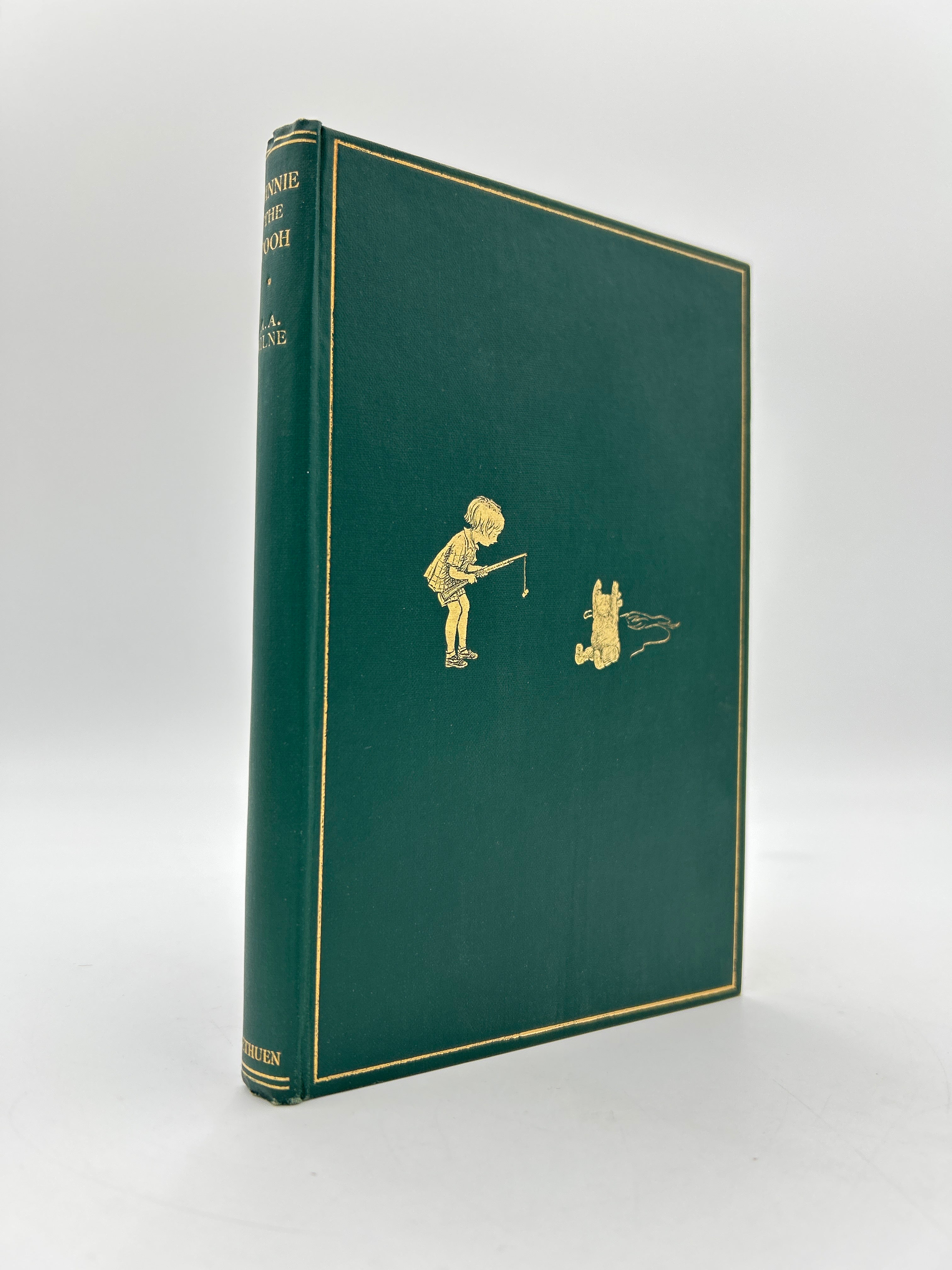 Green canvas binding with gilt illustration and borders on upper board. Map endpapers of the Hundred Acre Wood with yellowish shadow down the page. Illustrations throughout. Minimal bumping to points and edge wear to foot of spine. Very fine condition.